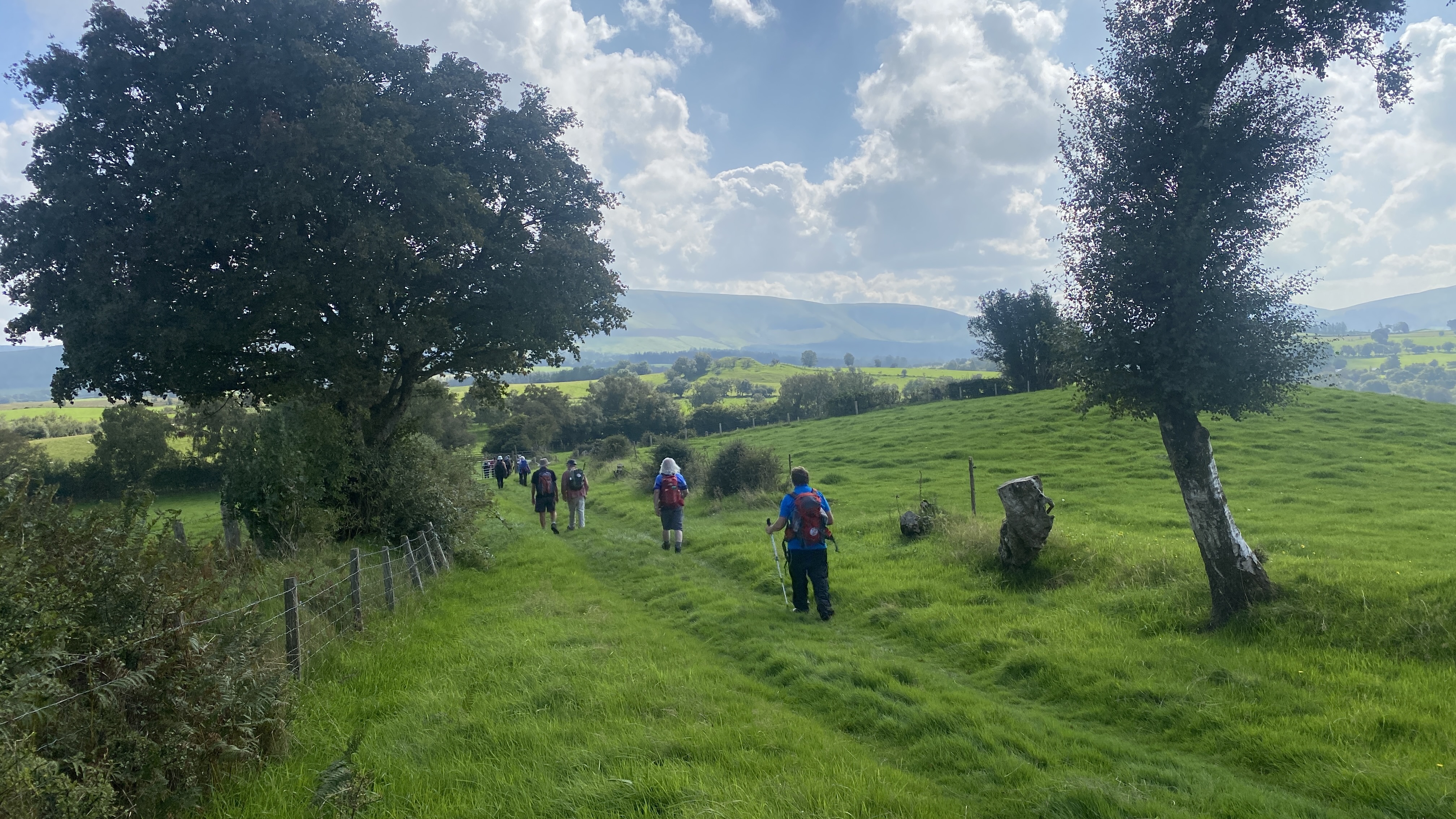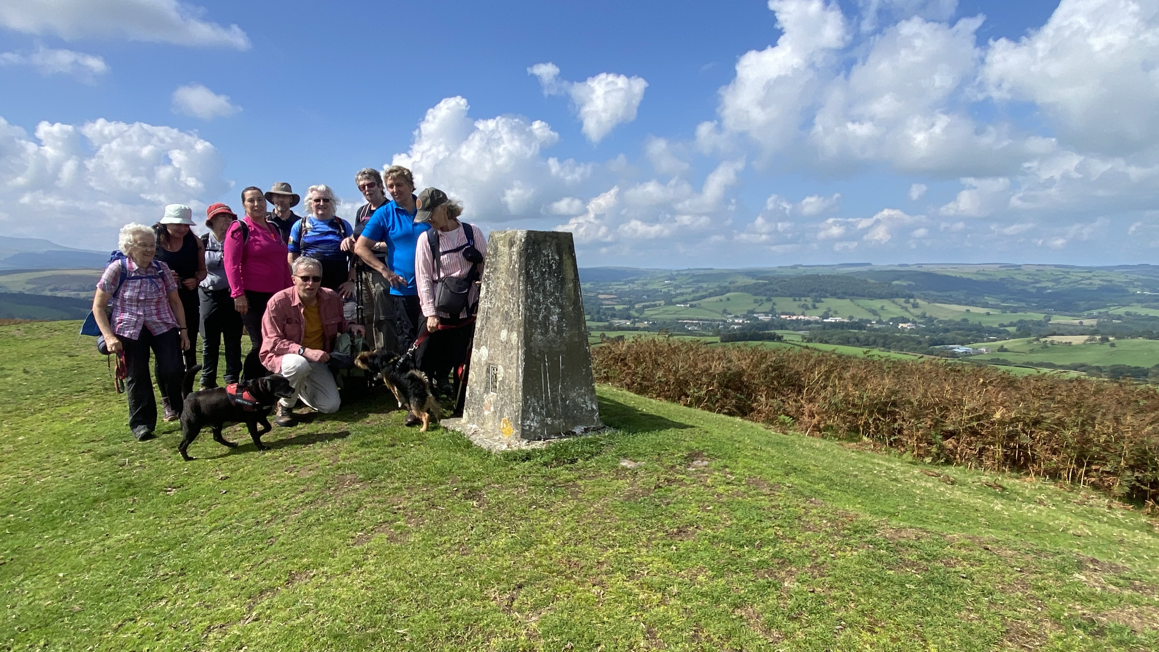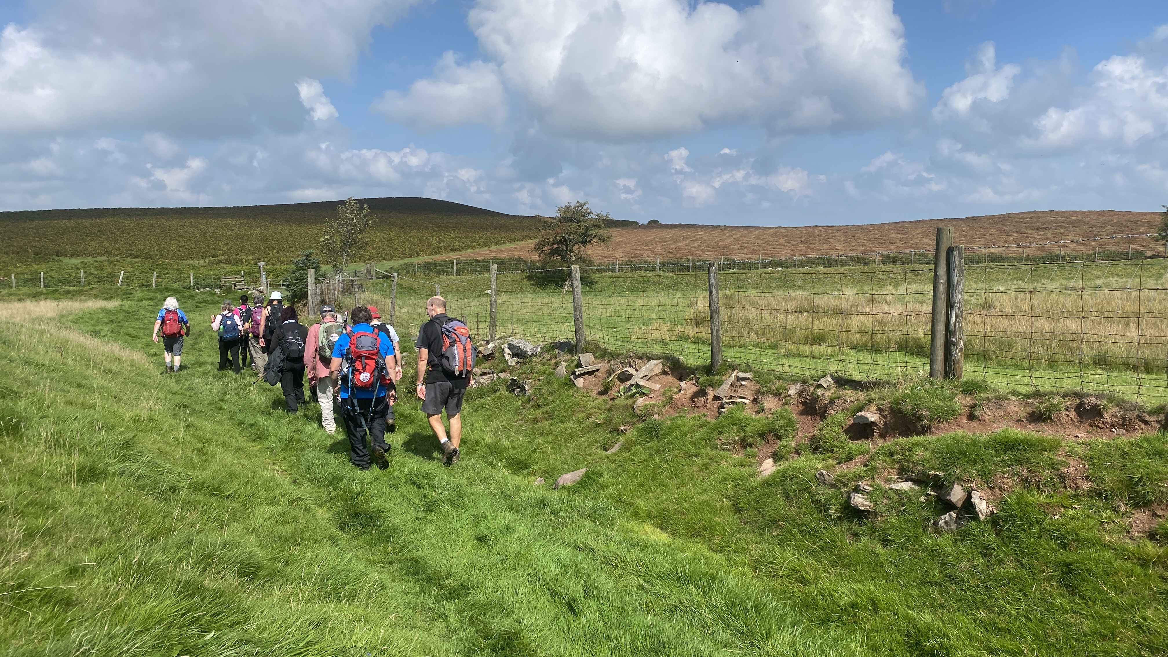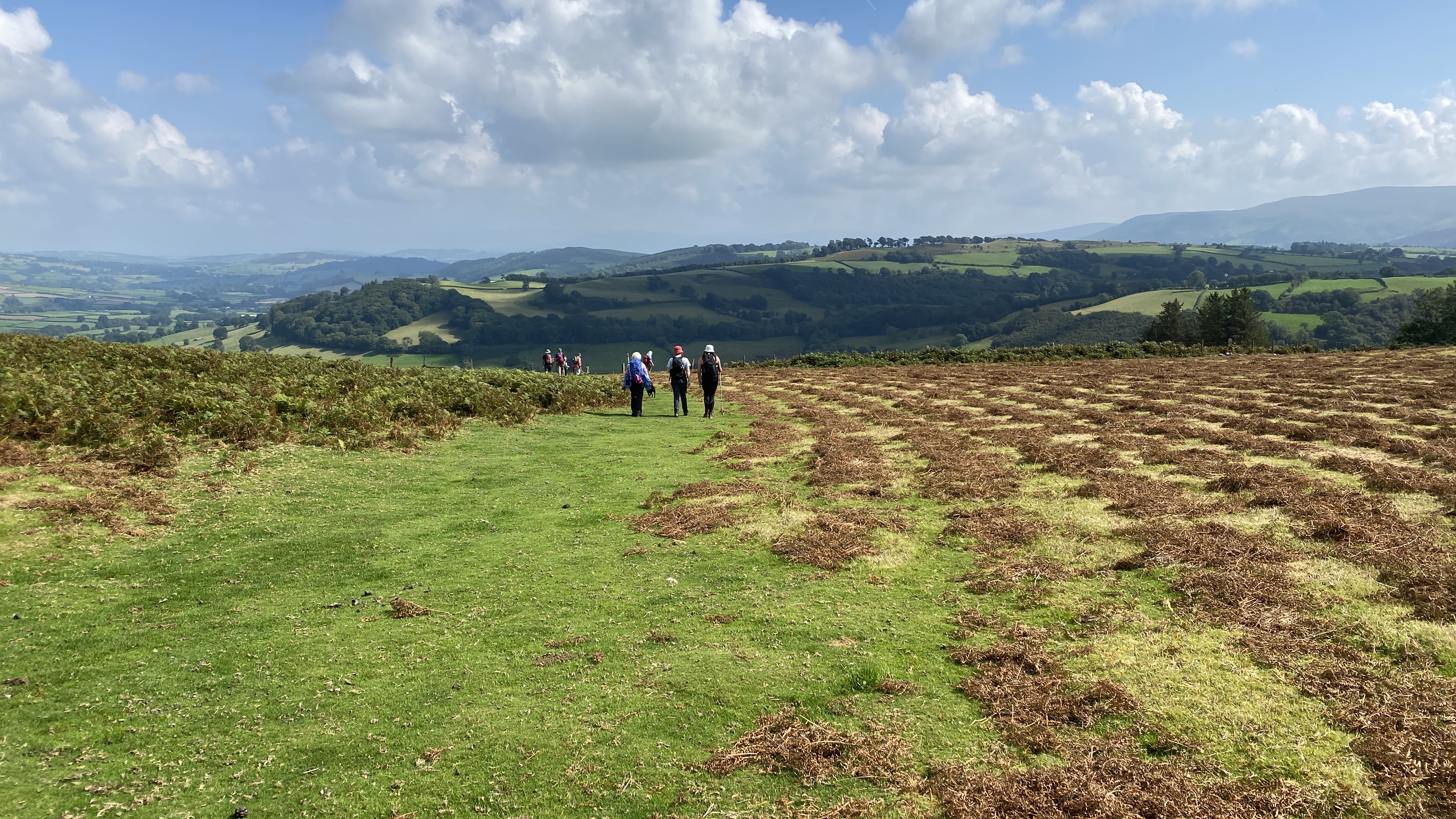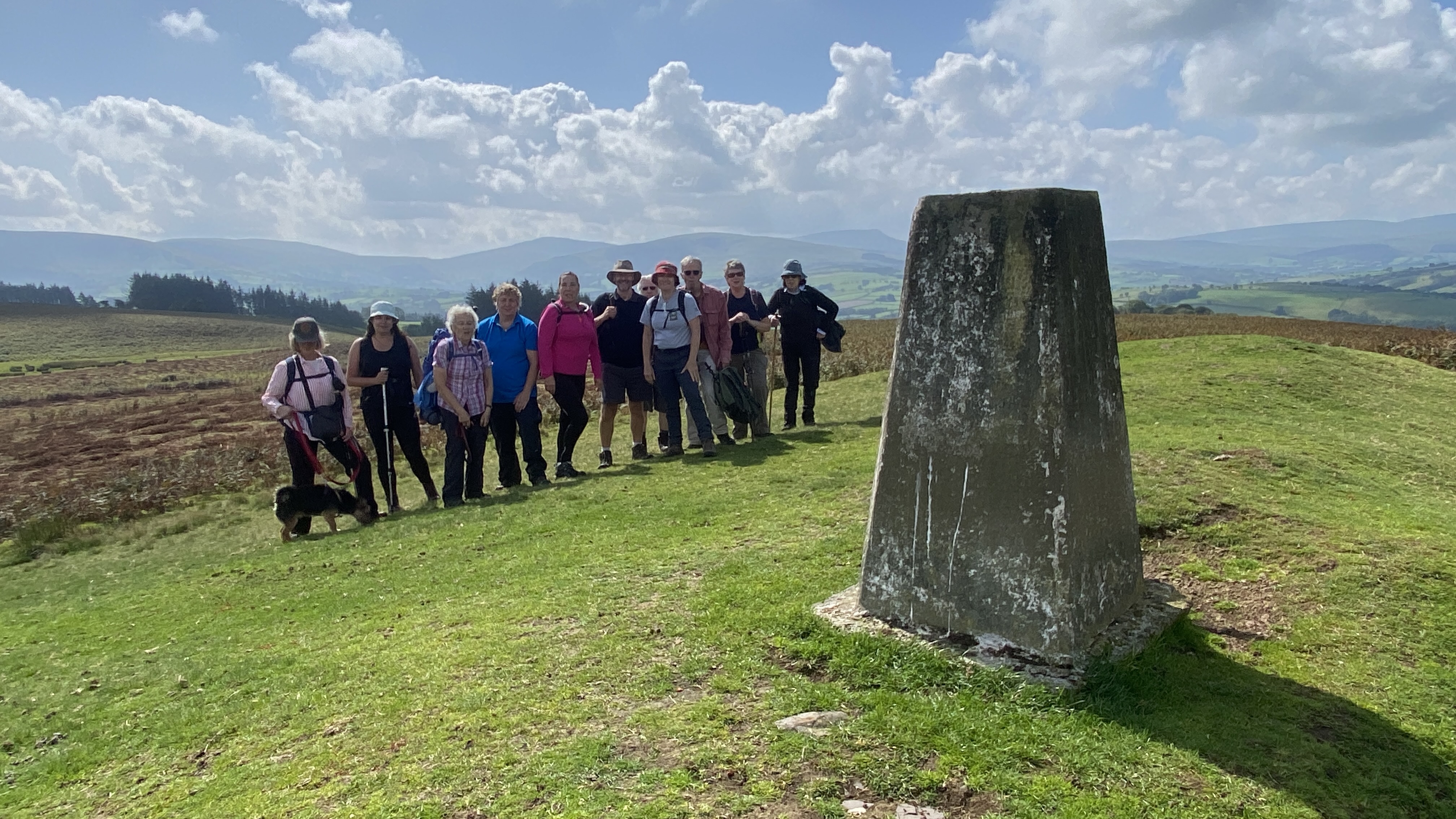 It was warm but misty start for the 12 hardy ramblers at the mountain centre today. We began our near 9 mile walk by heading Southwest then turning North through the Daudraeth Illtyd nature reserve and crossing Sarn Helen. Following the drovers road, we continued North where at Nwydd Cwmcamlais we headed west to the road. At the start of the long climb to the Cefn Llechid trig point, we had a coffee break as the sun broke through the mist and it got even warmer. We then had a straight climb past the waiting-for-harvesting bracken until we reached the trig point and luncheon. Fully refreshed, we then dropped down and crossed the Cwm Camlais then climbed again back to the drovers road that we used earlier. We then walked along the road to the standing stone and turned East back to the centre. Another superb walk with perfect views thanks to Simon and all the great company.