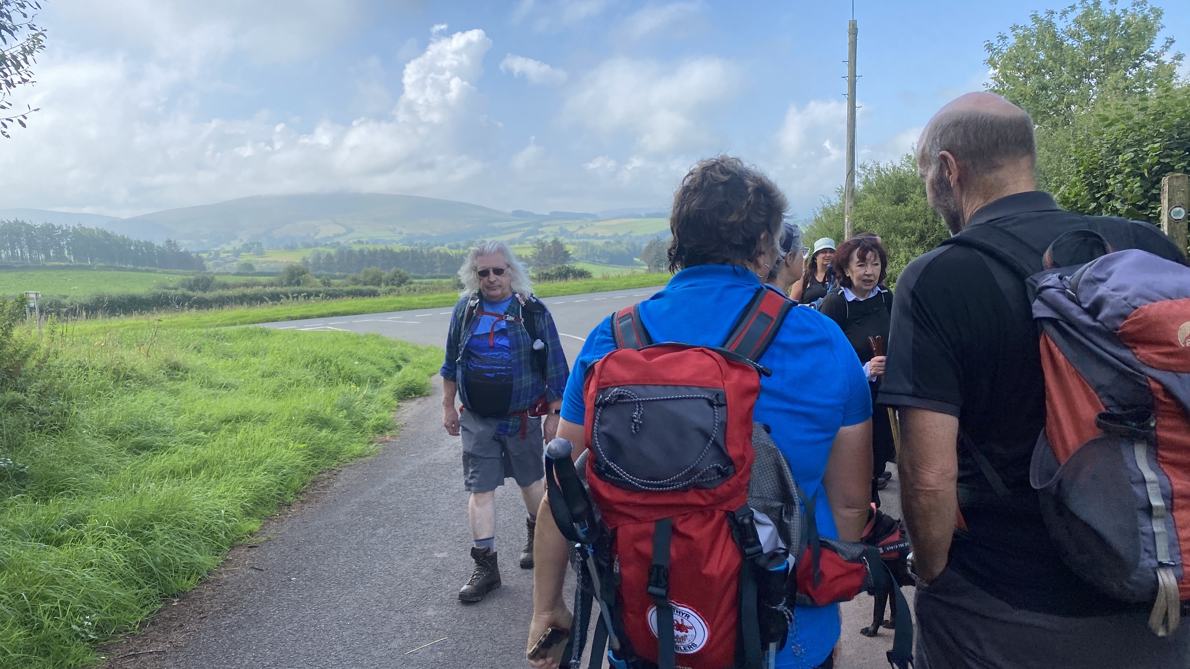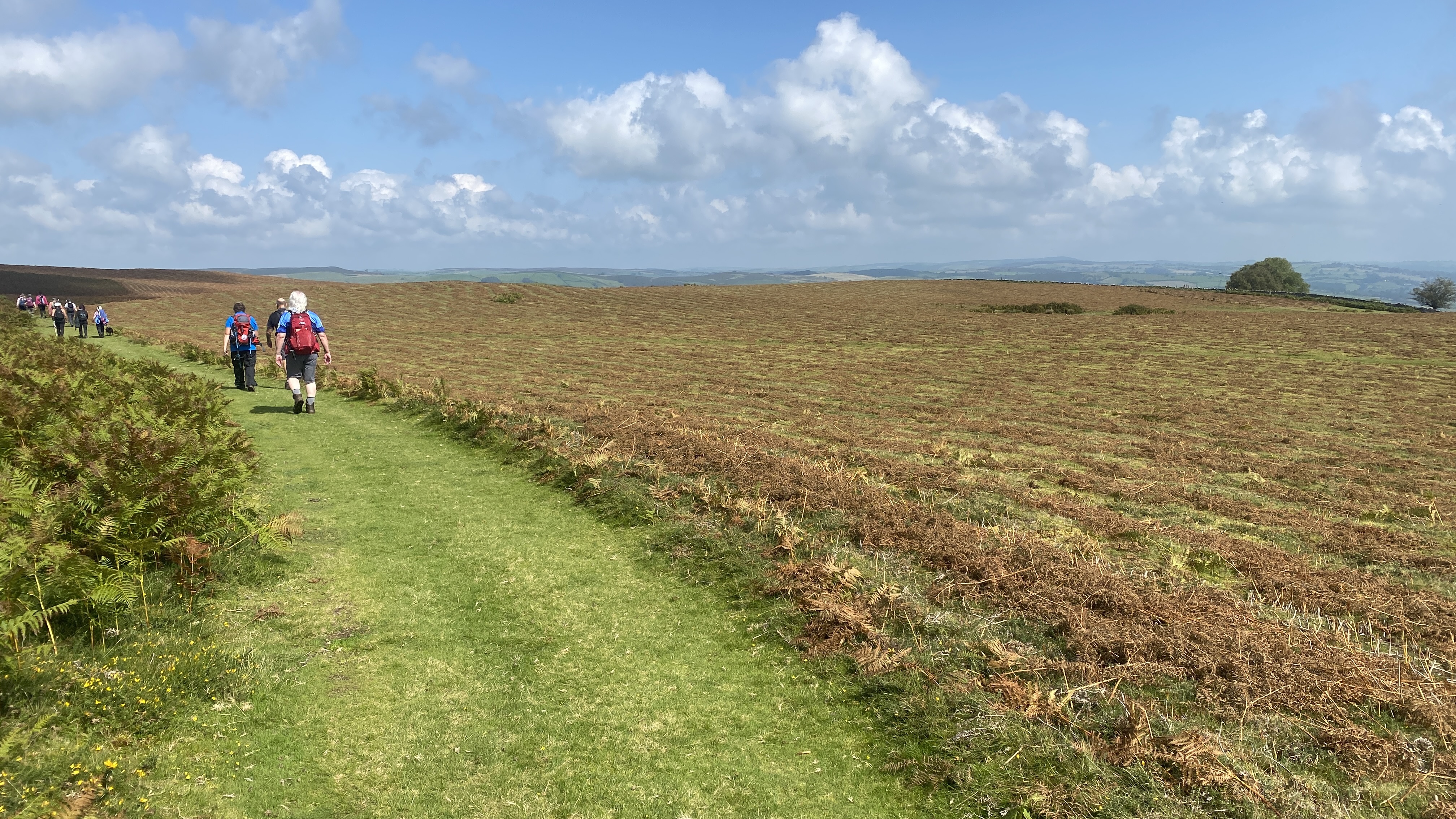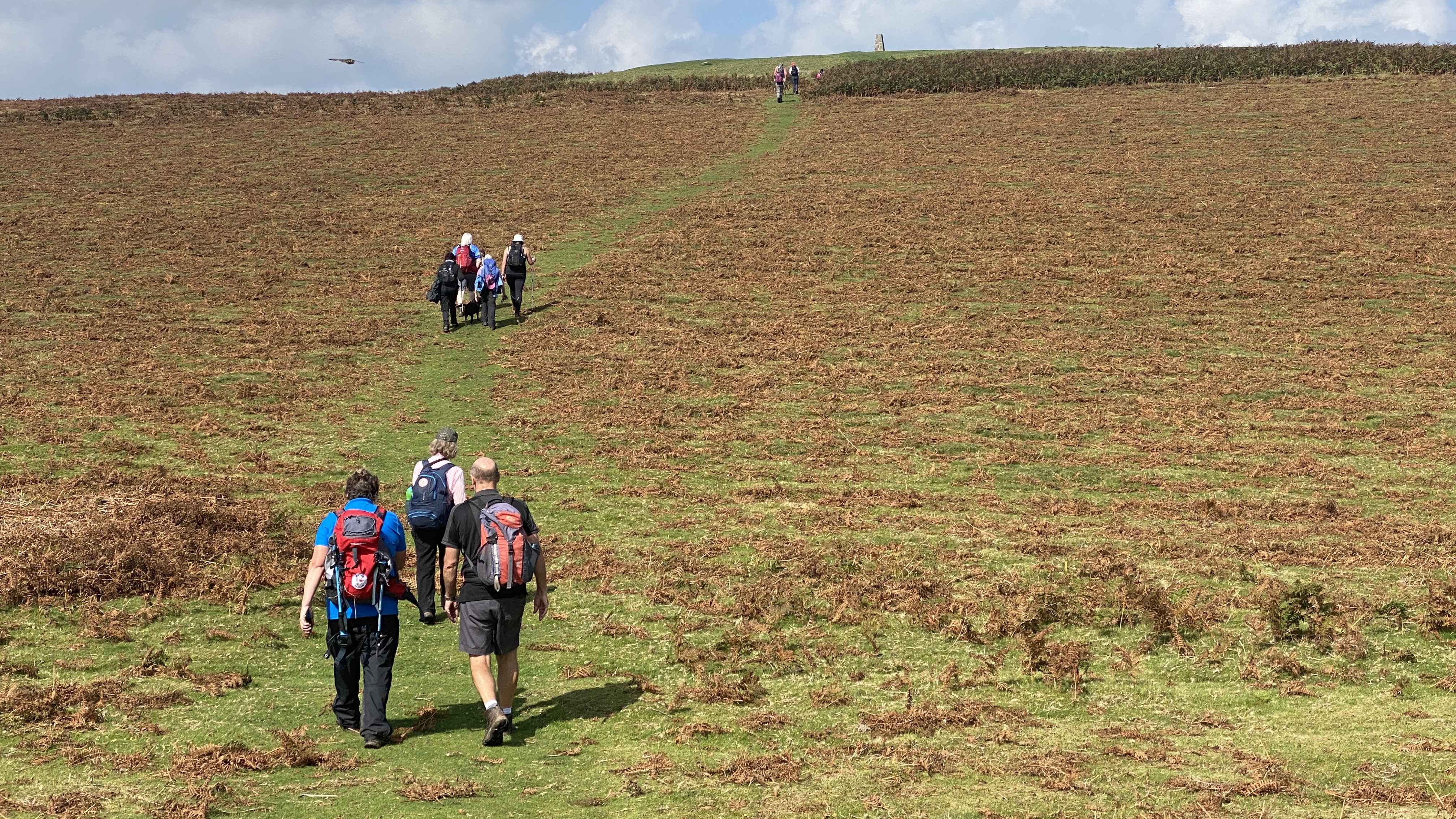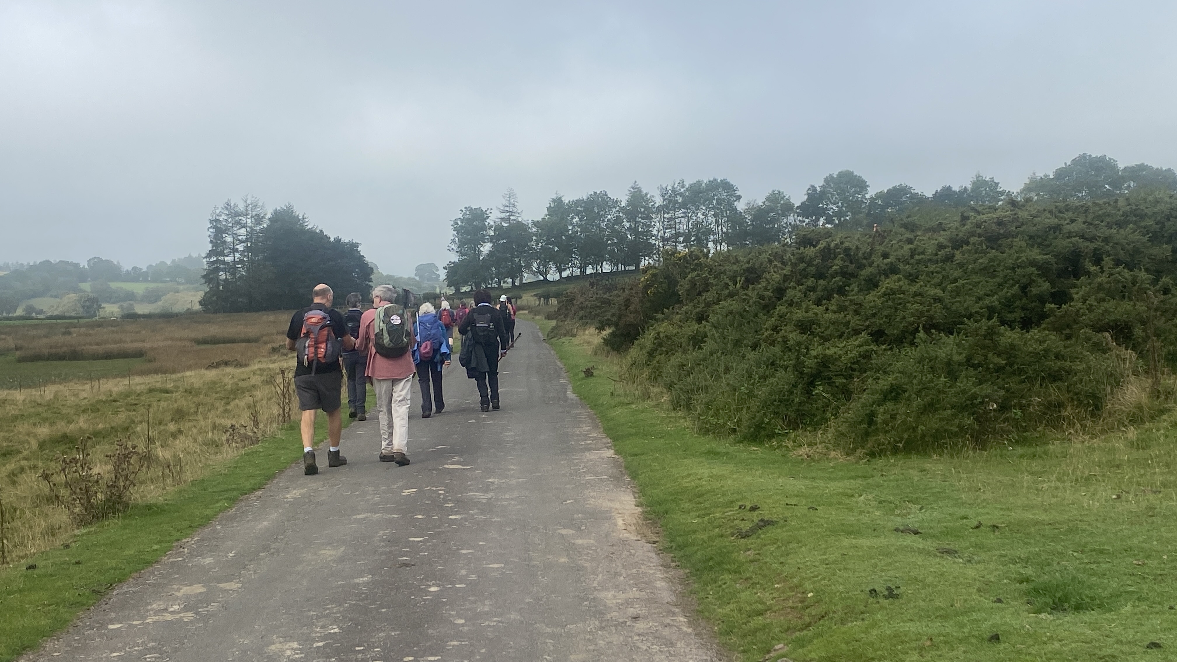 It was warm but misty start for the 12 hardy ramblers at the mountain centre today. We began our near 9 mile walk by heading Southwest then turning North through the Daudraeth Illtyd nature reserve and crossing Sarn Helen. Following the drovers road, we continued North where at Nwydd Cwmcamlais we headed west to the road. At the start of the long climb to the Cefn Llechid trig point, we had a coffee break as the sun broke through the mist and it got even warmer. We then had a straight climb past the waiting-for-harvesting bracken until we reached the trig point and luncheon. Fully refreshed, we then dropped down and crossed the Cwm Camlais then climbed again back to the drovers road that we used earlier. We then walked along the road to the standing stone and turned East back to the centre. Another superb walk with perfect views thanks to Simon and all the great company.