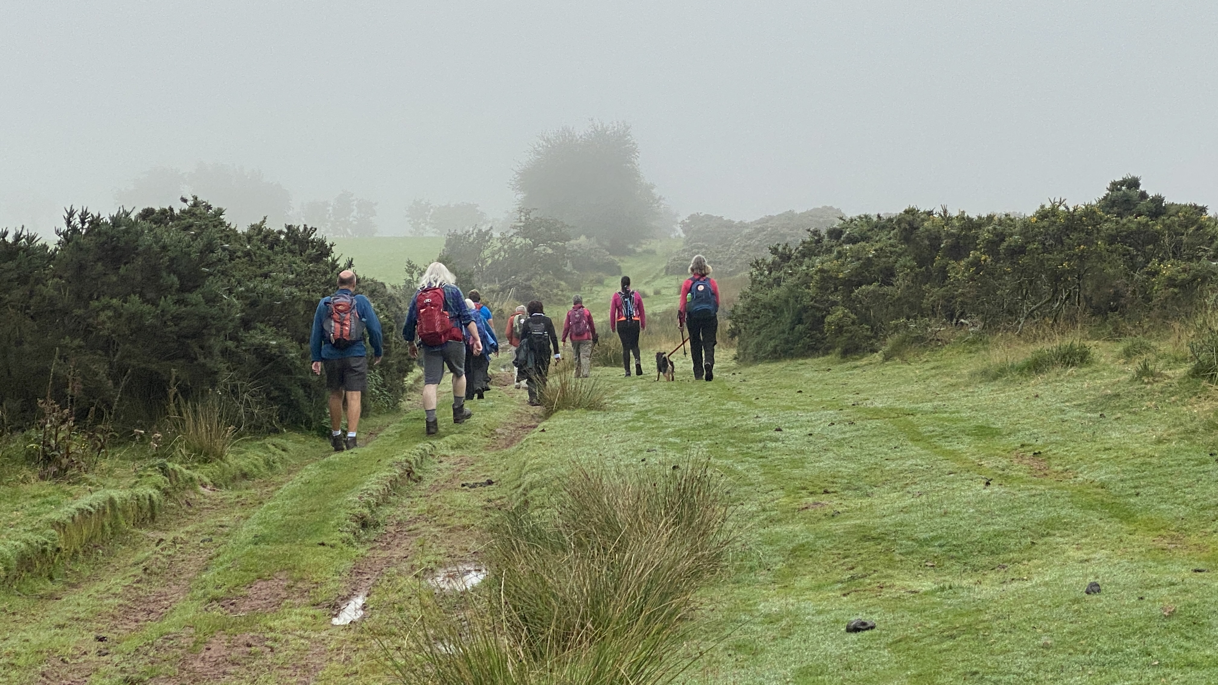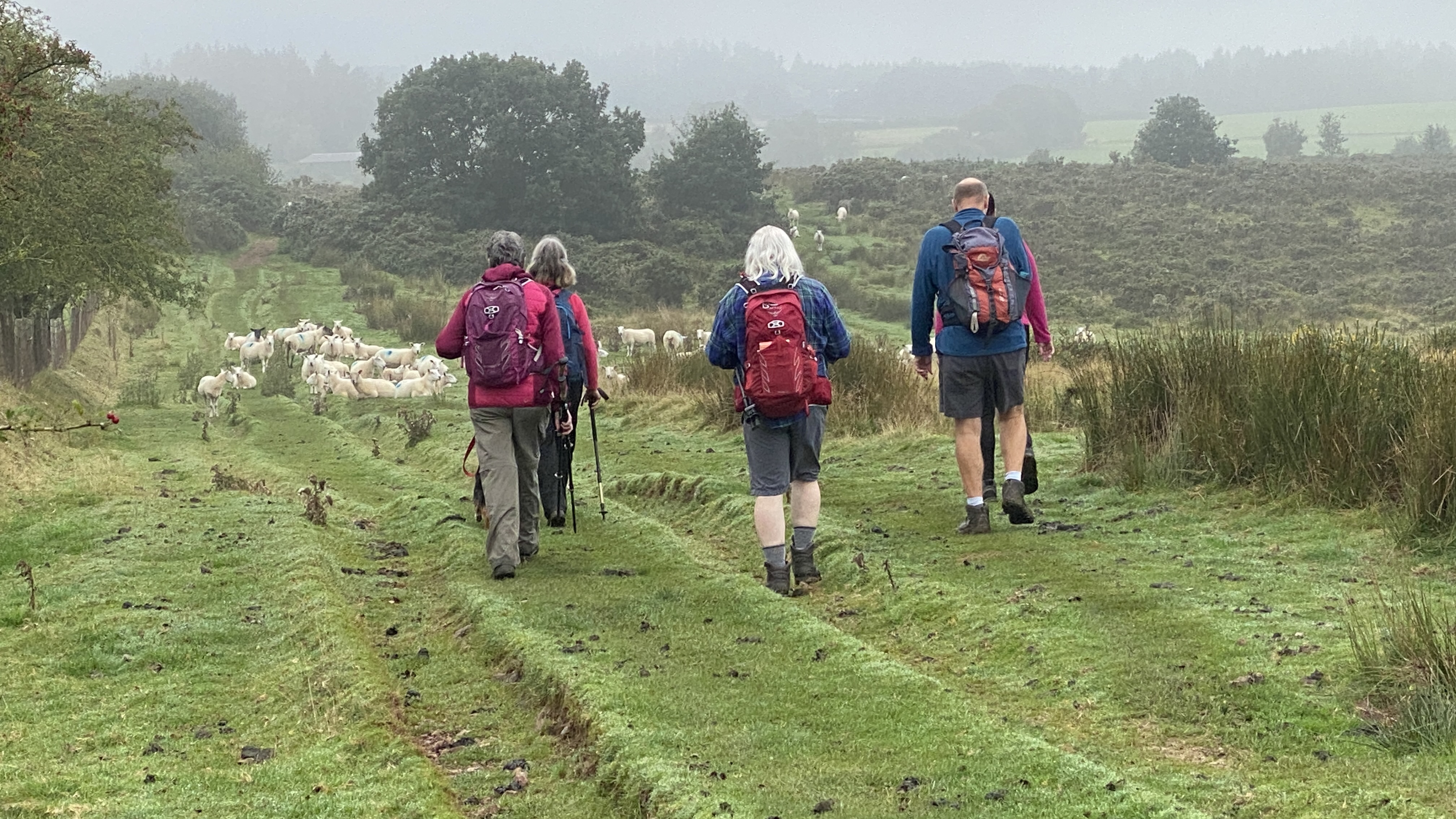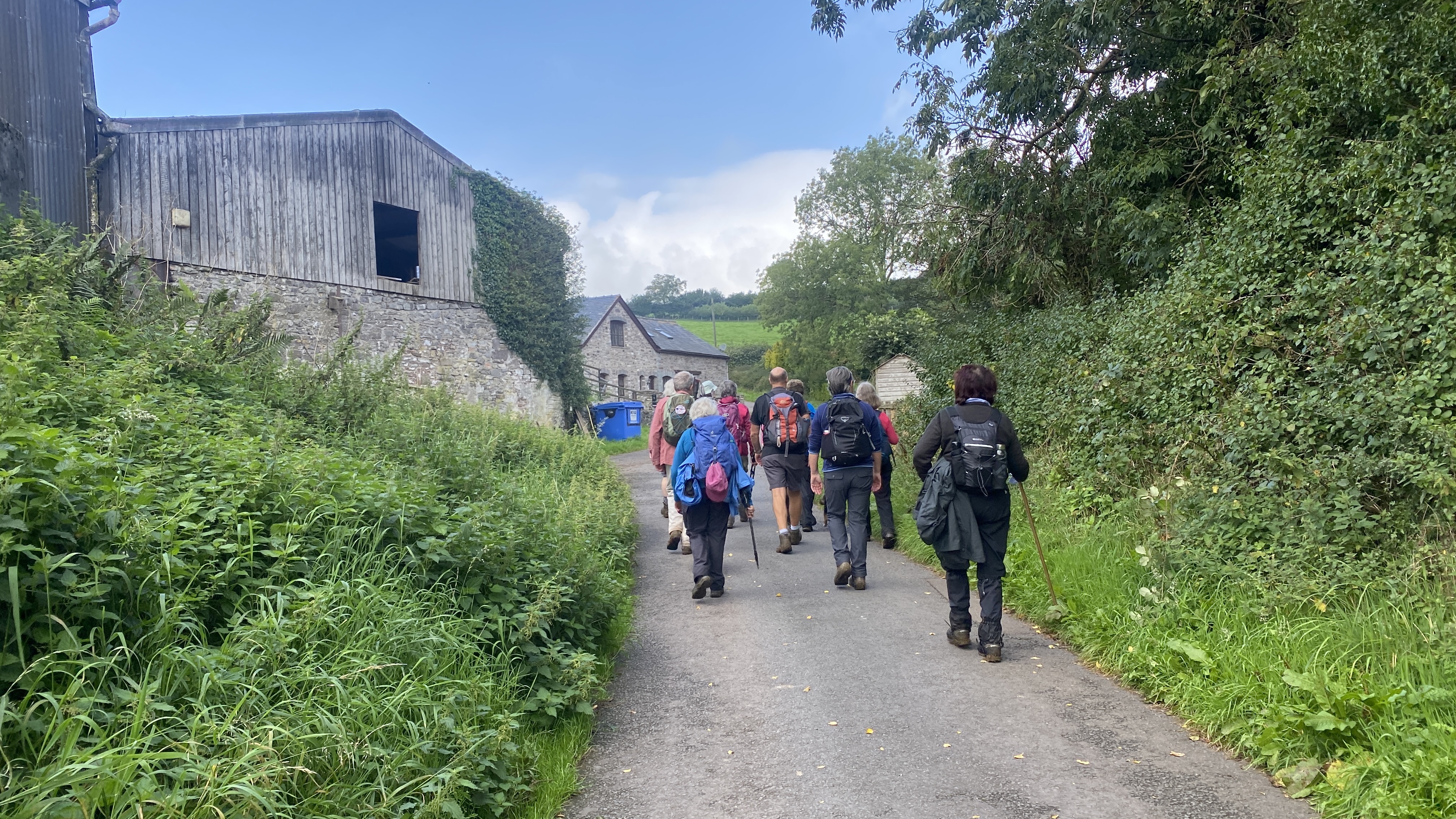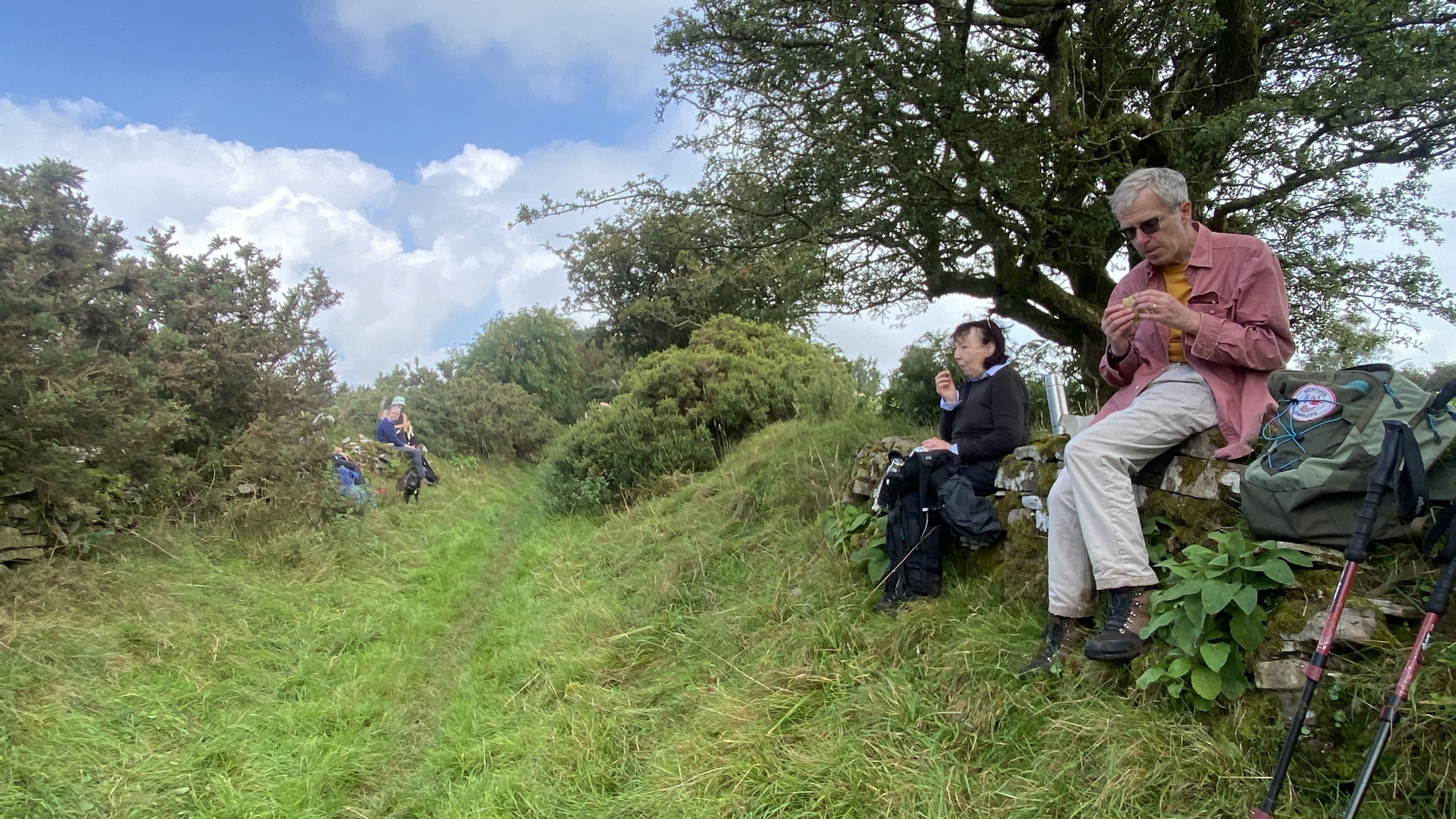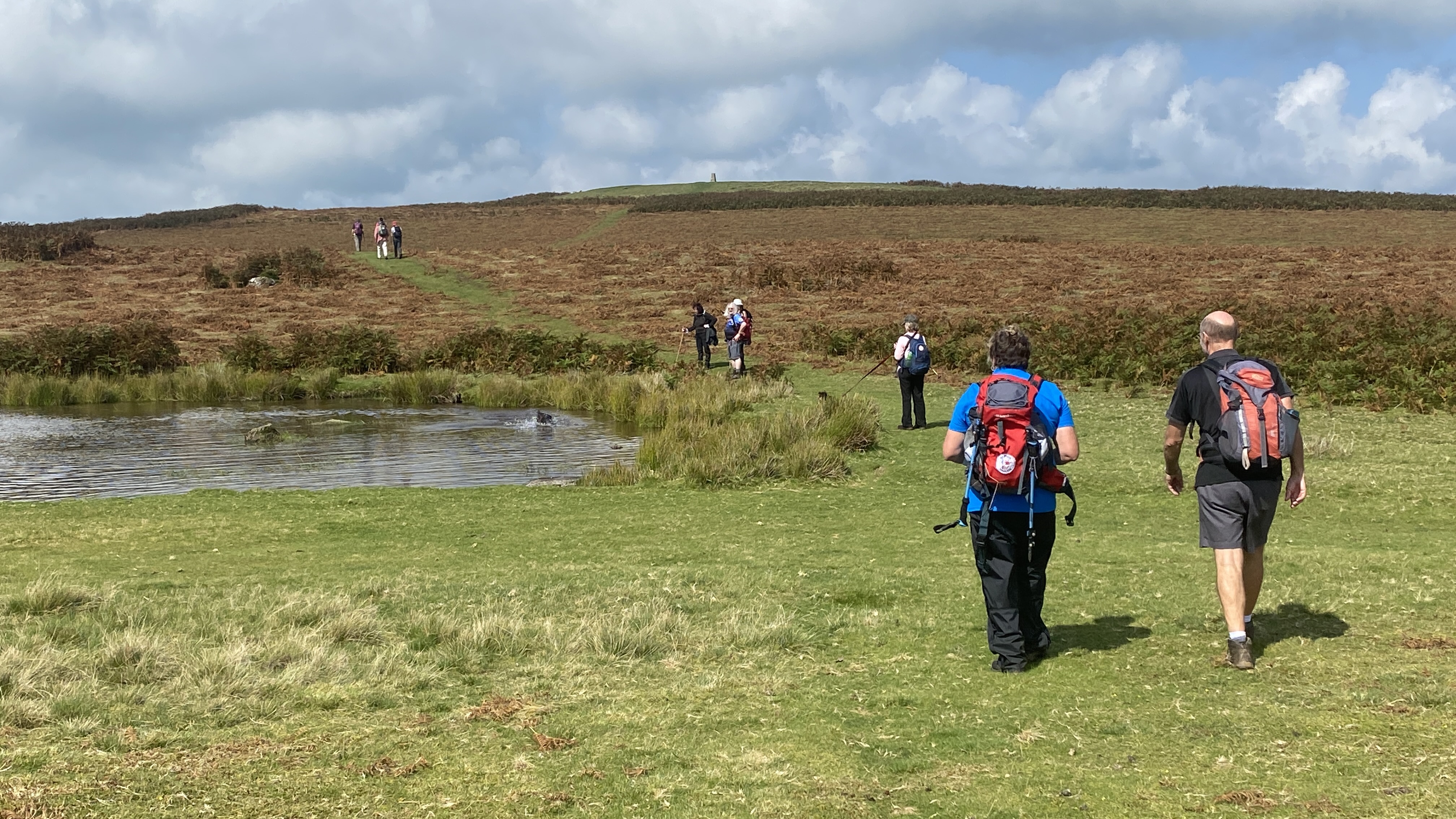 It was warm but misty start for the 12 hardy ramblers at the mountain centre today. We began our near 9 mile walk by heading Southwest then turning North through the Daudraeth Illtyd nature reserve and crossing Sarn Helen. Following the drovers road, we continued North where at Nwydd Cwmcamlais we headed west to the road. At the start of the long climb to the Cefn Llechid trig point, we had a coffee break as the sun broke through the mist and it got even warmer. We then had a straight climb past the waiting-for-harvesting bracken until we reached the trig point and luncheon. Fully refreshed, we then dropped down and crossed the Cwm Camlais then climbed again back to the drovers road that we used earlier. We then walked along the road to the standing stone and turned East back to the centre. Another superb walk with perfect views thanks to Simon and all the great company.