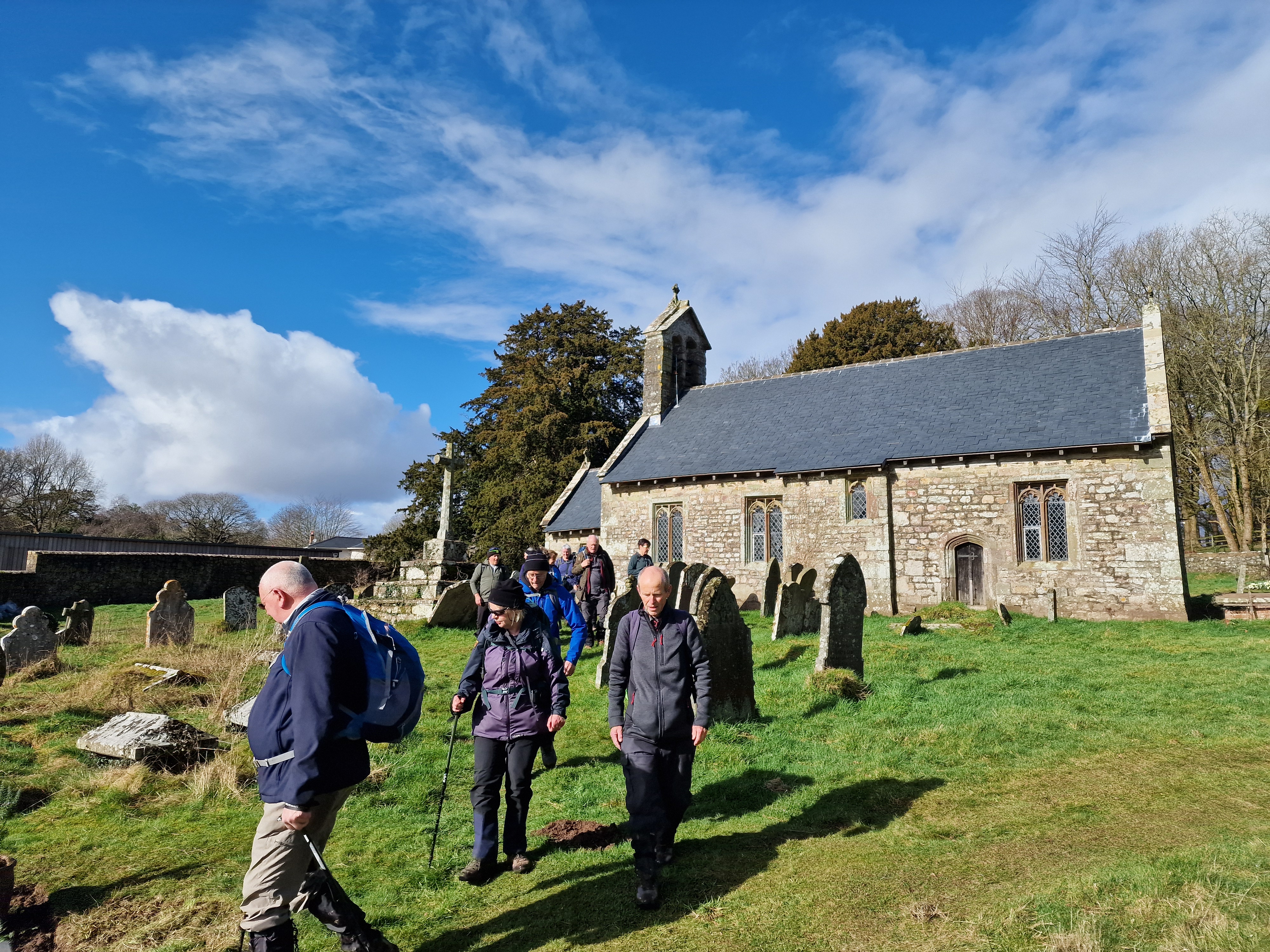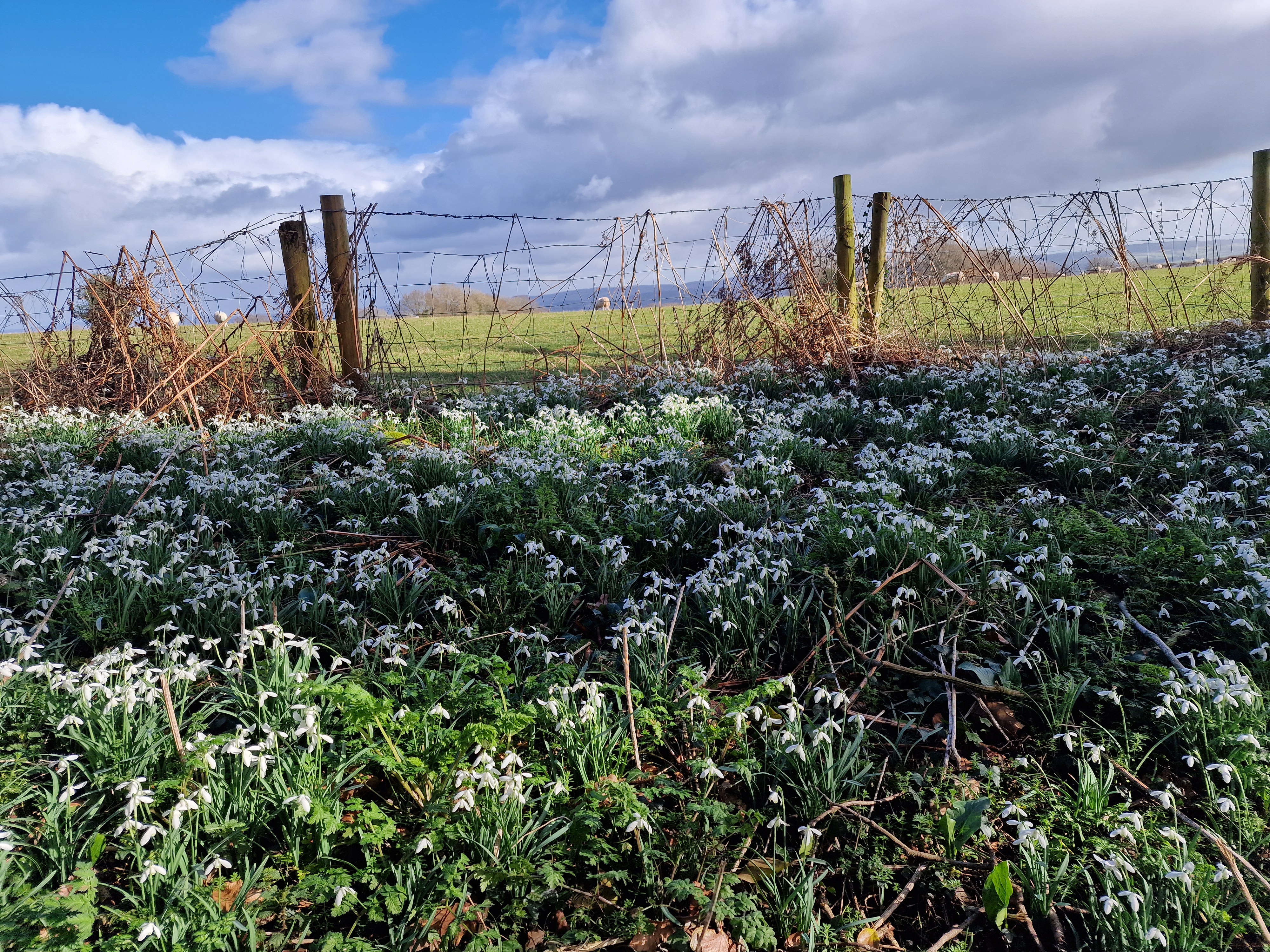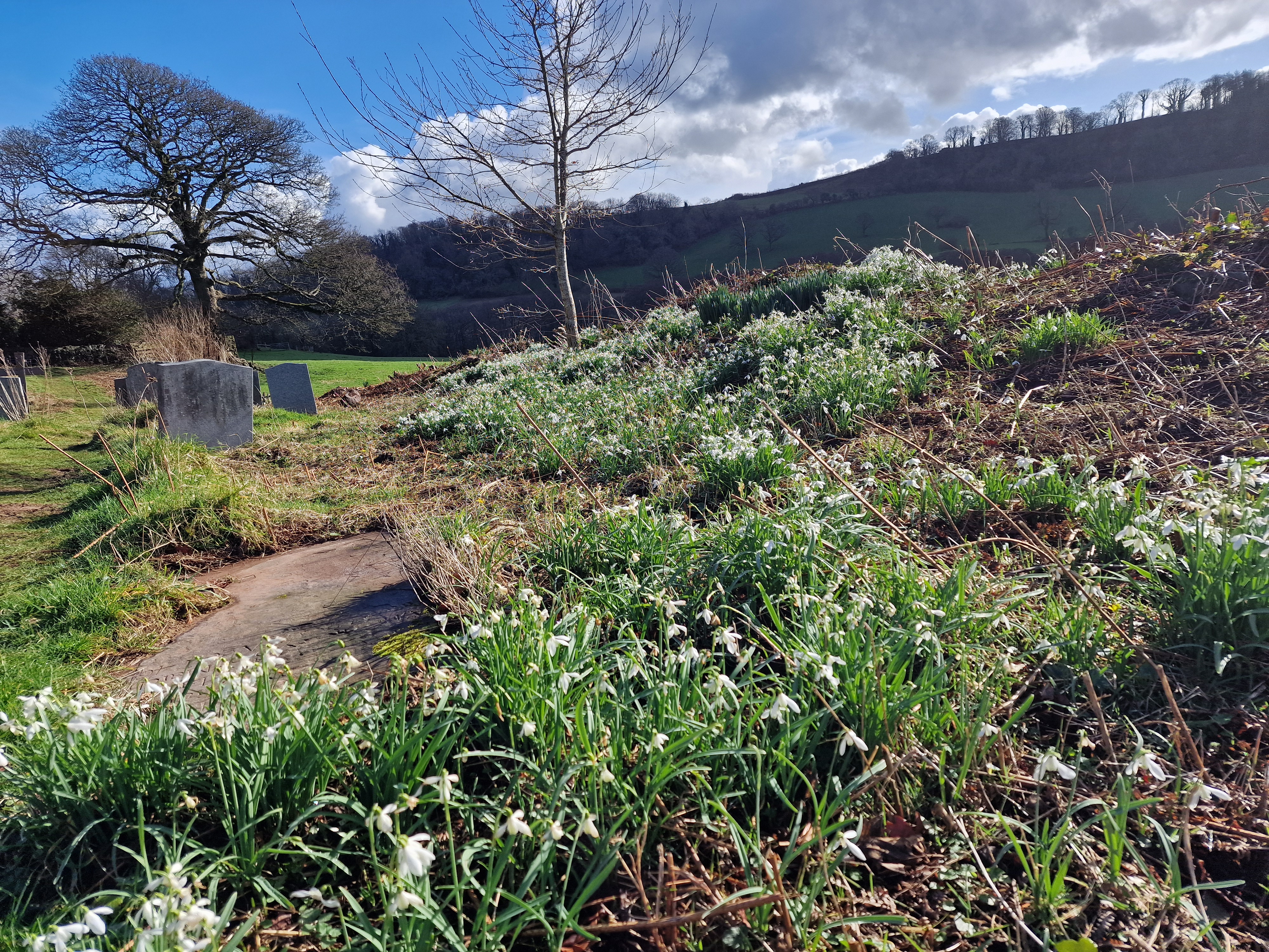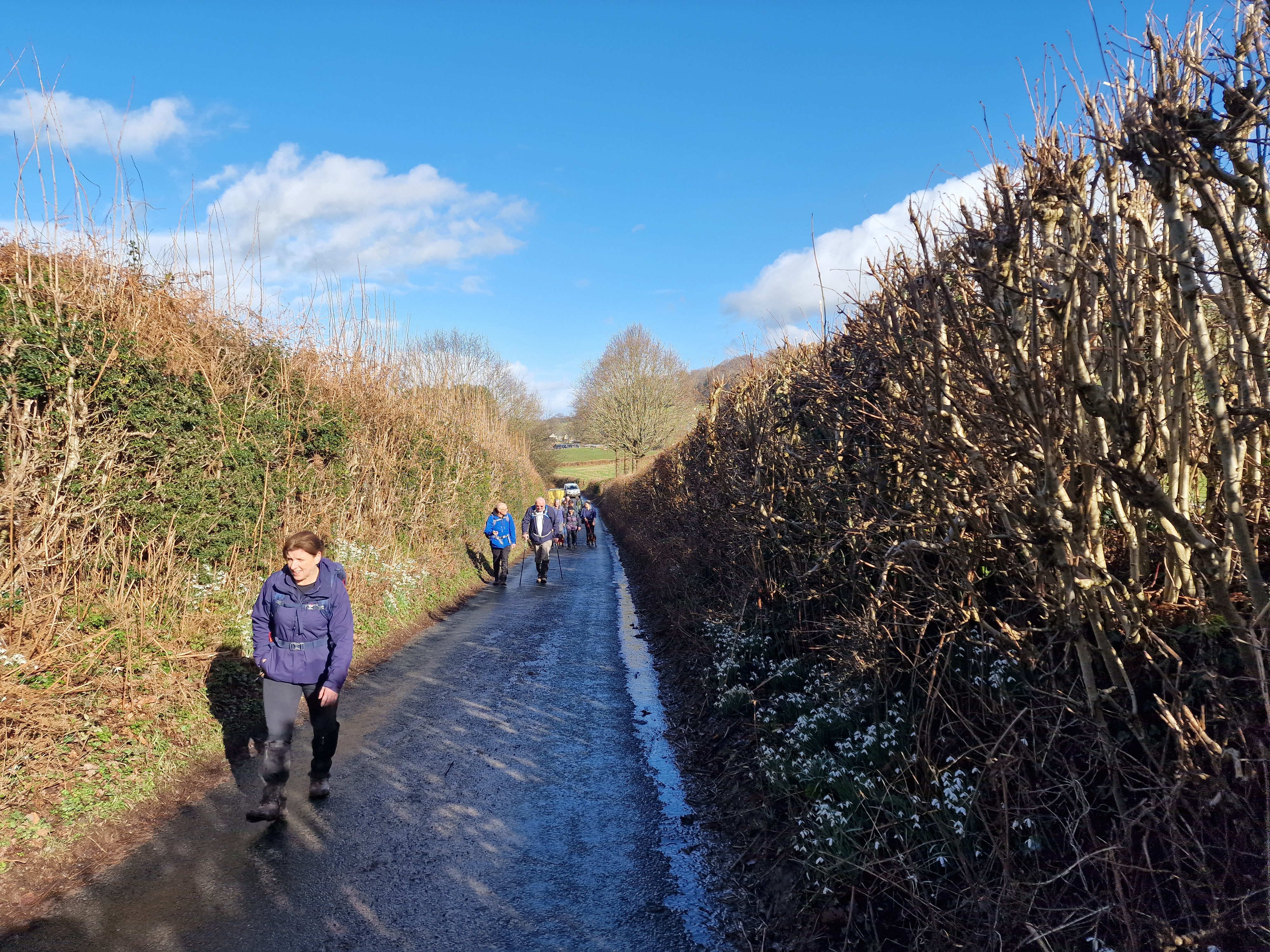 13 of us, including our lovely guests Caroline and Martin, enjoyed a fantastic 9-mile circular walk titled "Clytha Snowdrop Walk." The weather was bright and dry as we set off from the free National Trust car park at Clytha towards the banks of the River Usk. We headed south downstream as far as we could (erosion has closed a section of riverbank) before making our way up to the lane. Following the lane southward, we reached the charming village of Bettws Newydd. Here, we visited the historic church and its magnificent Yew tree, which is believed to be over 1,000 years old! The church itself dates back to the 13th century and has been a place of worship for centuries. After a refreshing tea break and our first glimpse of this season's snowdrops, we continued our journey. Our path took us northward through fields before picking up the lane to Coed y Bwynydd Hill Fort. This Iron Age hill fort, dating back to around 800 BC, offered us a glimpse into ancient history with its impressive earthworks. After a brief rest and wander around the hill fort, we continued north to the top of Clytha Hill, where we were treated to a stunning carpet of snowdrops. We then made our way downhill to Hillgrove and our lunch spot at Clytha Castle. Built in the late 18th century, Clytha Castle is a picturesque folly with spectacular views of the Sugar Loaf and Skirrid as a backdrop. On our homeward stretch, we passed through fields and woodland, enjoying the sun and dry weather. However, the ground underfoot was a different story, with mud and boggy patches keeping us on our toes! We soon found ourselves back on the banks of the Usk, north of the car park, where we concluded our walk. A big thank you to everyone who came and made the day special!