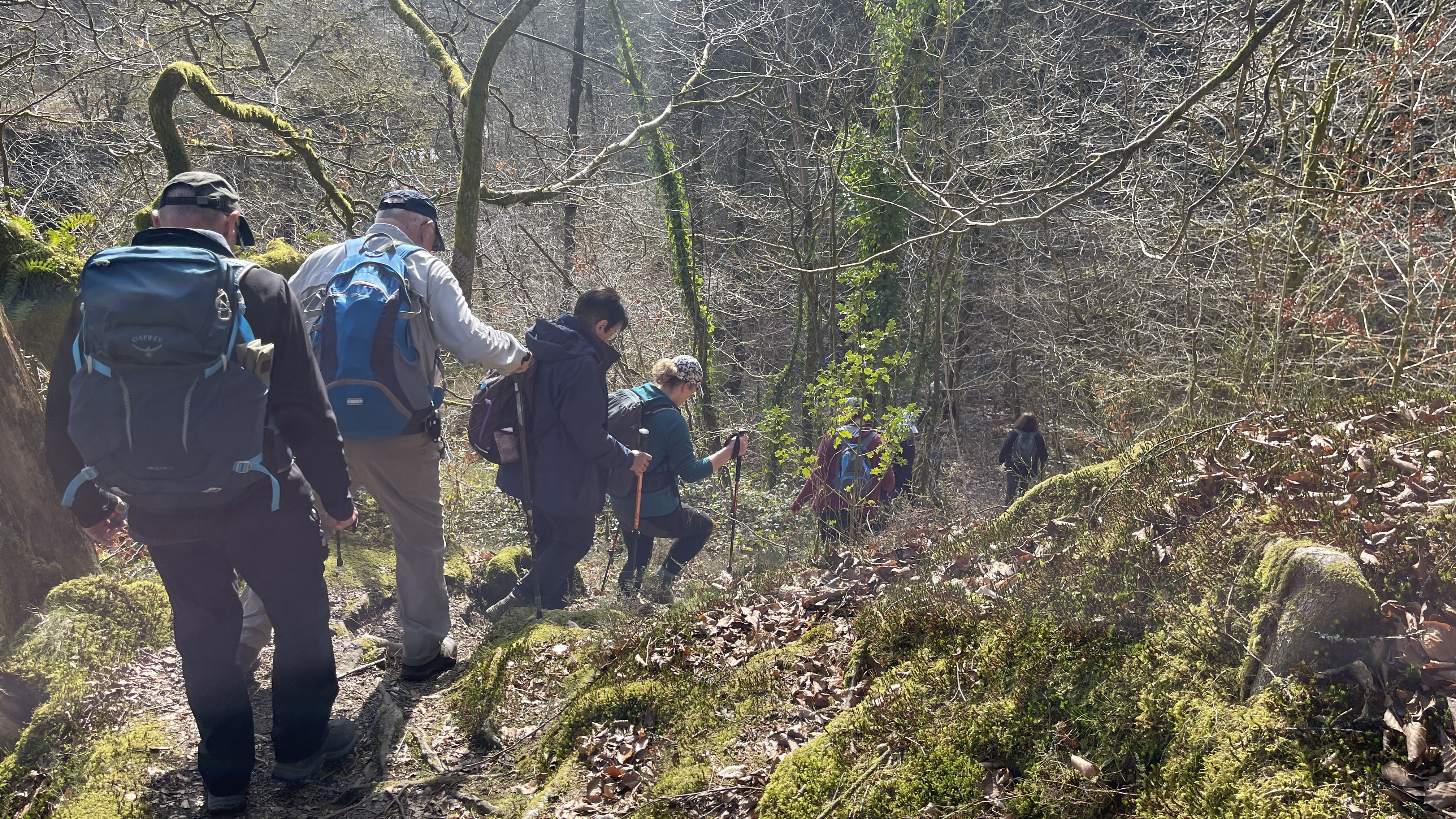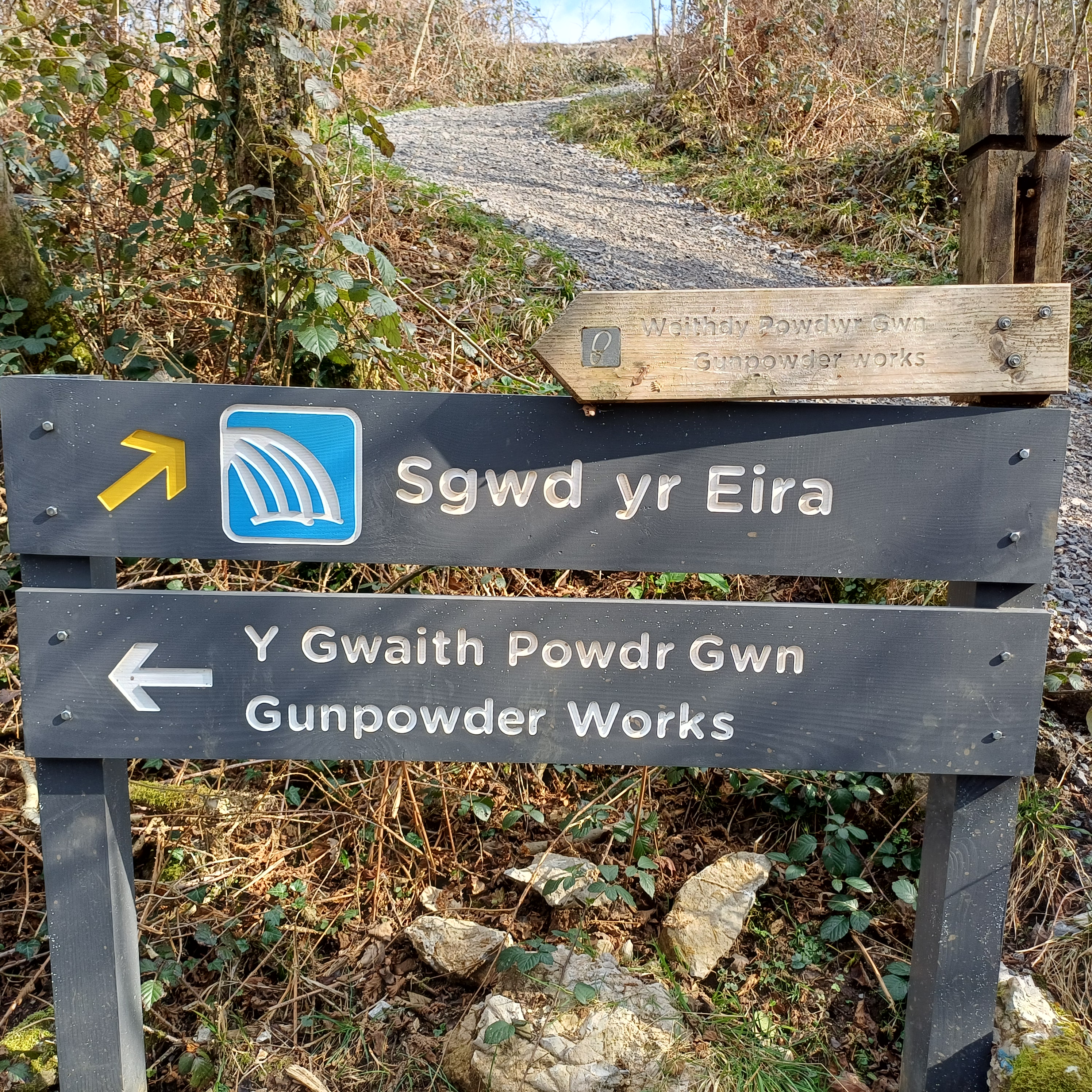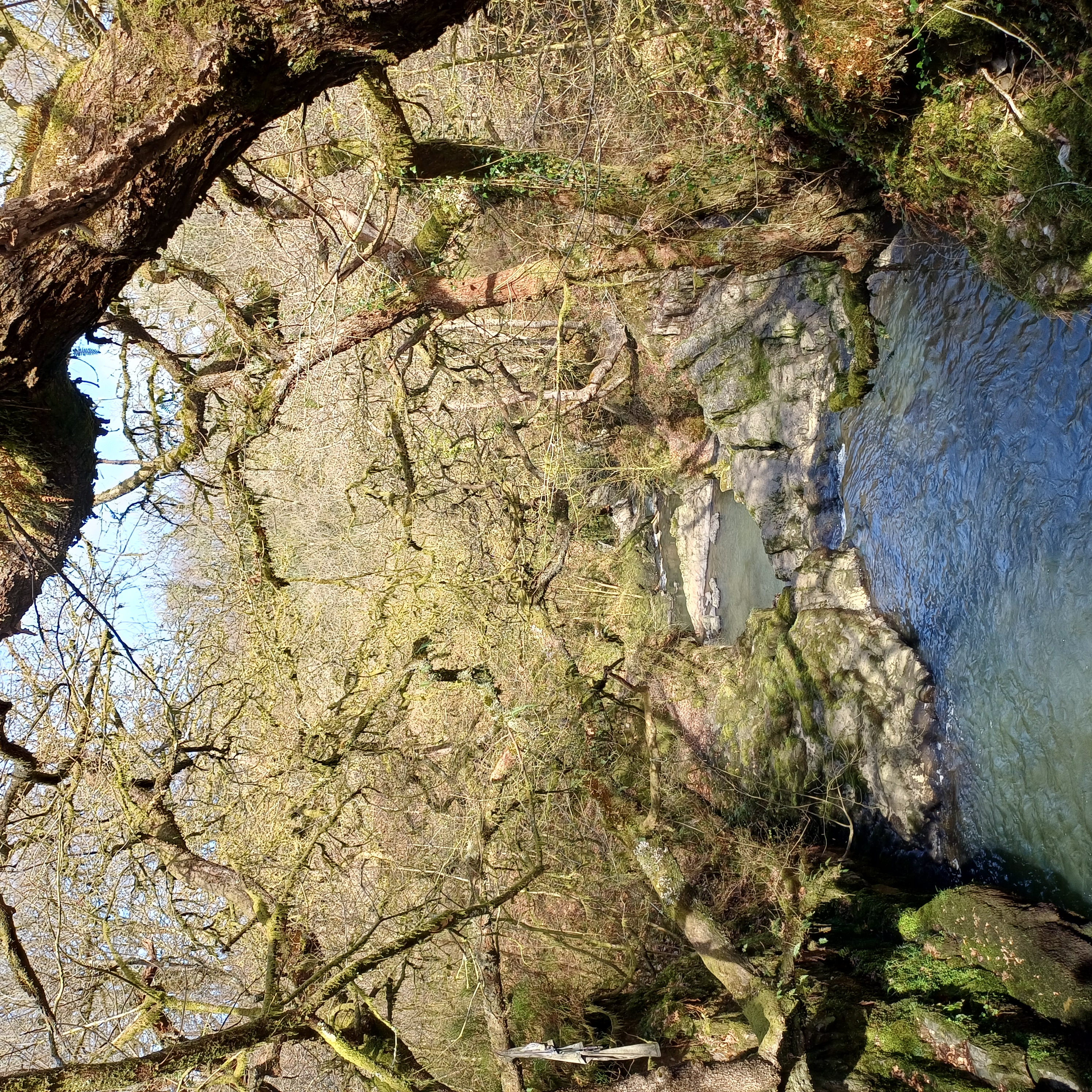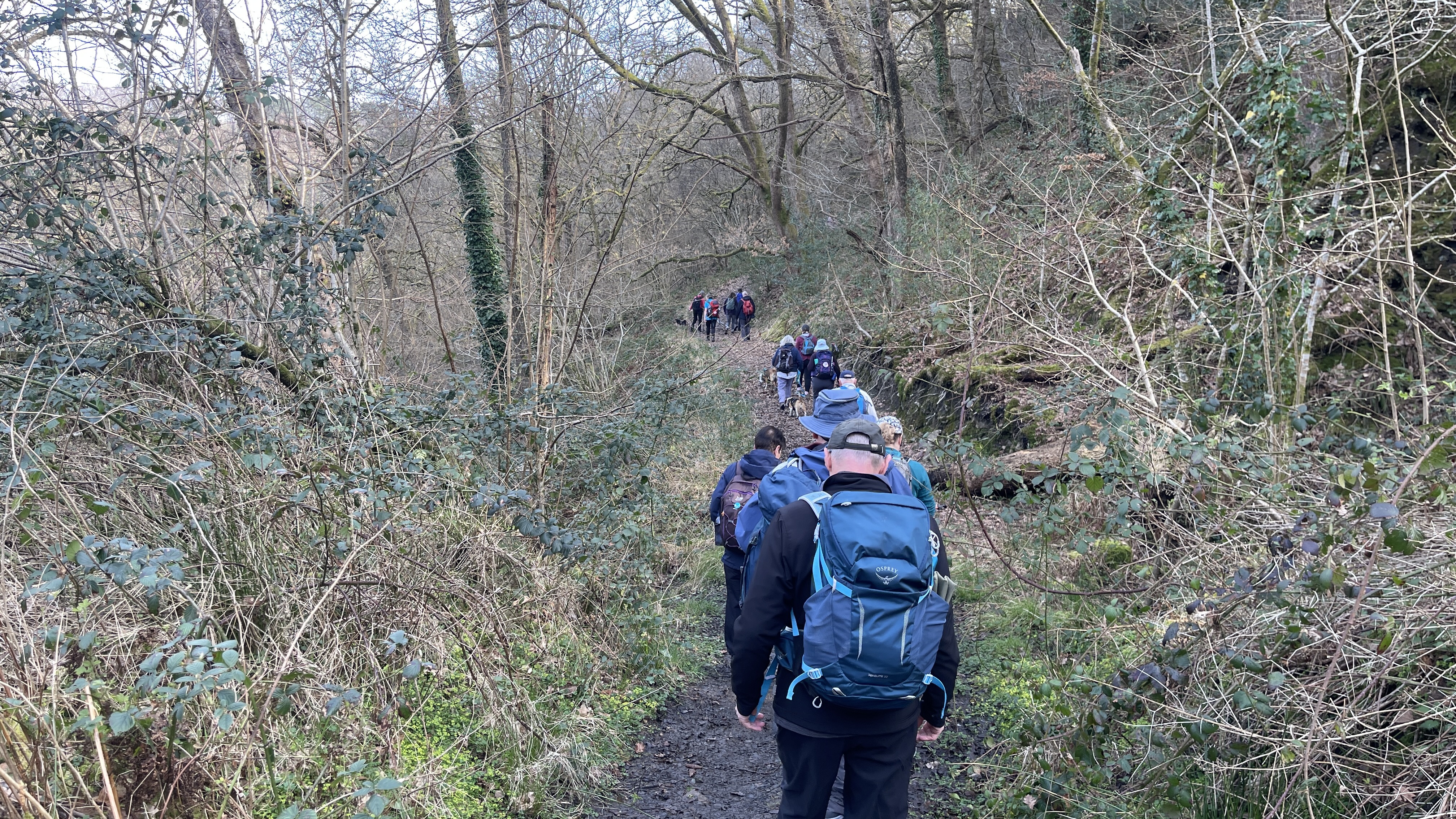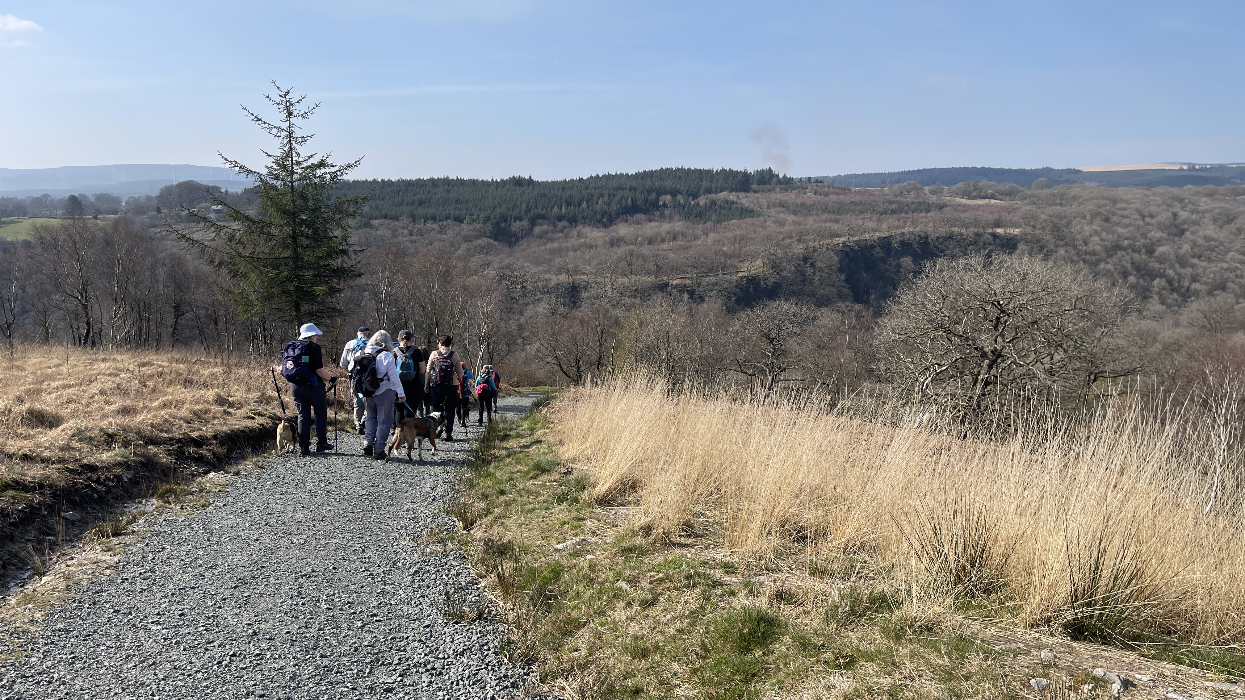 Dinas rock greeted fourteen Merthyr Valley Ramblers (including welcome guests Trudie and Helen) in bright sunshine today. Our 6.5 mile walk started uphill through Coed y Ffyrnau, across the Sychryd then due East to Ffynnon Ddu for a quick cuppa. We then criss-crossed along the tracks to Sgwg yr Elra where the bravest of us went down the steep path to the waterfall. It was then through Cilhepste Fach and Cerig and down a steep zig zag path to the old explosives factory where we had lunch. It was then along the river back to the start. A superb walk well led by Jenny and the usual great company.