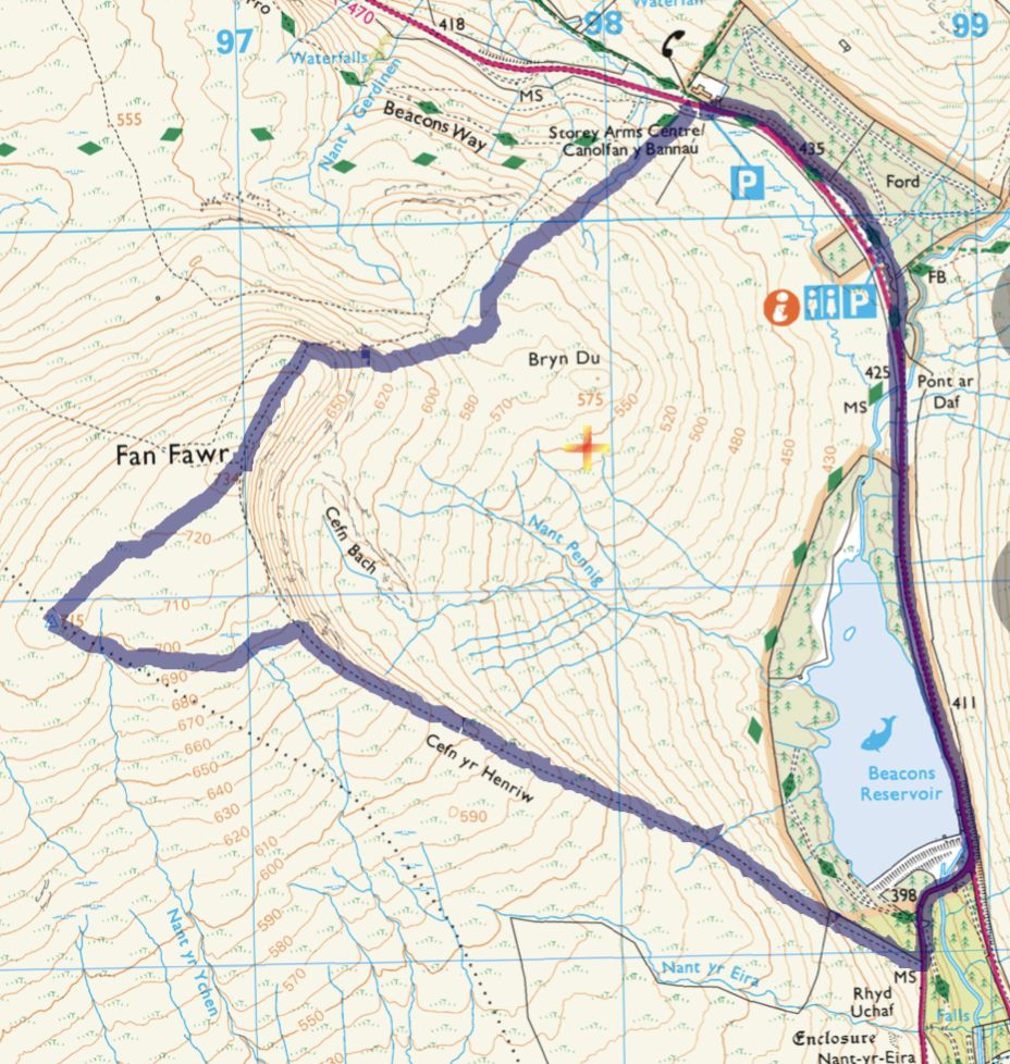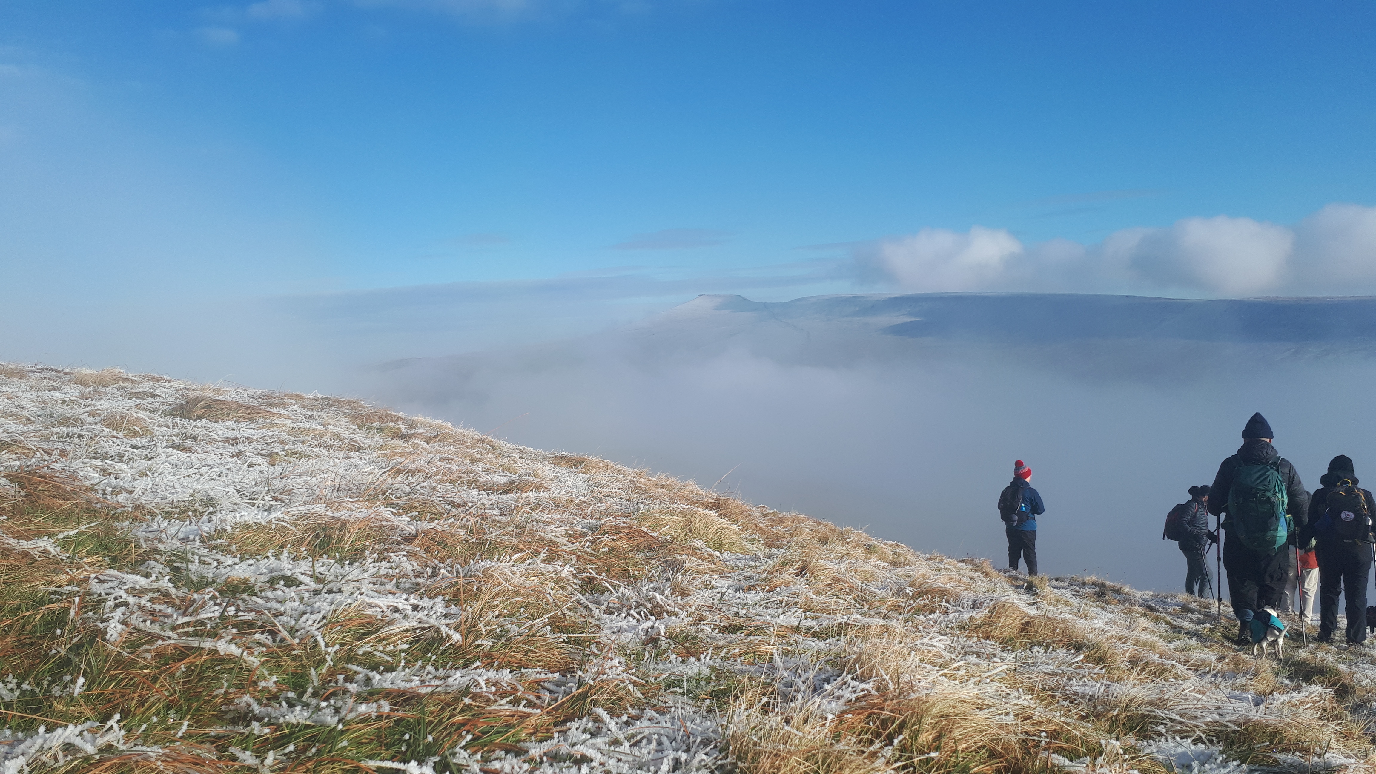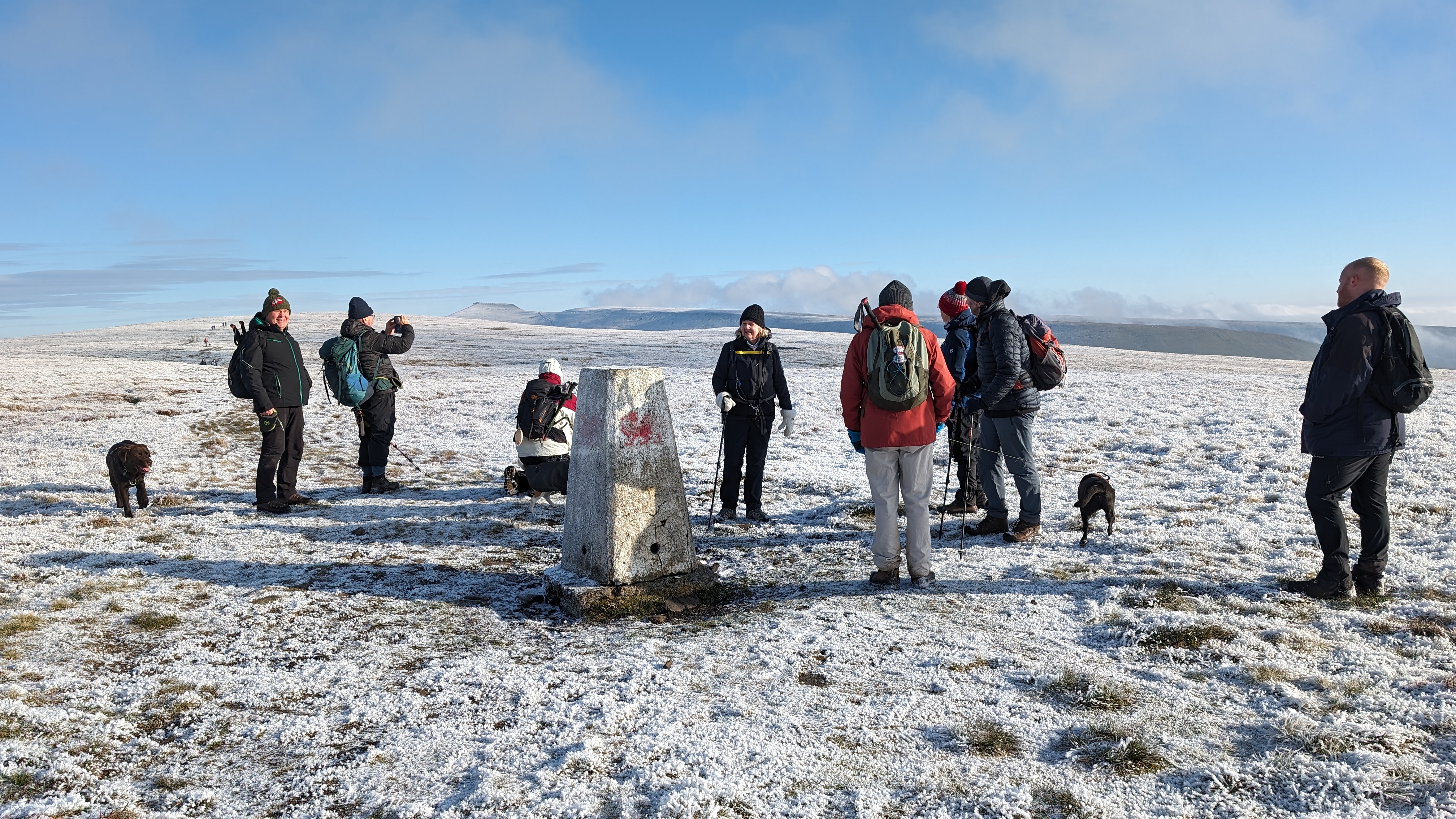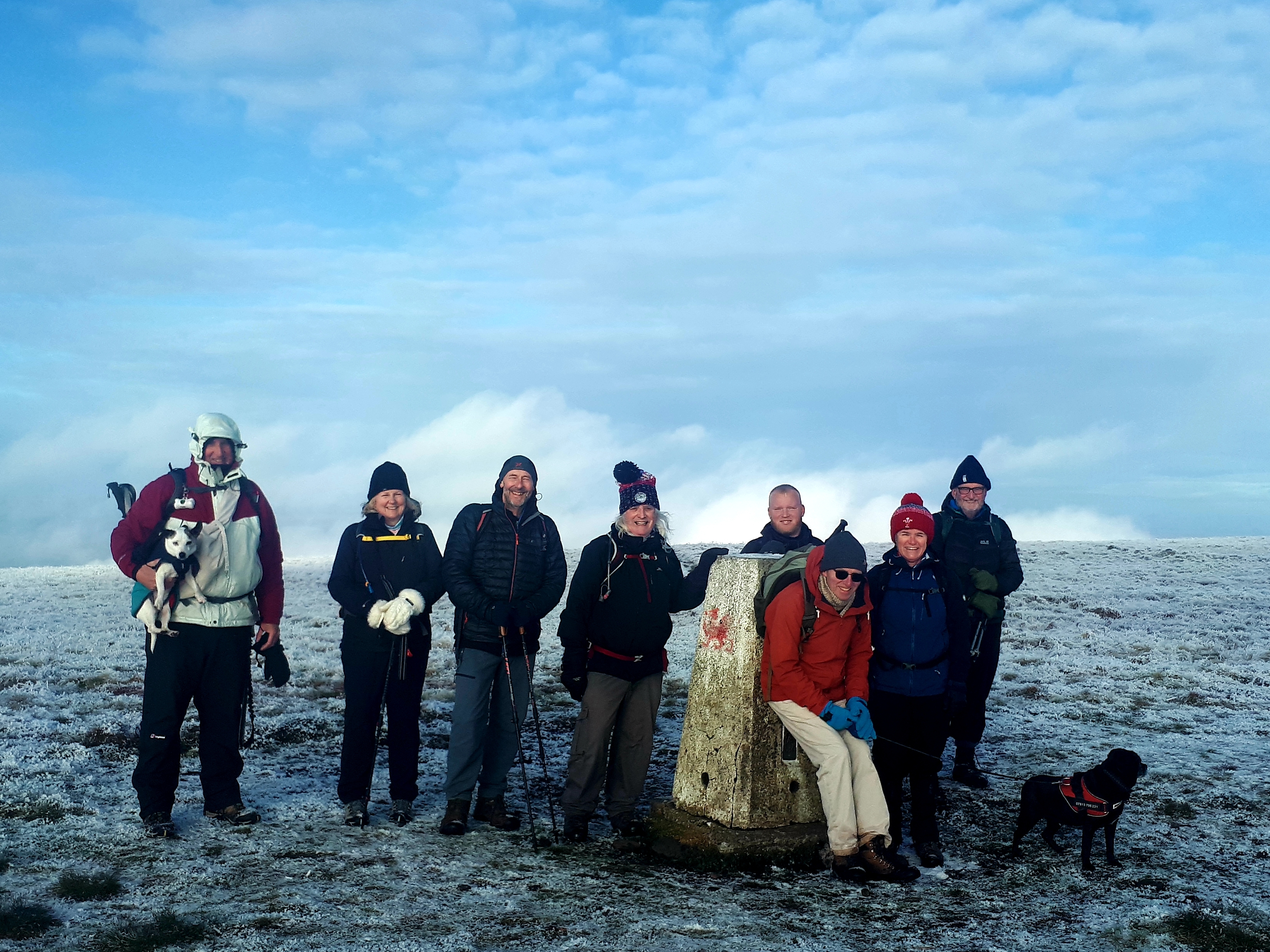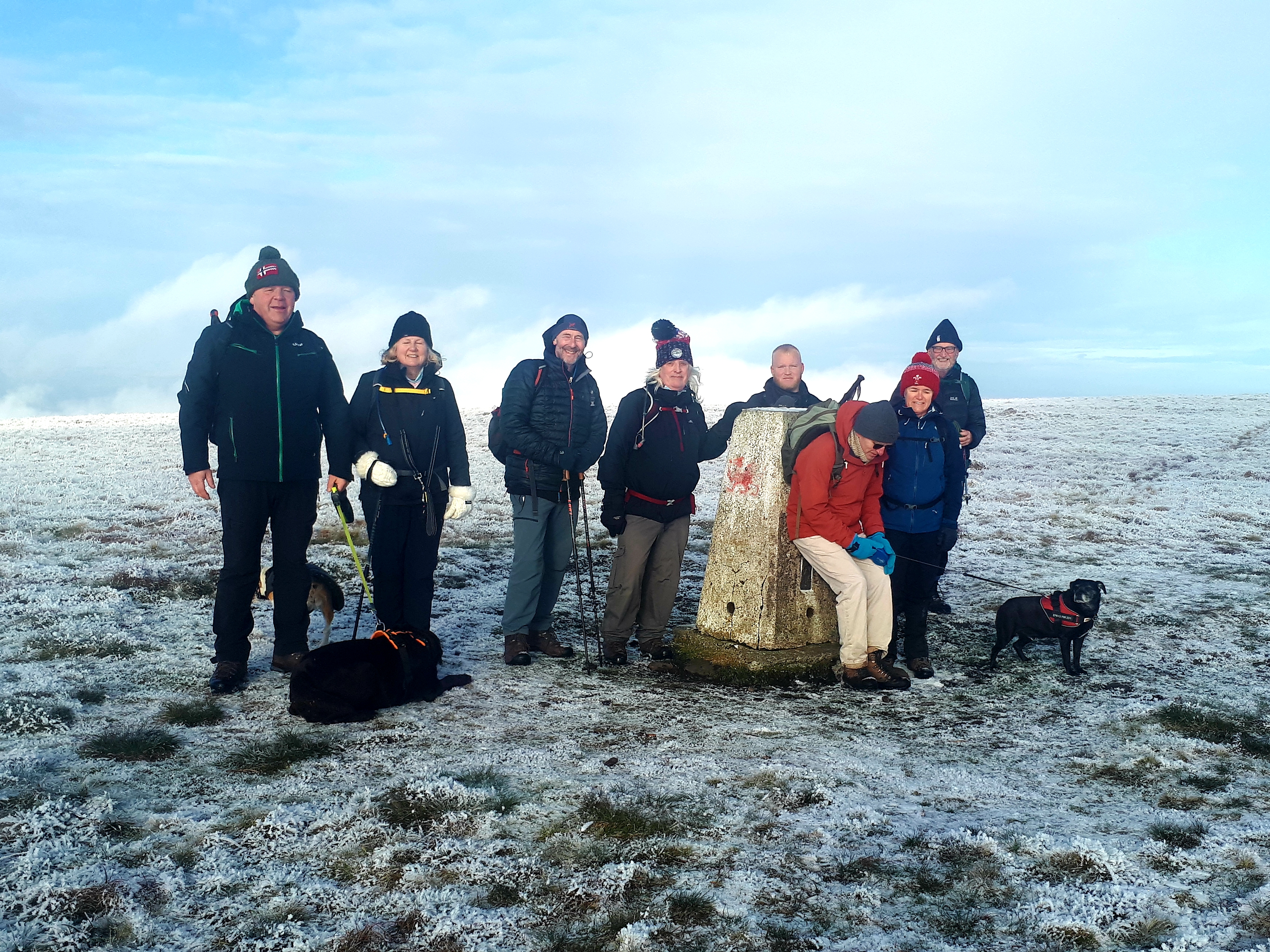 Today a group of 9 ramblers and 4 dogs on a 5 mile walk around Fan Fawr and to the Beacons Reservoir. Frosty ground conditions with ice and a cold wind at the summit of Fan Fawr. After visiting the trig point, we descended down to the reservoir walking through low cold wet clouds, which dropped the temperature down a lot. To avoid more frosty ground conditions with ice, the return leg was moved to follow the A4059 and A470 roads back to Pont ar Daf and back to the start at Storey Arms.