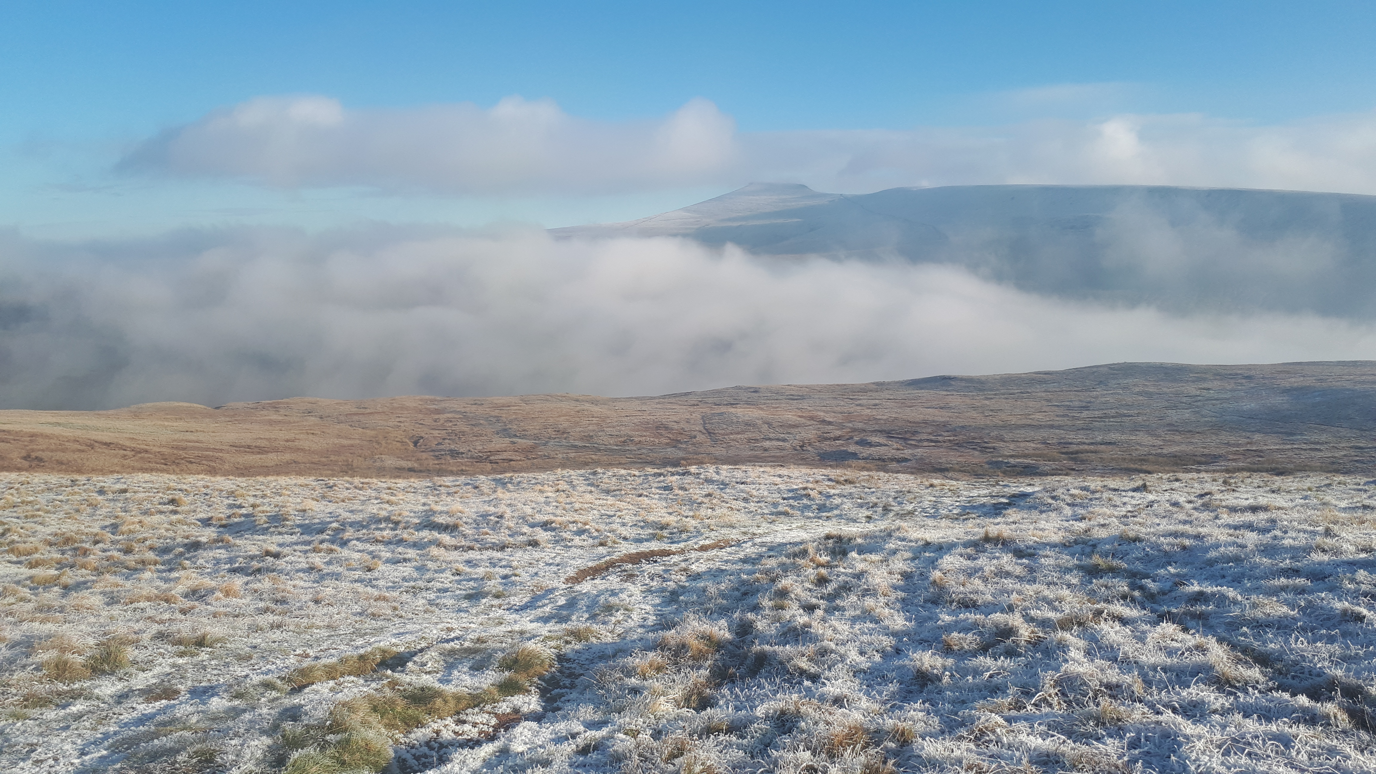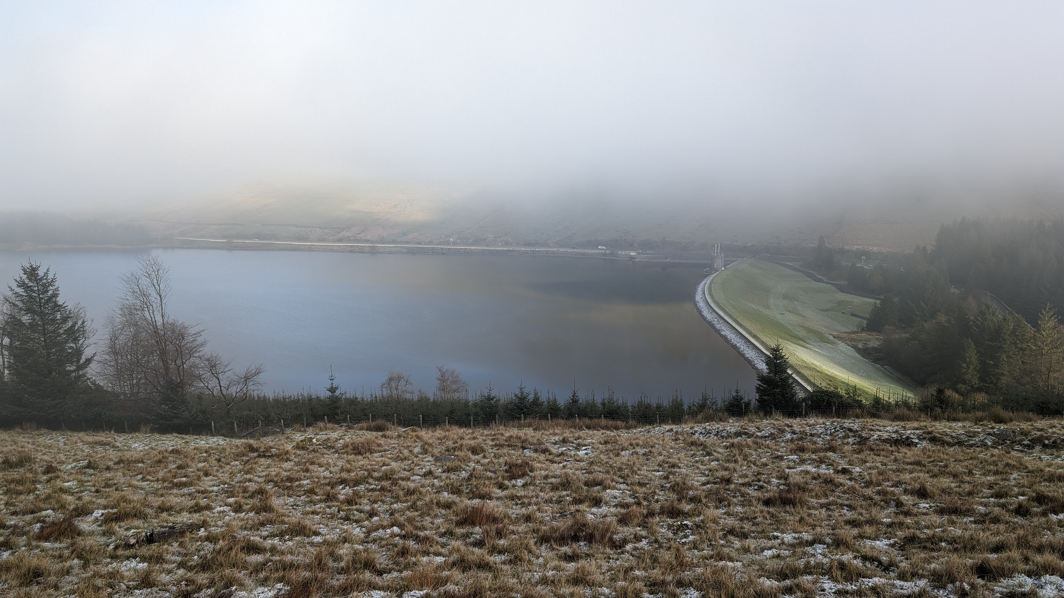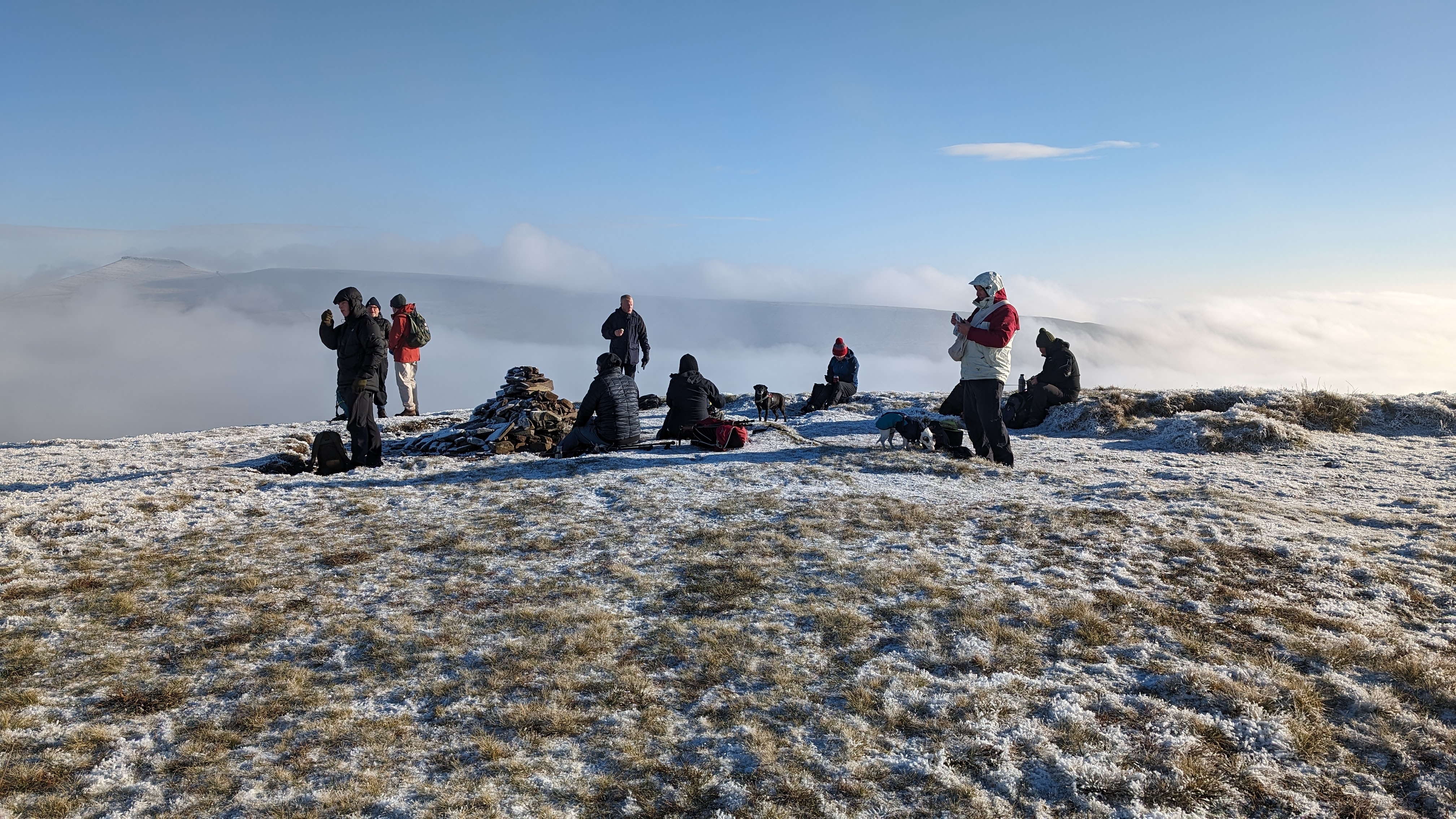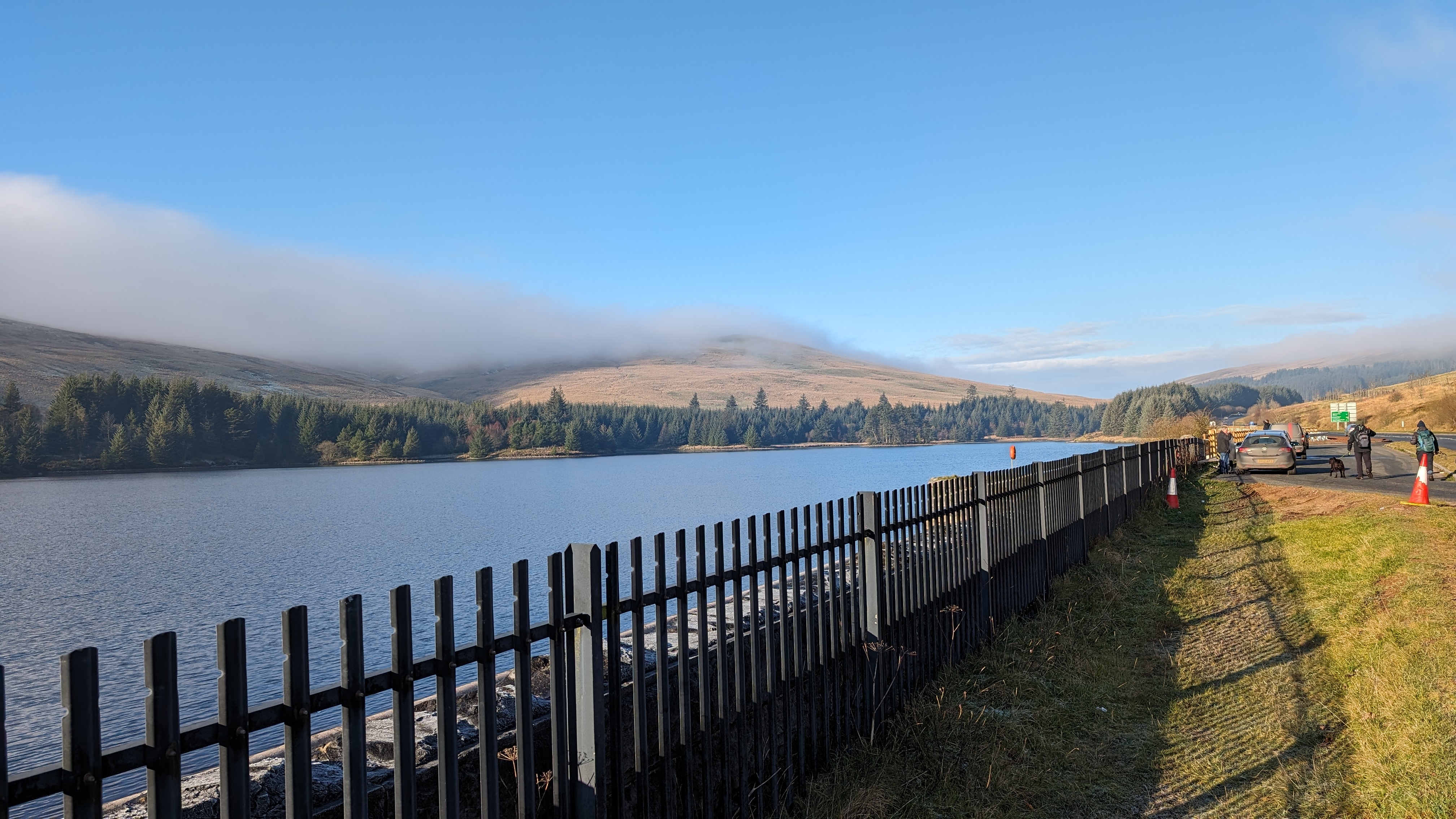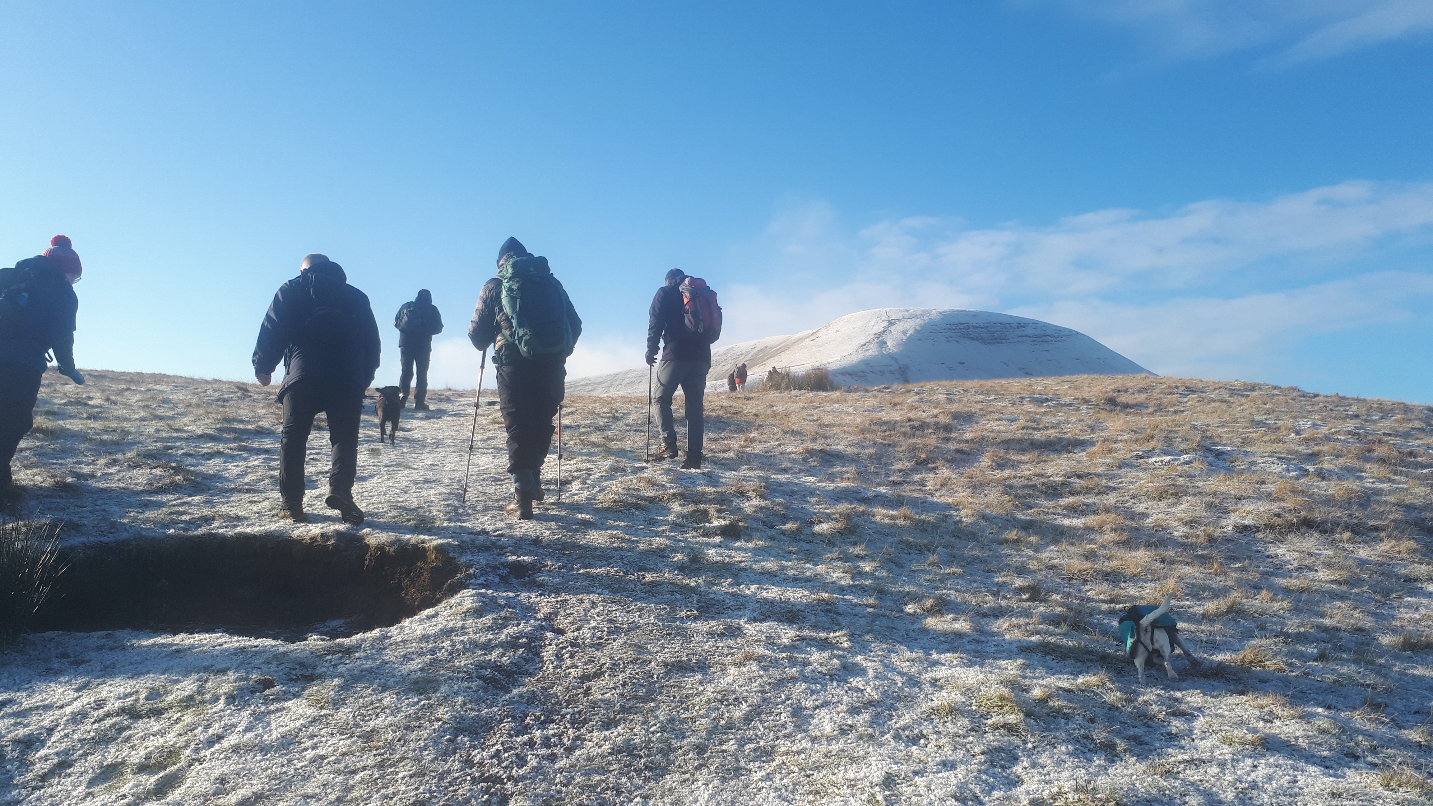 Today a group of 9 ramblers and 4 dogs on a 5 mile walk around Fan Fawr and to the Beacons Reservoir. Frosty ground conditions with ice and a cold wind at the summit of Fan Fawr. After visiting the trig point, we descended down to the reservoir walking through low cold wet clouds, which dropped the temperature down a lot. To avoid more frosty ground conditions with ice, the return leg was moved to follow the A4059 and A470 roads back to Pont ar Daf and back to the start at Storey Arms.
