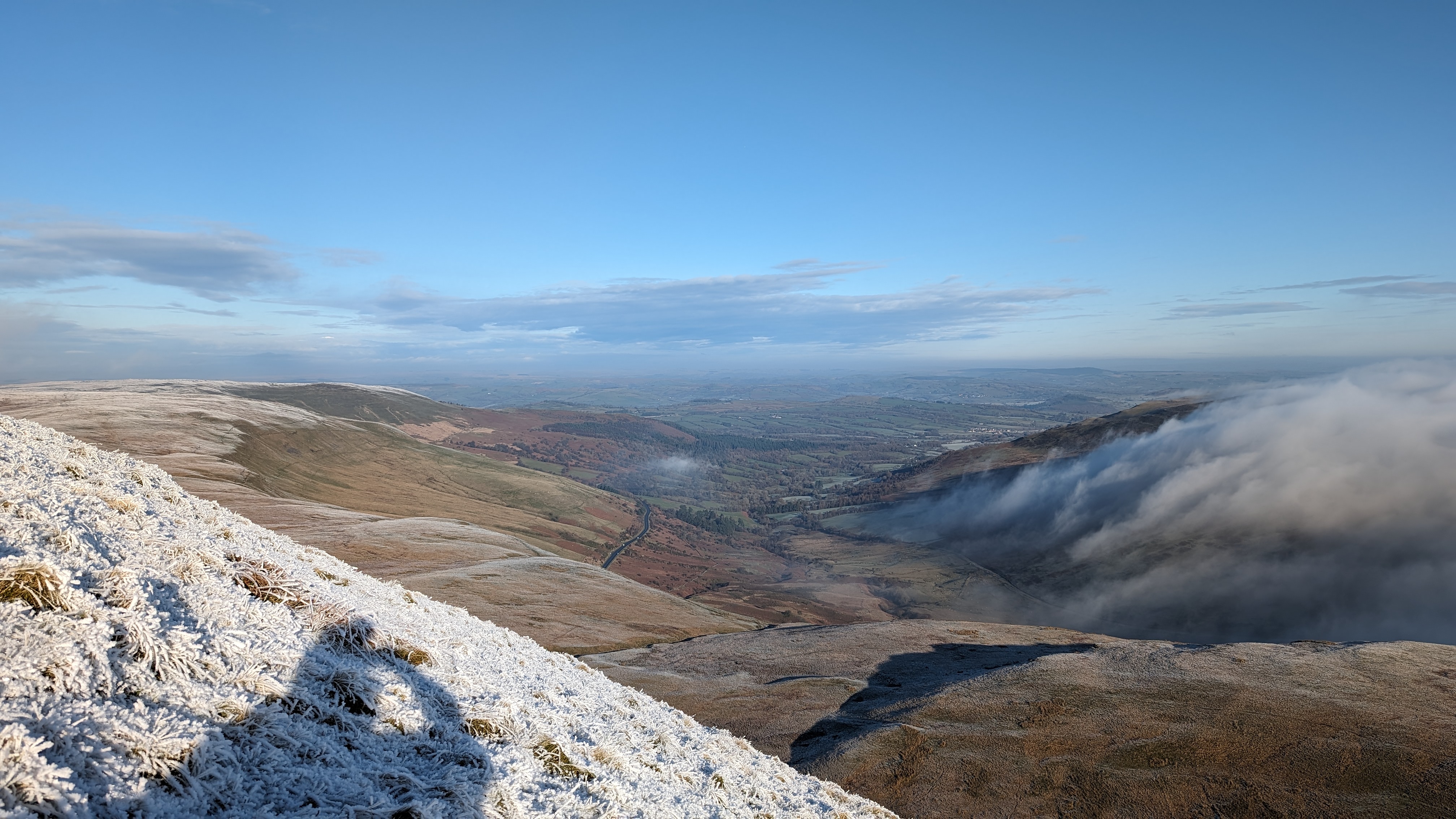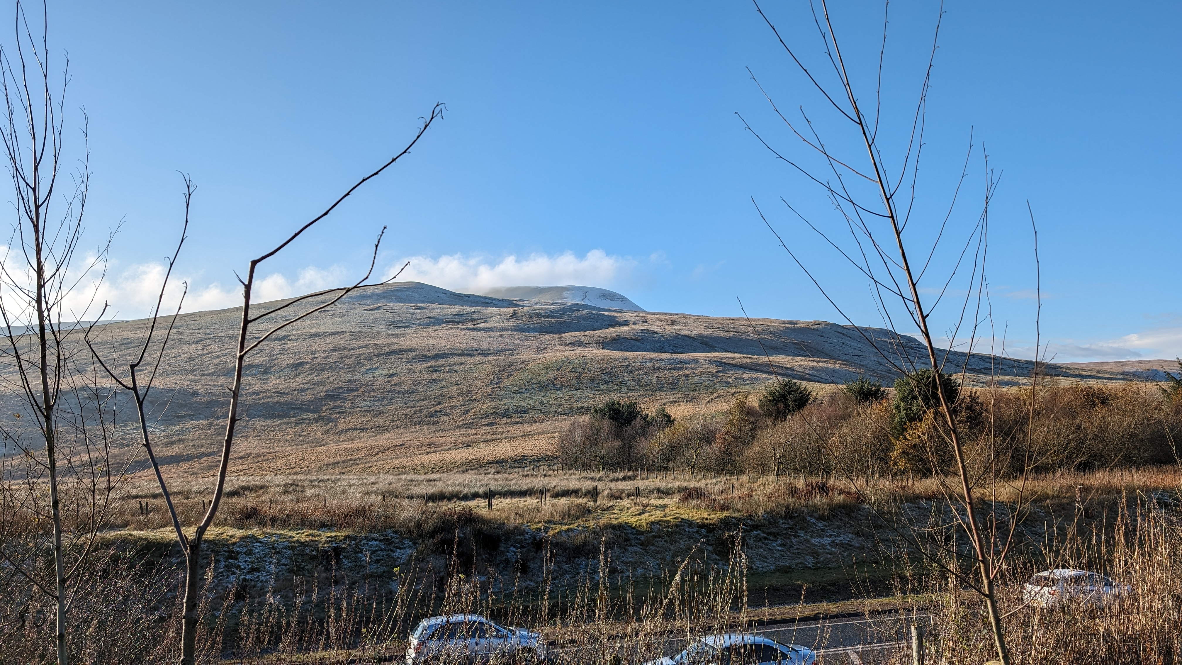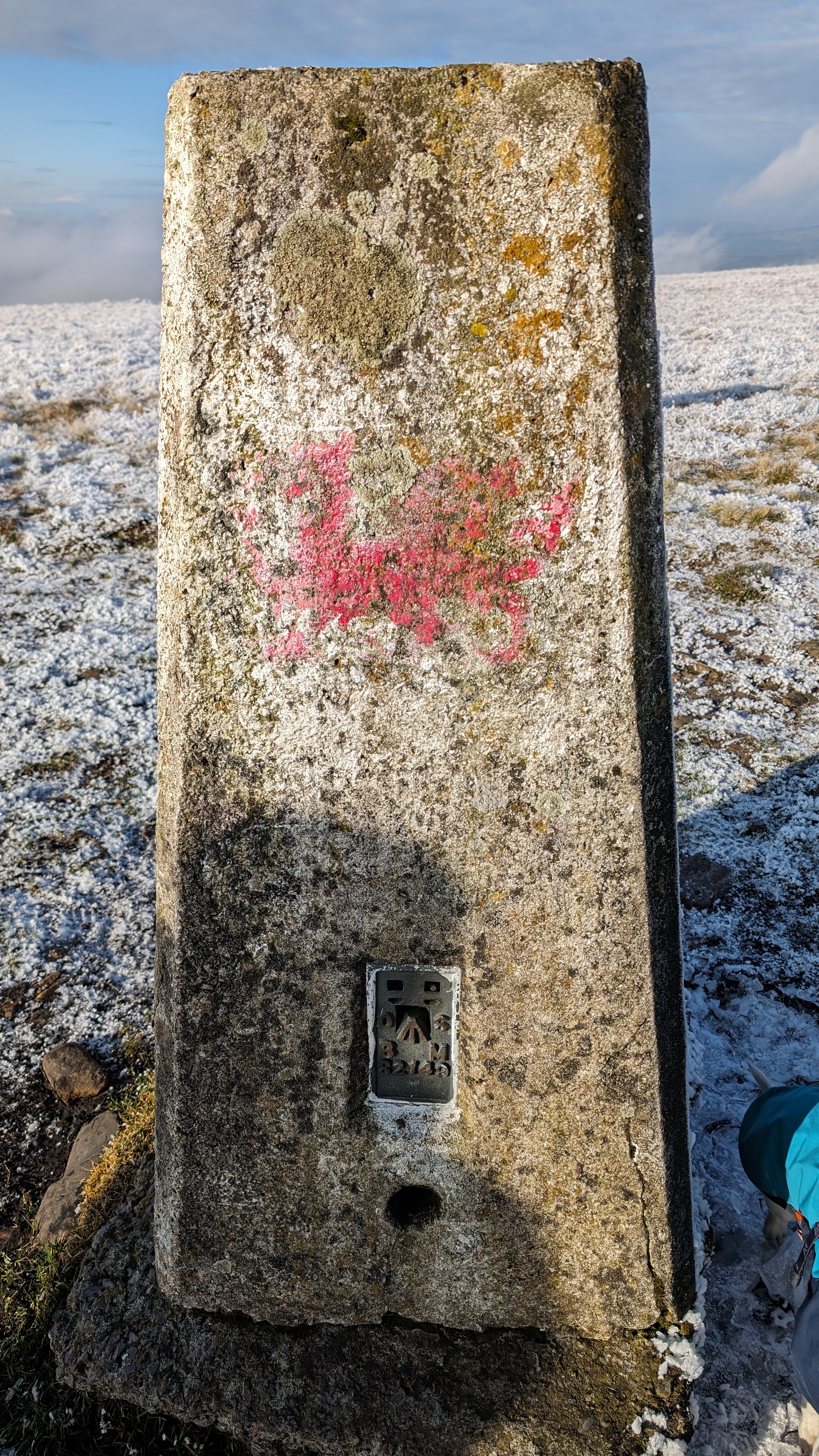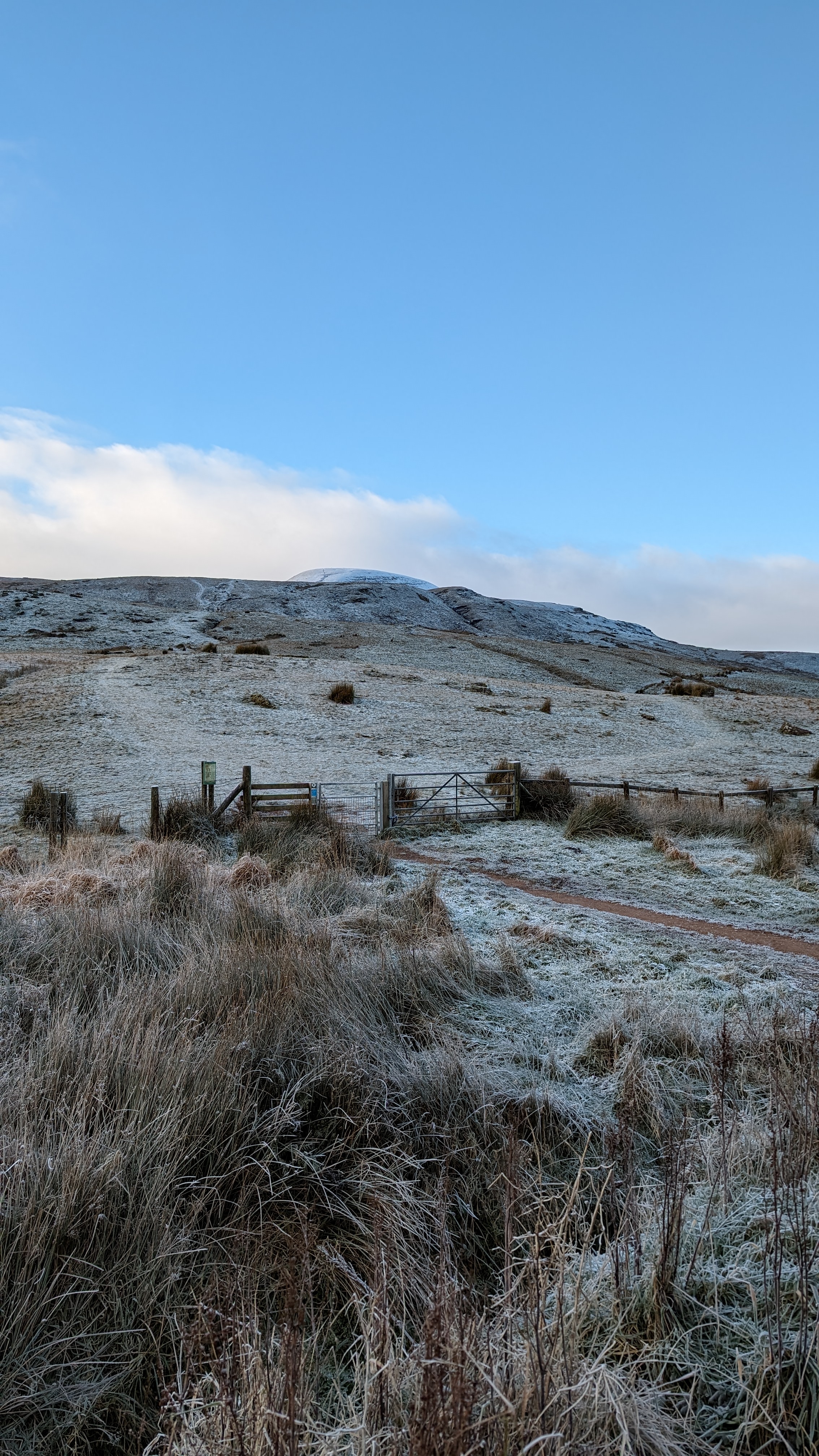 Today a group of 9 ramblers and 4 dogs on a 5 mile walk around Fan Fawr and to the Beacons Reservoir. Frosty ground conditions with ice and a cold wind at the summit of Fan Fawr. After visiting the trig point, we descended down to the reservoir walking through low cold wet clouds, which dropped the temperature down a lot. To avoid more frosty ground conditions with ice, the return leg was moved to follow the A4059 and A470 roads back to Pont ar Daf and back to the start at Storey Arms.