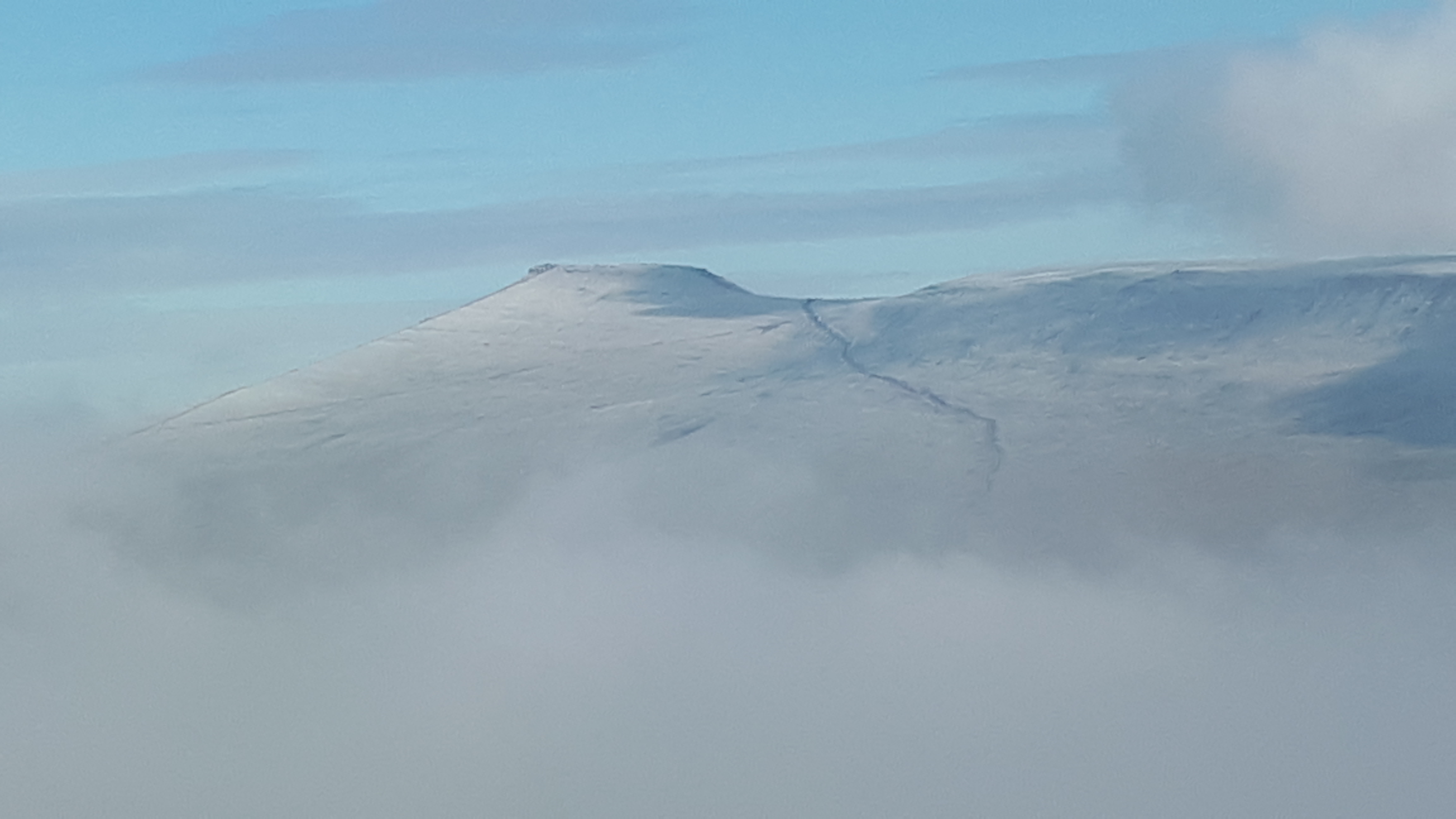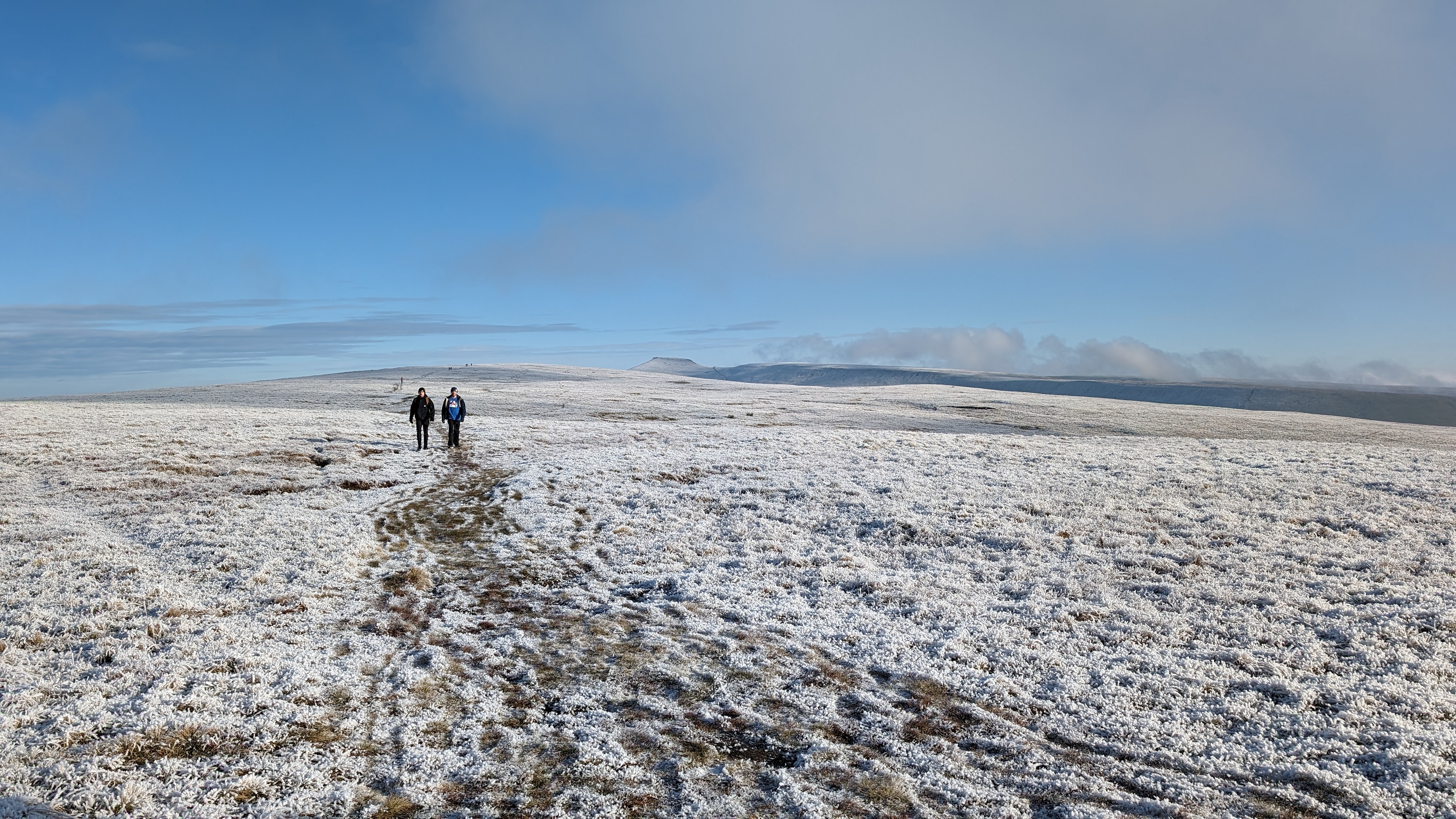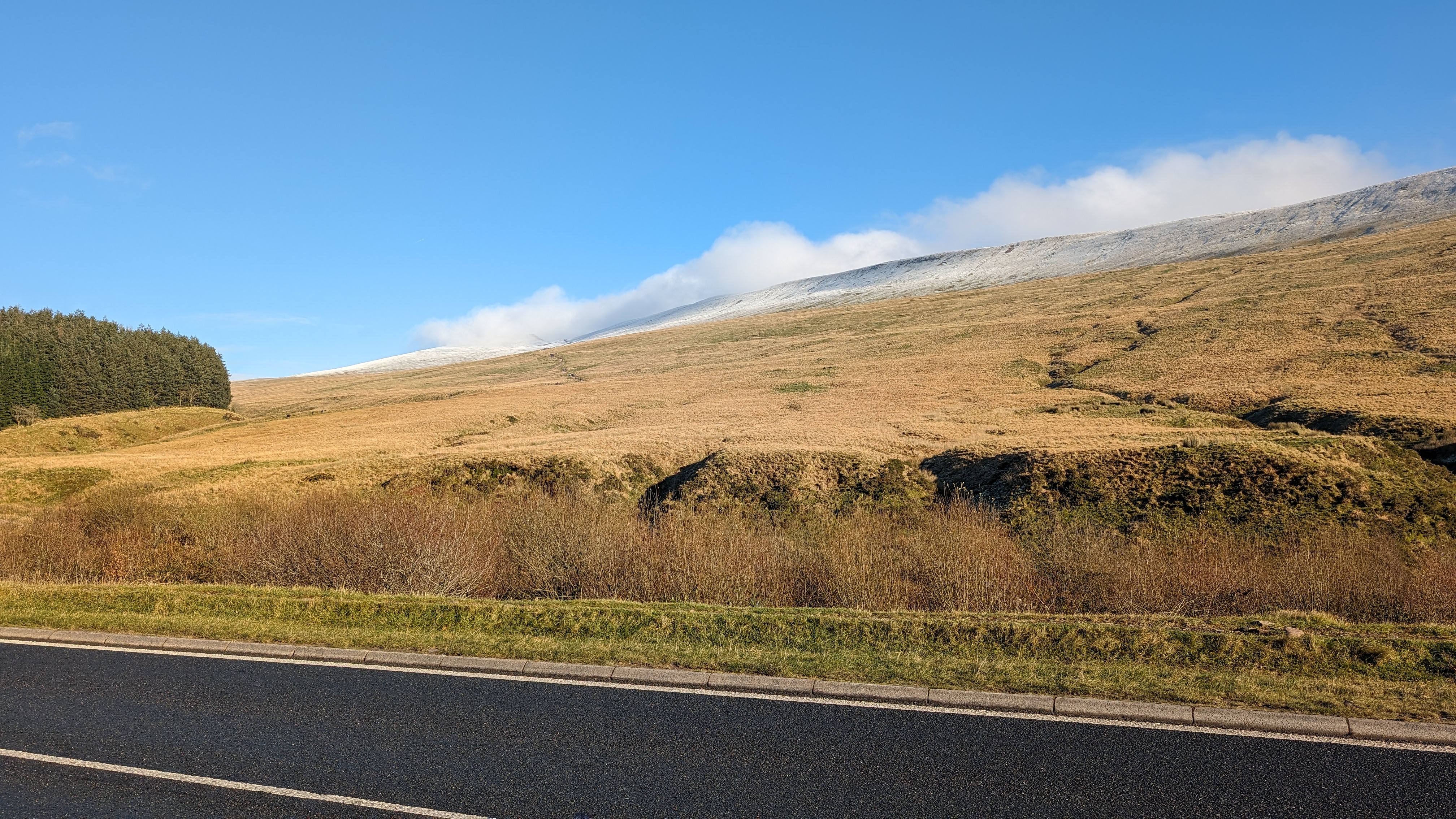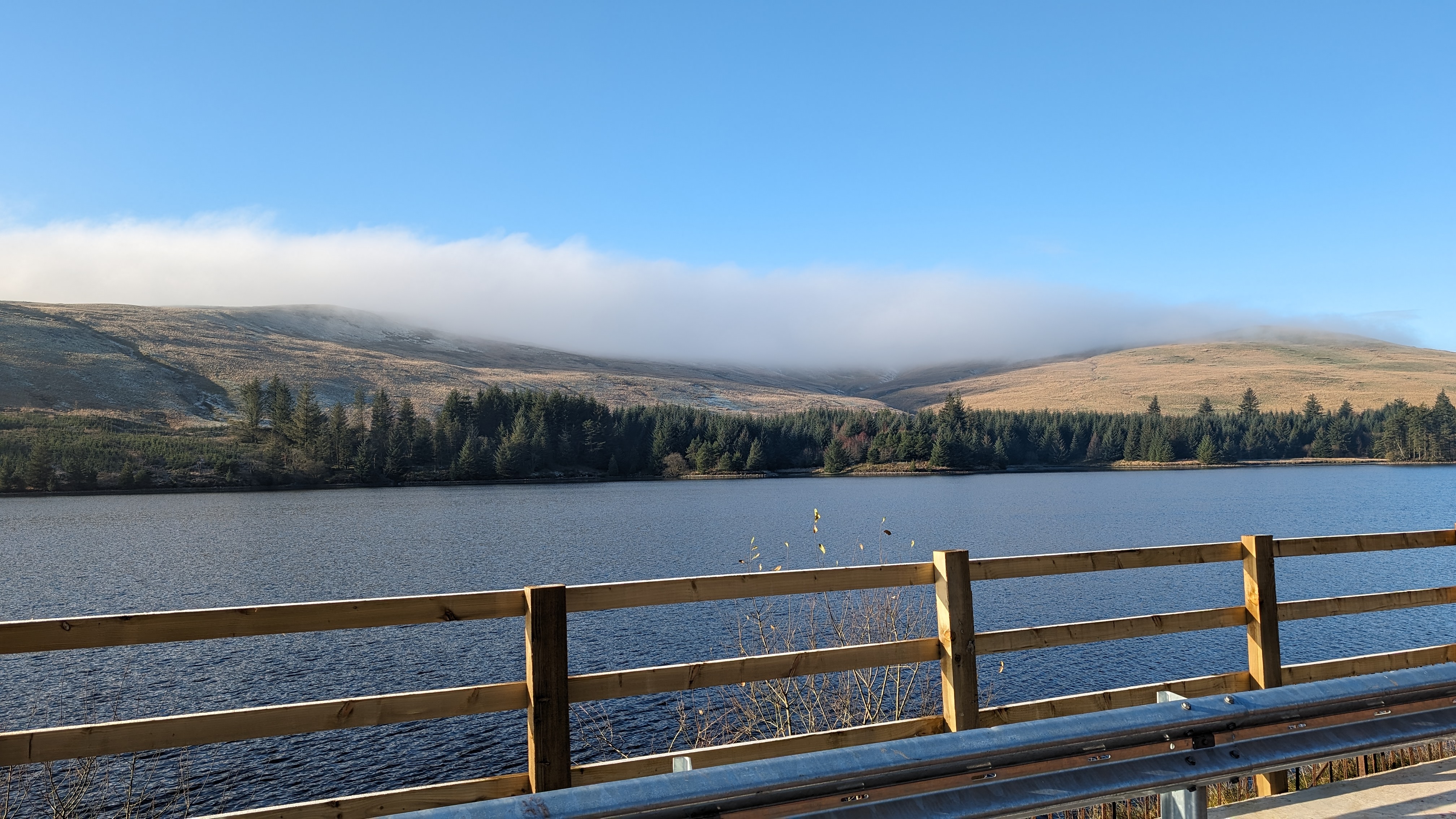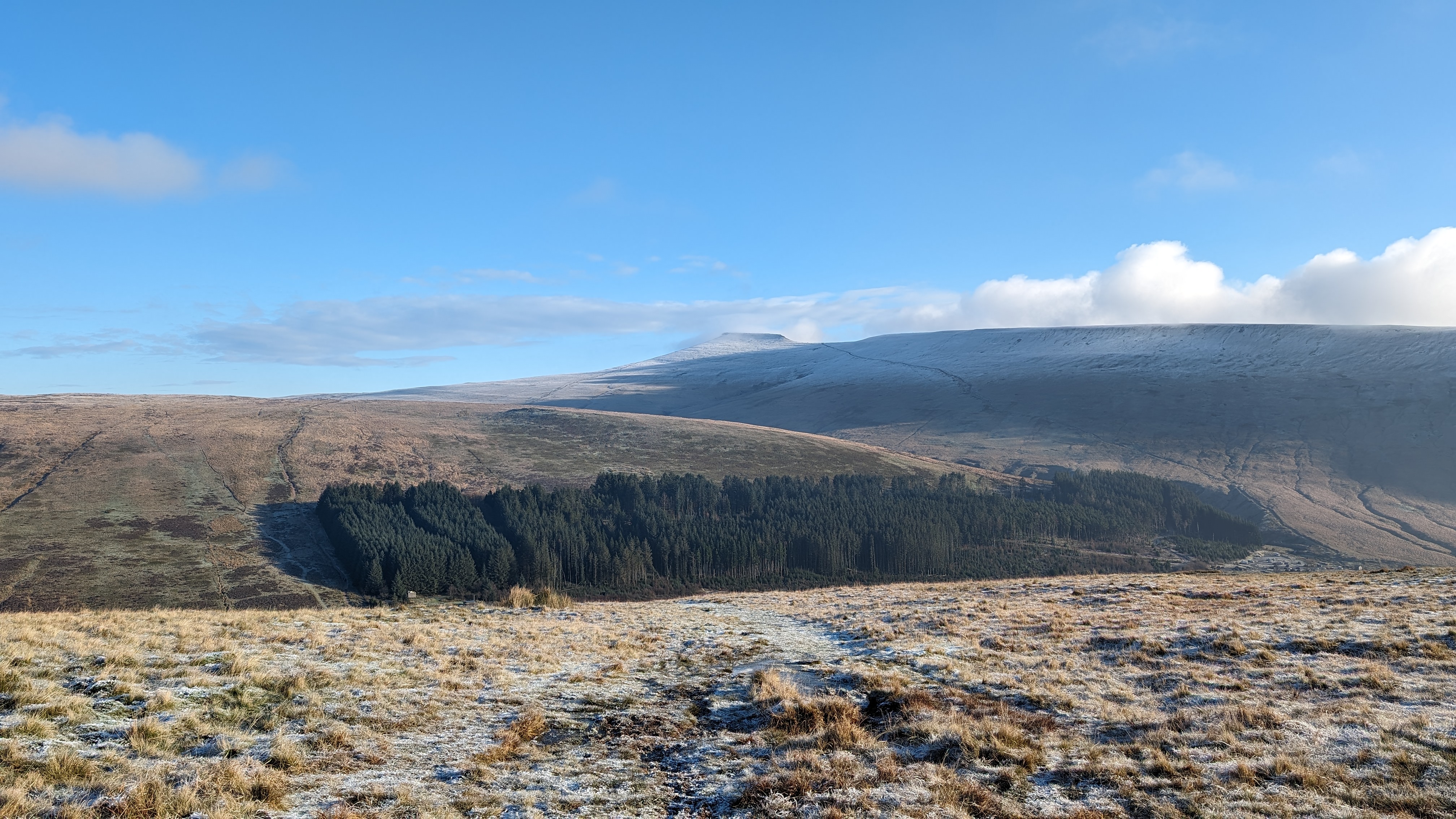 Today a group of 9 ramblers and 4 dogs on a 5 mile walk around Fan Fawr and to the Beacons Reservoir. Frosty ground conditions with ice and a cold wind at the summit of Fan Fawr. After visiting the trig point, we descended down to the reservoir walking through low cold wet clouds, which dropped the temperature down a lot. To avoid more frosty ground conditions with ice, the return leg was moved to follow the A4059 and A470 roads back to Pont ar Daf and back to the start at Storey Arms.