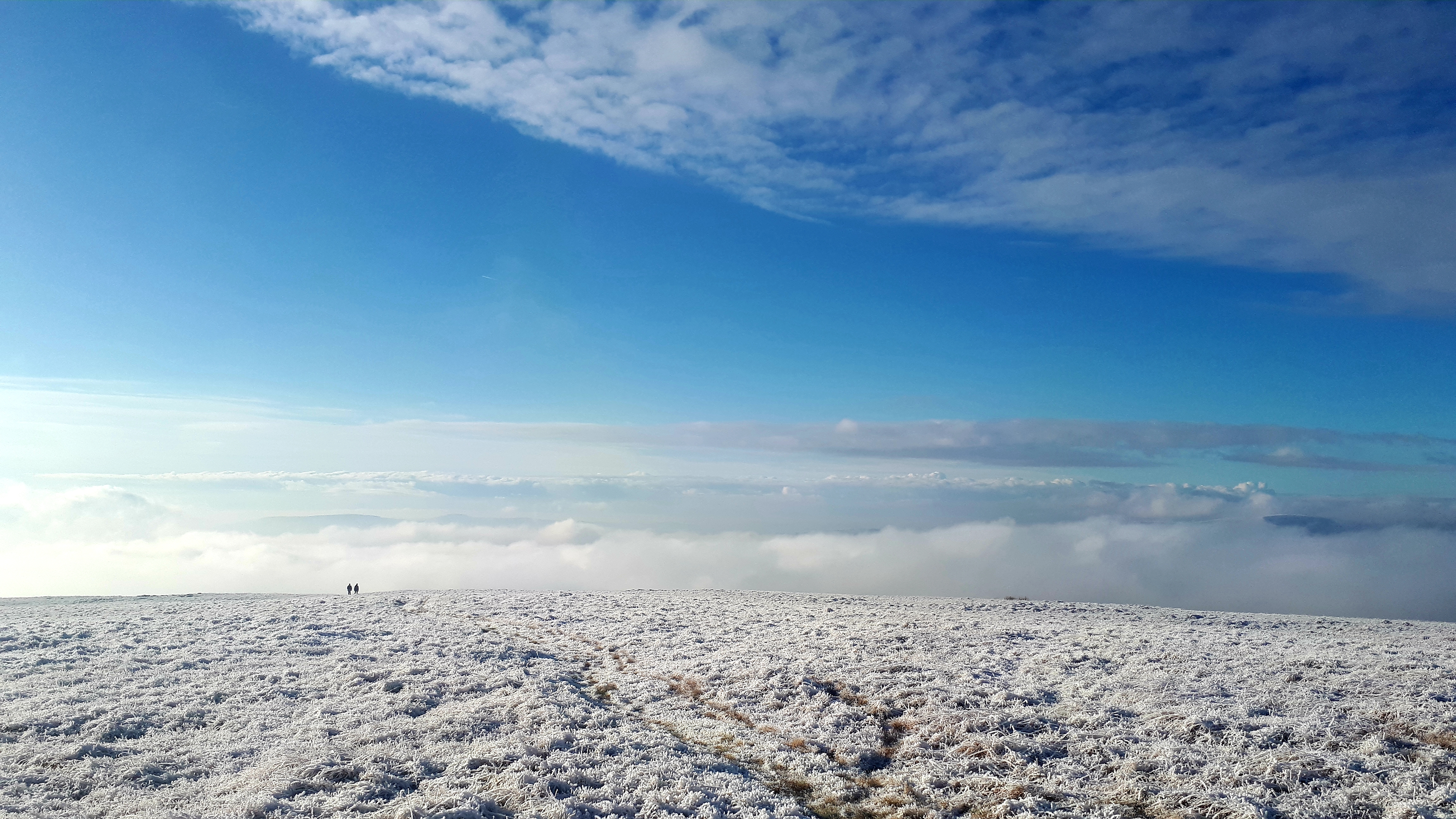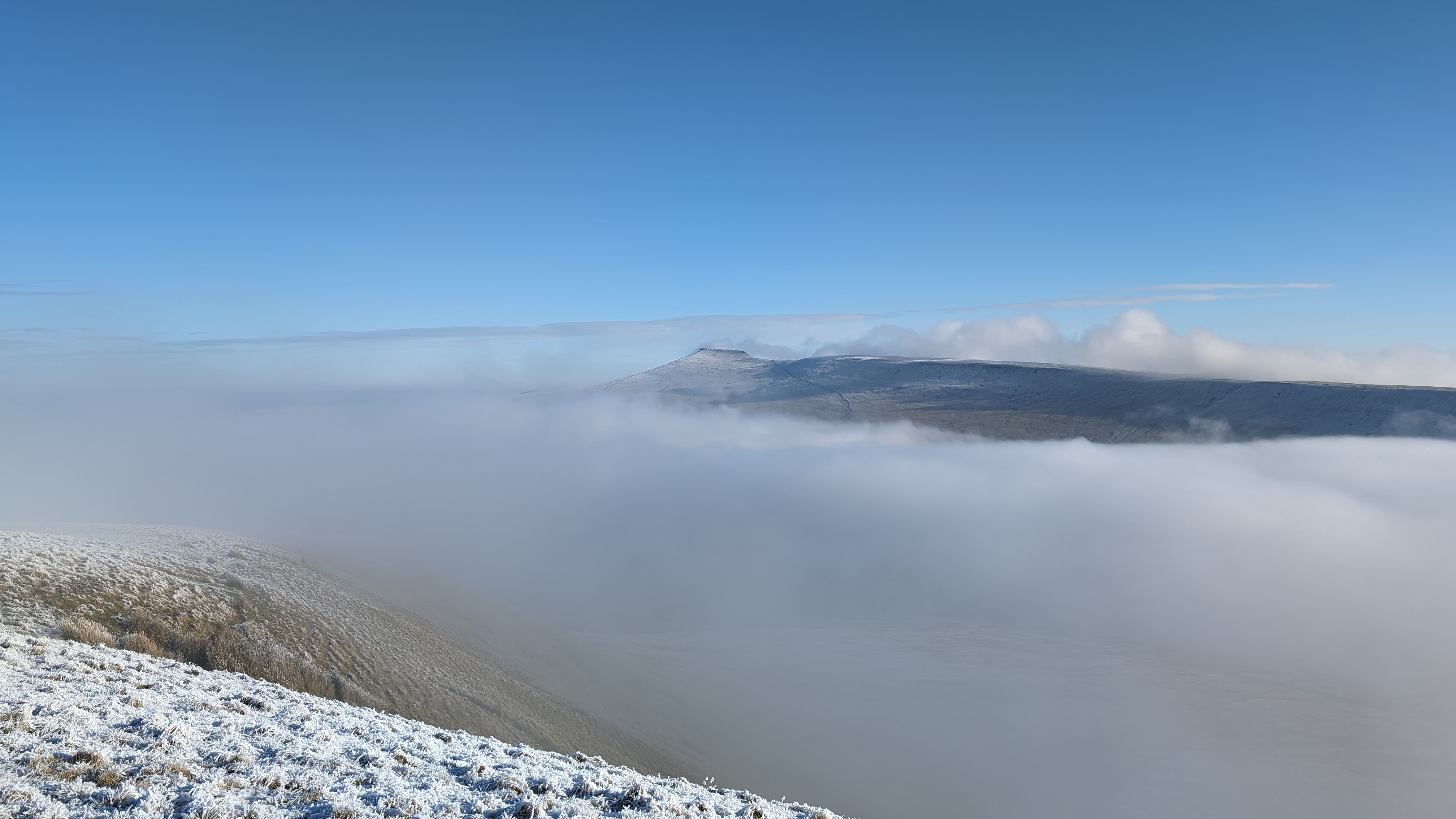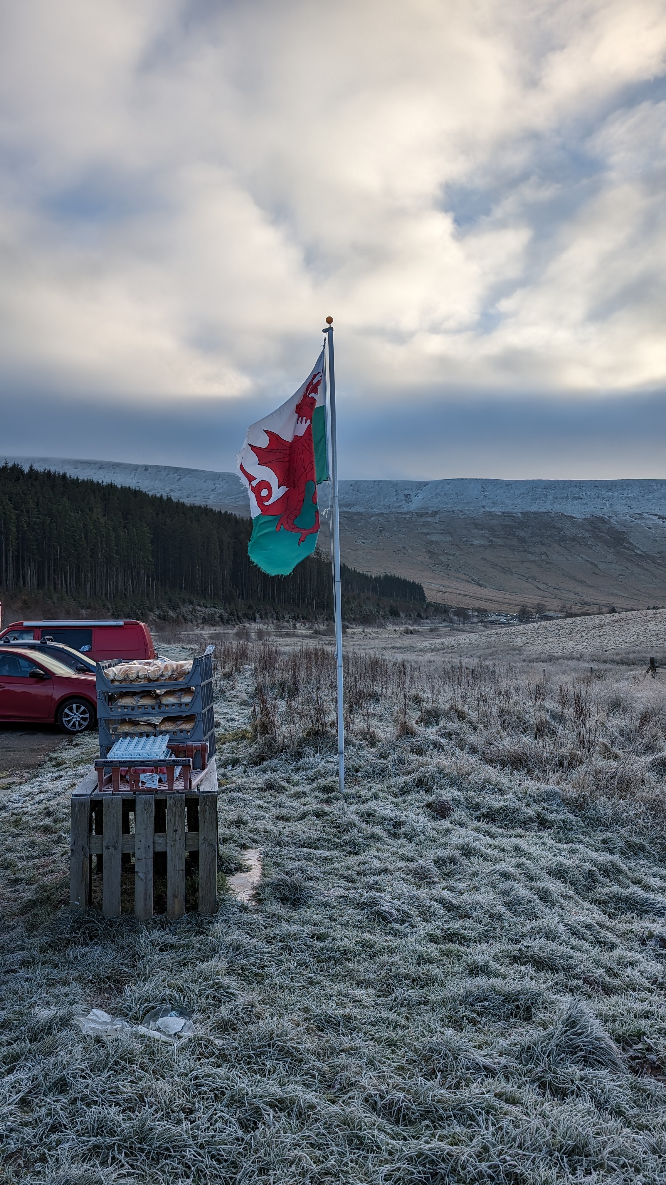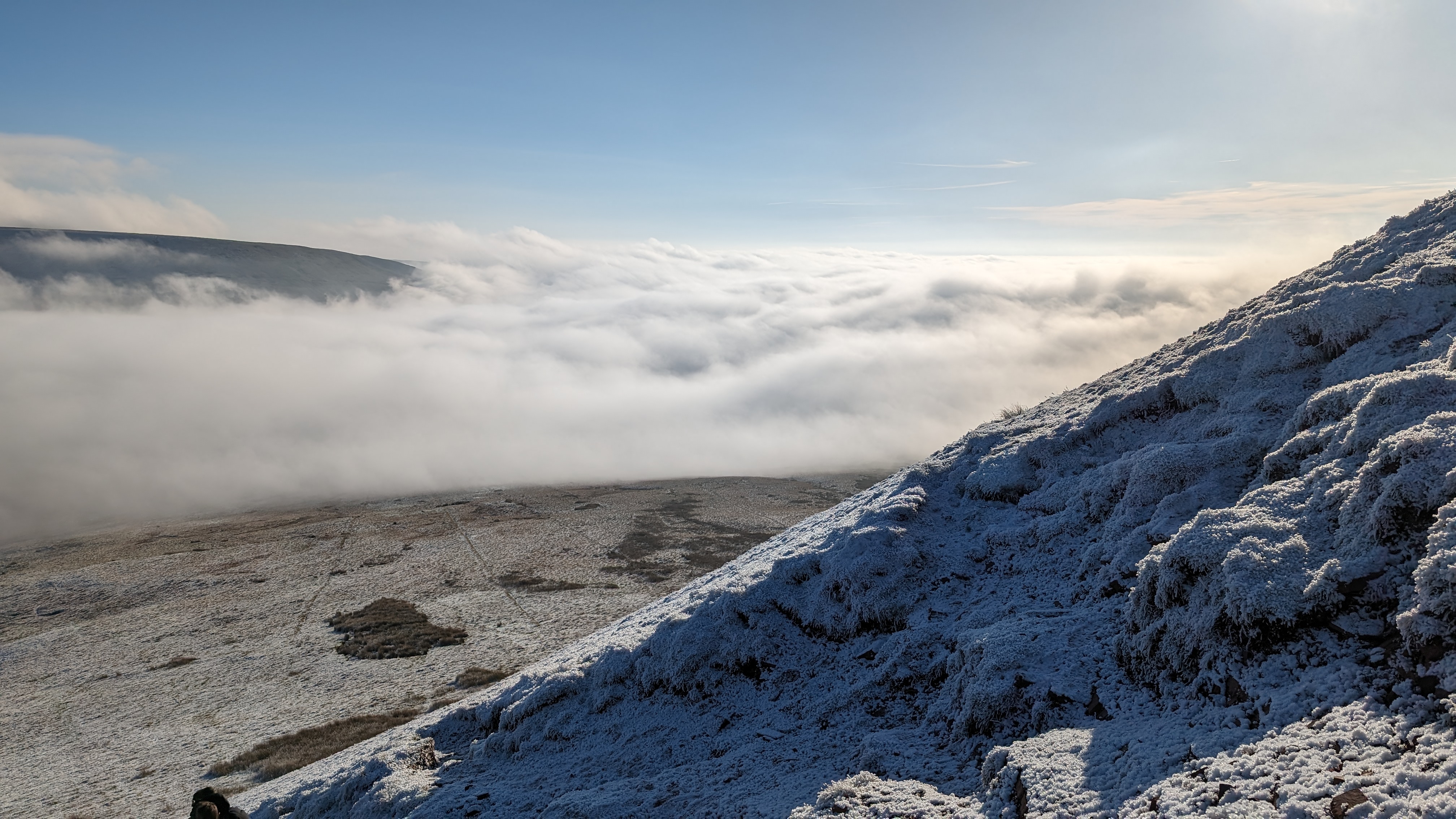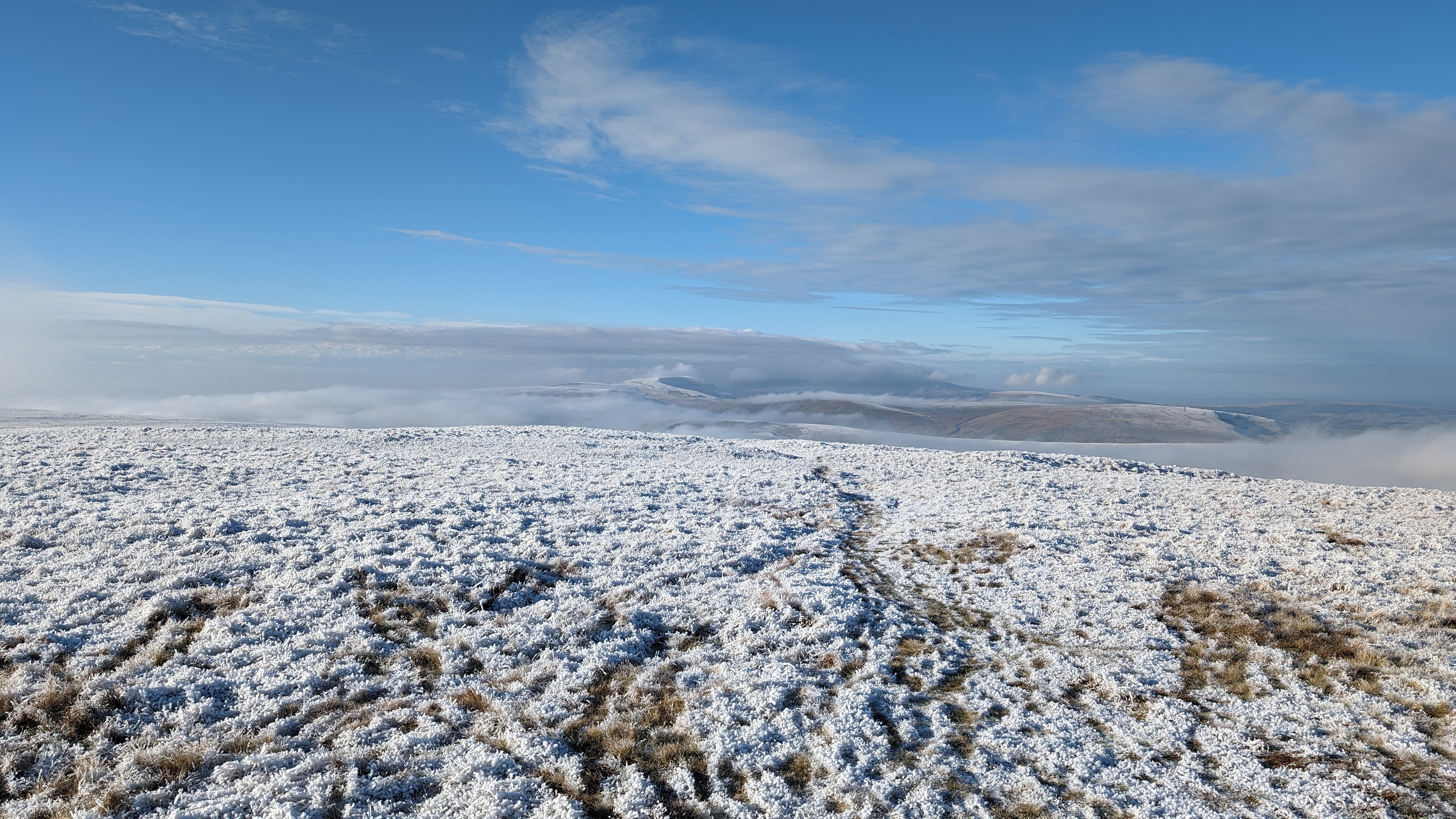 Today a group of 9 ramblers and 4 dogs on a 5 mile walk around Fan Fawr and to the Beacons Reservoir. Frosty ground conditions with ice and a cold wind at the summit of Fan Fawr. After visiting the trig point, we descended down to the reservoir walking through low cold wet clouds, which dropped the temperature down a lot. To avoid more frosty ground conditions with ice, the return leg was moved to follow the A4059 and A470 roads back to Pont ar Daf and back to the start at Storey Arms.