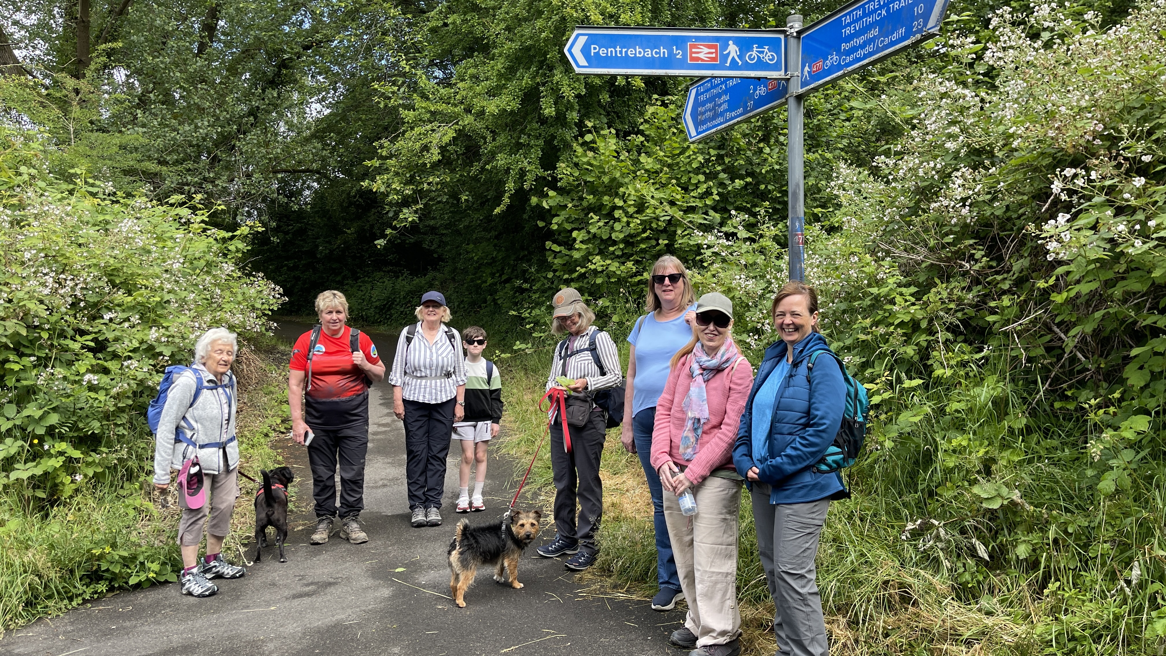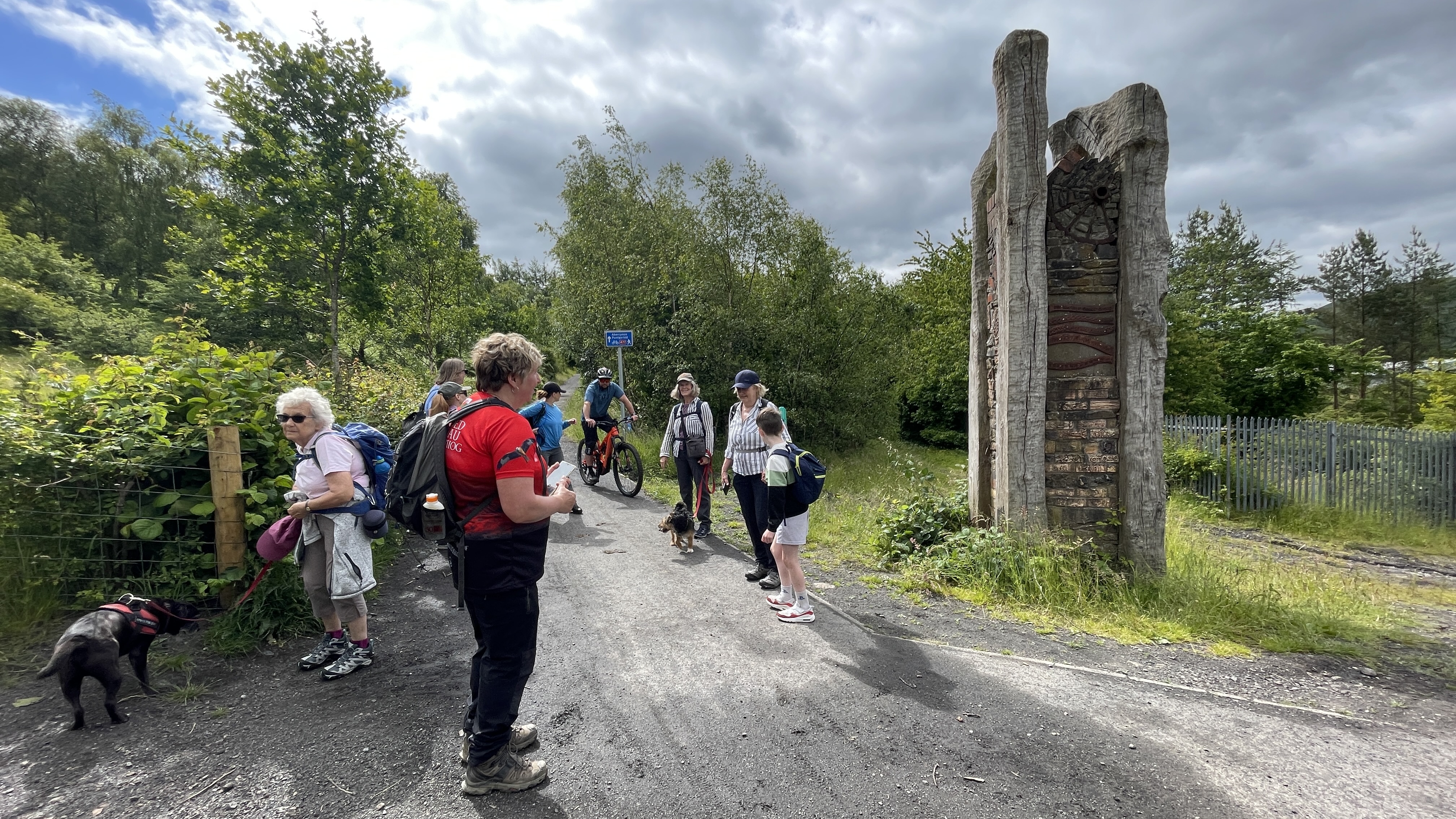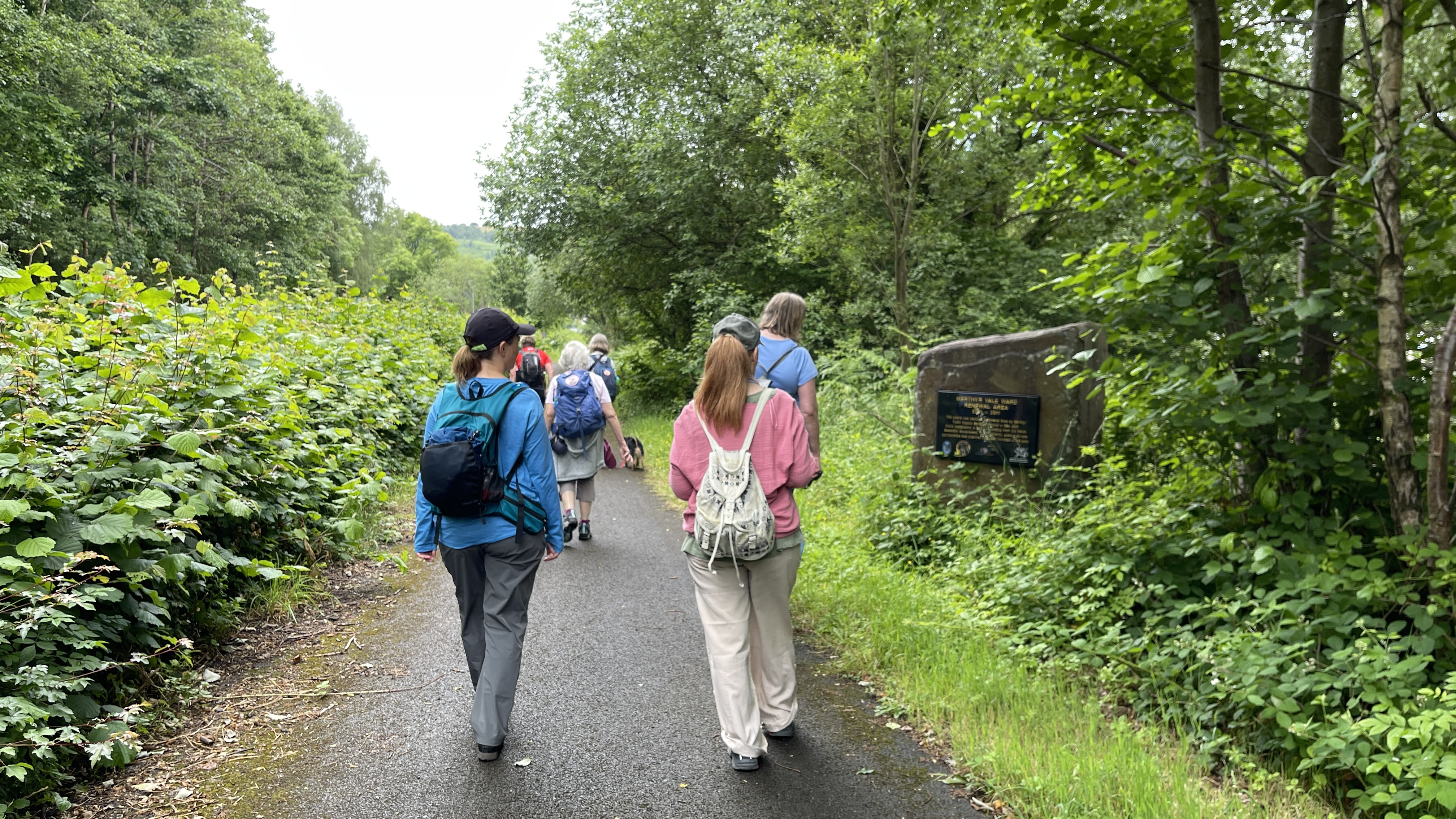 A lovely warm morning greeted the 9 lucky Merthyr Valley Ramblers (including welcome guests Afon, Lisa and Trudy) at the start of our 9 1/2 mile walk today. We steadily made our way southwards, passing tank factory and statue, trees and stream to our first stop at the viewpoint overlooking Aberfan. We then carried on to the remains of the Edwardsville viaducts where more tea and coffee was consumed then onwards under the Taff vale viaduct and criss-crossing the Taff to Quakers yard. Lunch was taken in the oasis that is Gary's garden (thanks Gary!) listening to the birds and watching the squirrels while getting ready for the last leg. Our arrival at Abercynon station exactly matched the arrival of the Merthyr bound train and we gratefully hopped aboard, doing in 20 mins what had taken us five hours to do. A big thanks to all for making the walk so enjoyable.