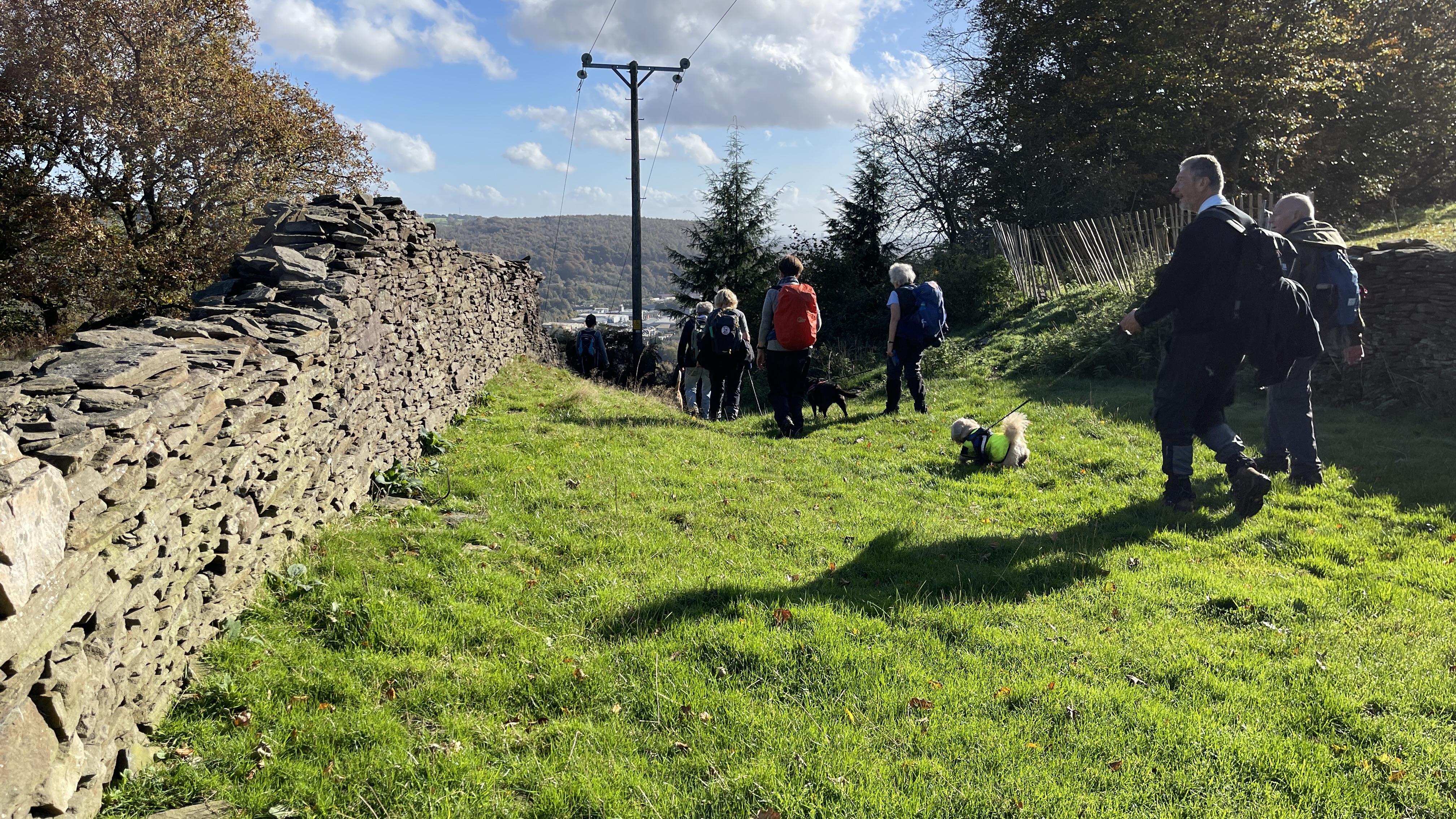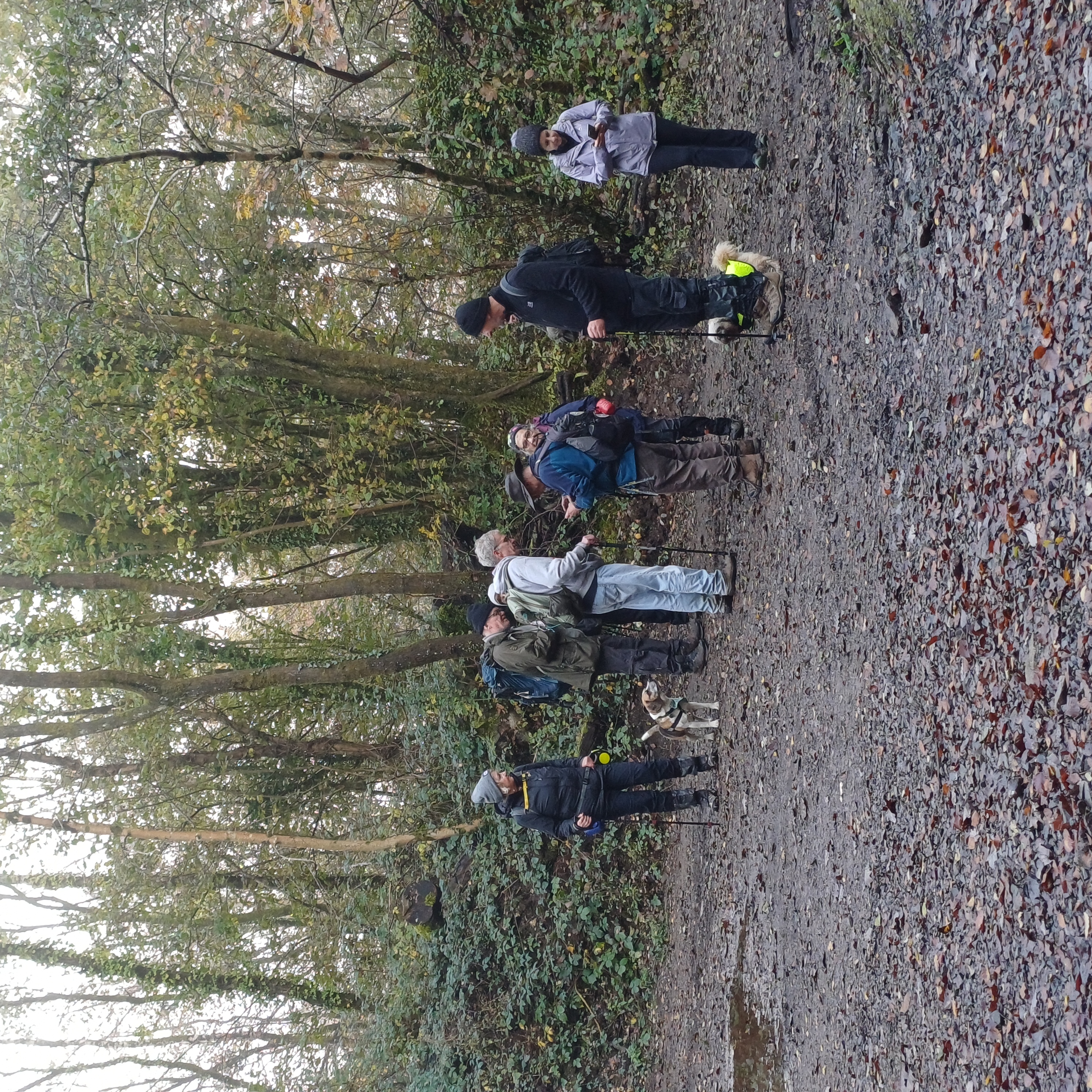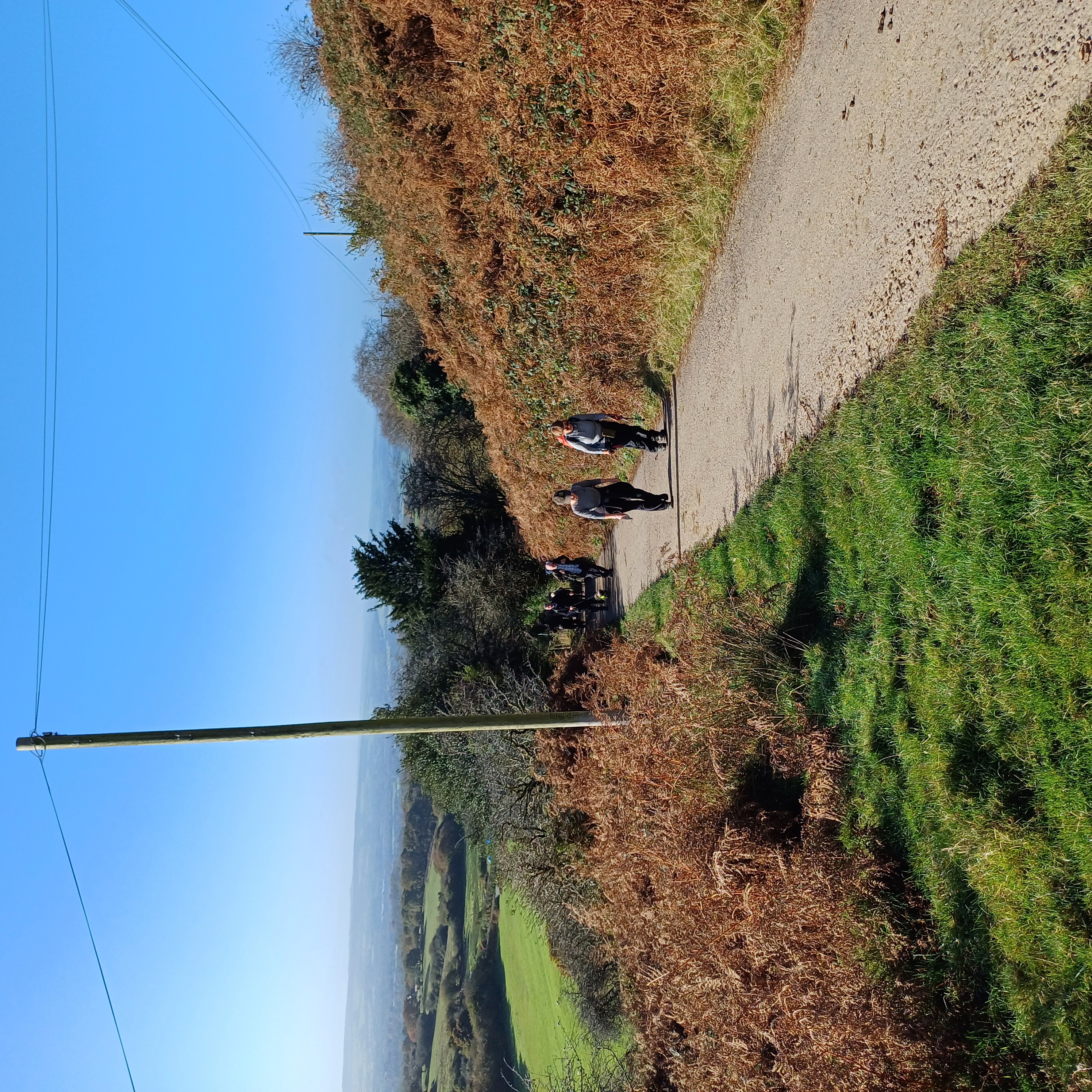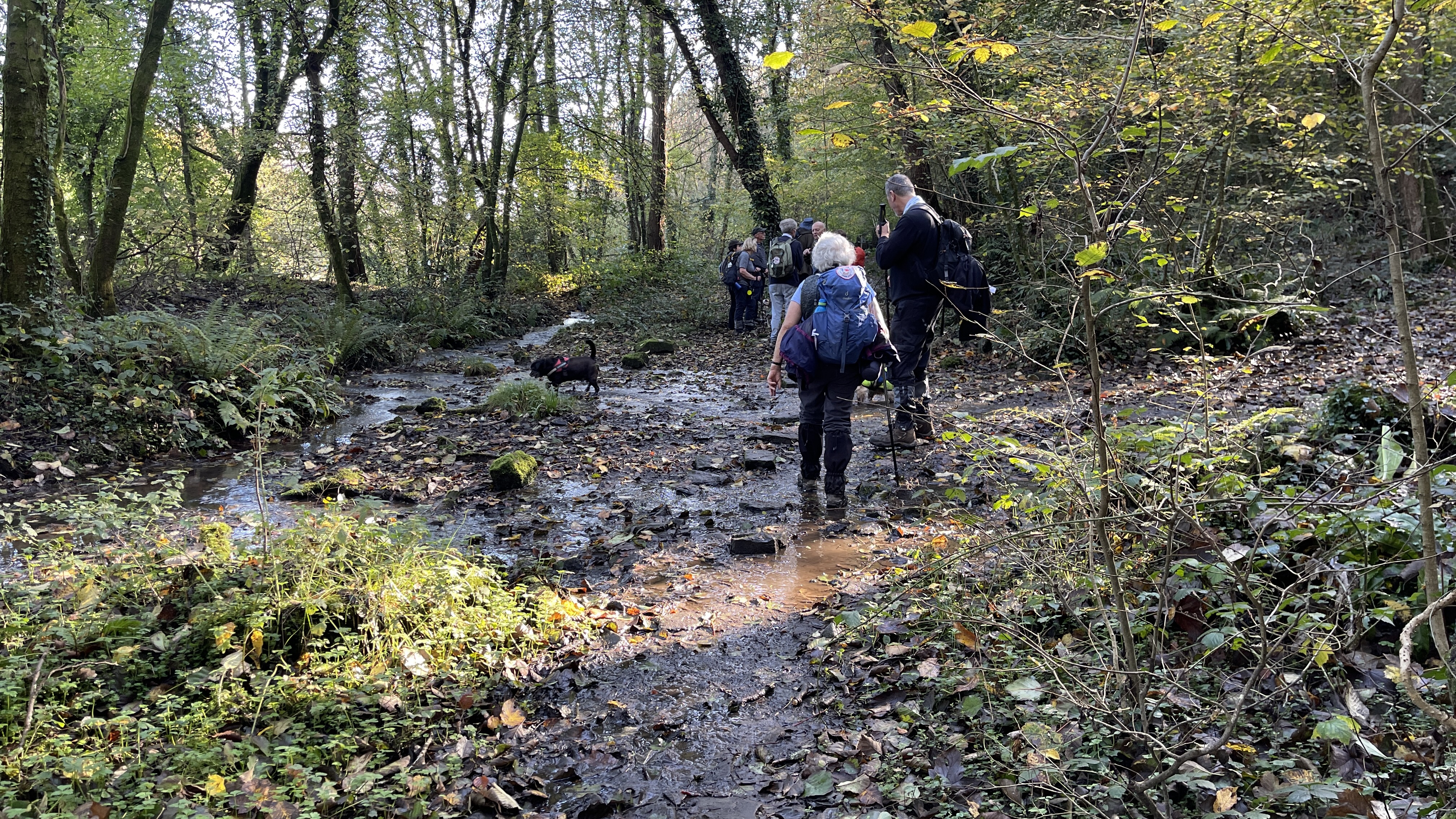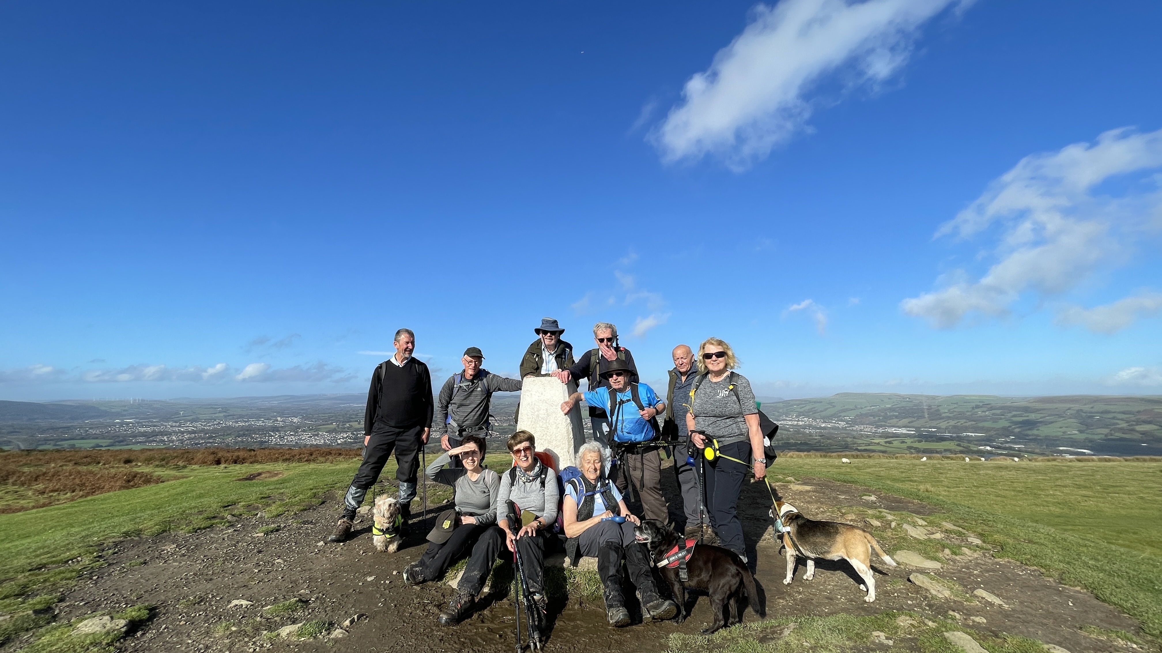Very misty weather greeted 10 hardy ramblers (including welcome guests Jackie, Sam and new member Michael) at the car park at Heol Yr Ynys car park yesterday. We started by walking along the road to Tynewydd where we used the footpath beside the road. We then crossed the road and made our way through the Coed Y Bedw nature reserve, crossing the Nant Cwmllwydrew and generally heading west. By now, the sun had burnt through the mist and blue skies and bright sunshine were at the fore. At the road, we headed northeast where we caught the Taff Ely Ridgeway walk and had our first cuppa. Suitably refreshed, we continued on, heading for our next target, the trig point on Garth Hill and the obligatory group photo. It was then north to Garth Fawr where we headed east to Lan Farm. Mud and water had always been in evidence but now it reared its ugly head big time! Mud glorious mud and paddy fields were the order of the day as we headed south but feet remained dry (and muddy) and spirits remained high as we splashed our way forward. Civilisation then loomed as we met the road and walked to the park at Taffs Well for lunch, an amazing place that I'd never visited before. Well (lol) lunched, we made our way via path and road past the new metro yard and to the start. A superb walk thanks to John for great leadership and to all for the wonderful company.