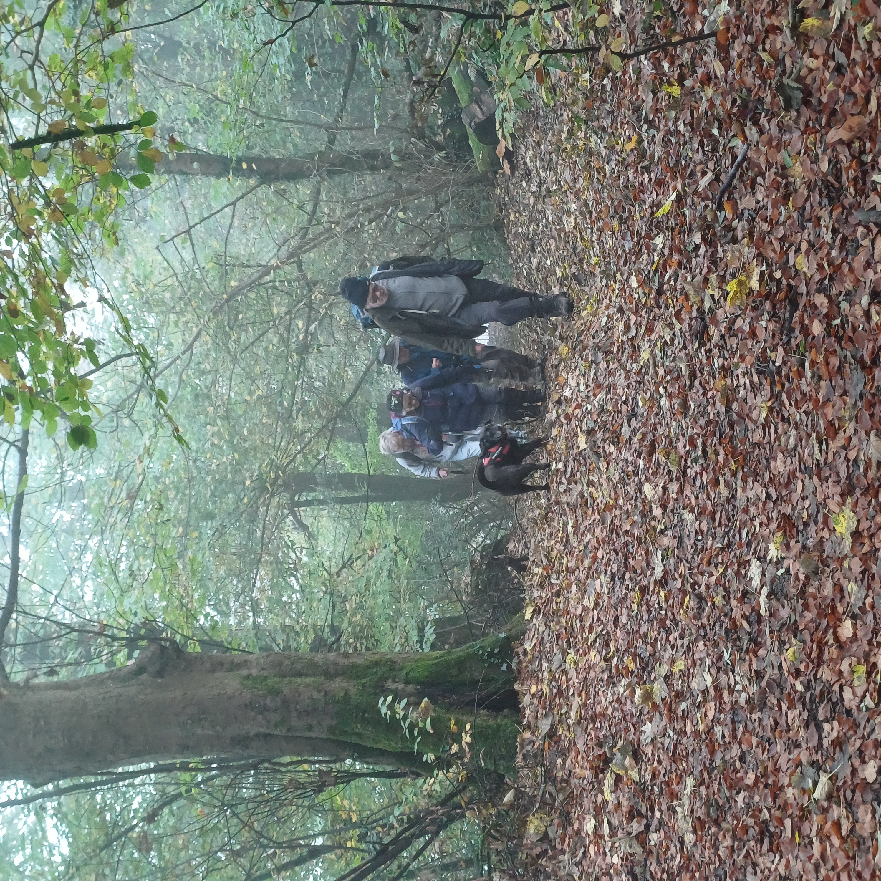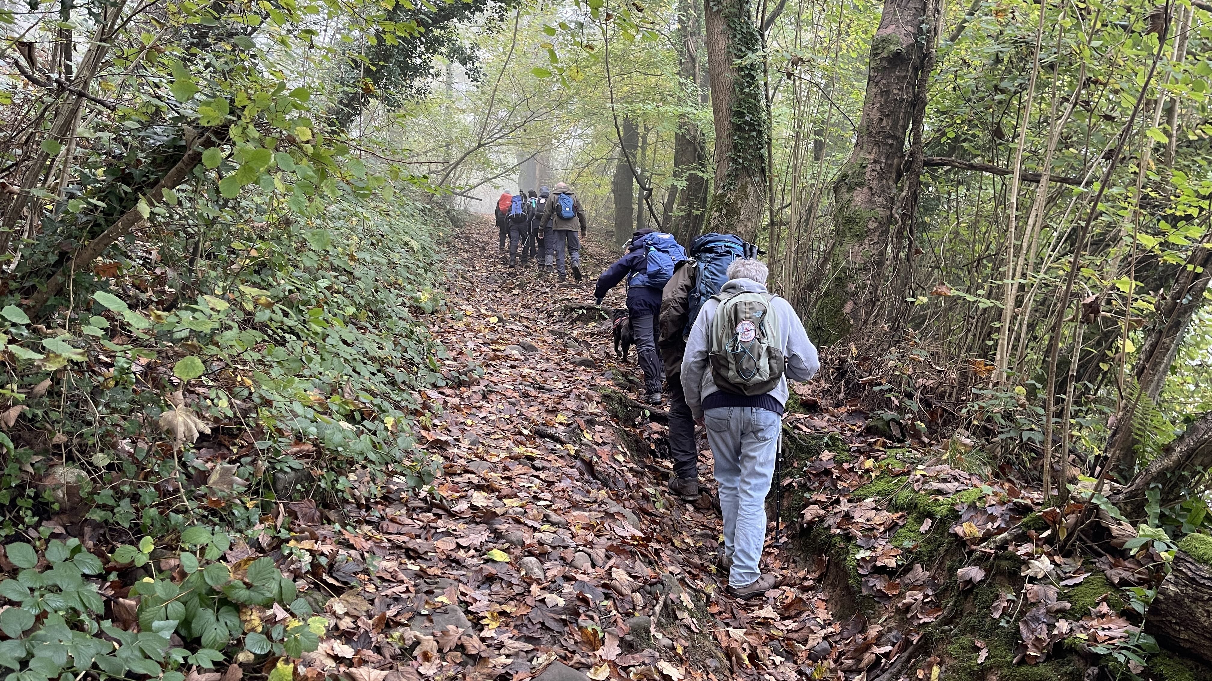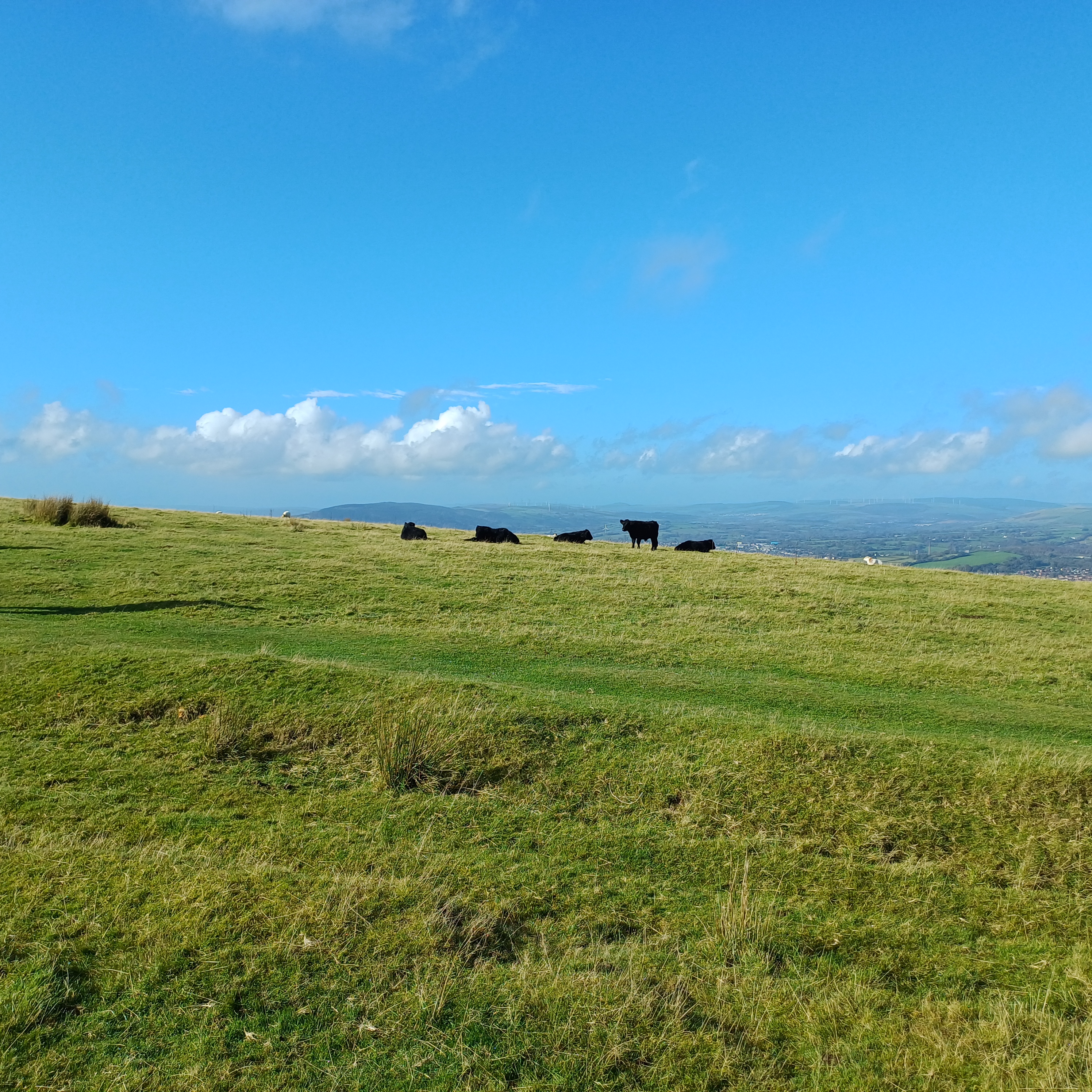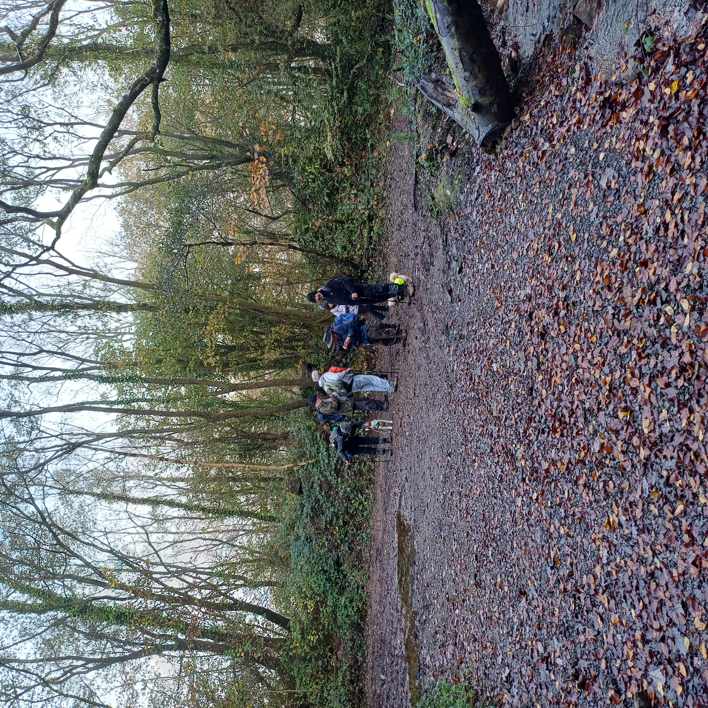 Very misty weather greeted 10 hardy ramblers (including welcome guests Jackie, Sam and new member Michael) at the car park at Heol Yr Ynys car park yesterday. We started by walking along the road to Tynewydd where we used the footpath beside the road. We then crossed the road and made our way through the Coed Y Bedw nature reserve, crossing the Nant Cwmllwydrew and generally heading west. By now, the sun had burnt through the mist and blue skies and bright sunshine were at the fore. At the road, we headed northeast where we caught the Taff Ely Ridgeway walk and had our first cuppa. Suitably refreshed, we continued on, heading for our next target, the trig point on Garth Hill and the obligatory group photo. It was then north to Garth Fawr where we headed east to Lan Farm. Mud and water had always been in evidence but now it reared its ugly head big time! Mud glorious mud and paddy fields were the order of the day as we headed south but feet remained dry (and muddy) and spirits remained high as we splashed our way forward. Civilisation then loomed as we met the road and walked to the park at Taffs Well for lunch, an amazing place that I'd never visited before. Well (lol) lunched, we made our way via path and road past the new metro yard and to the start. A superb walk thanks to John for great leadership and to all for the wonderful company.