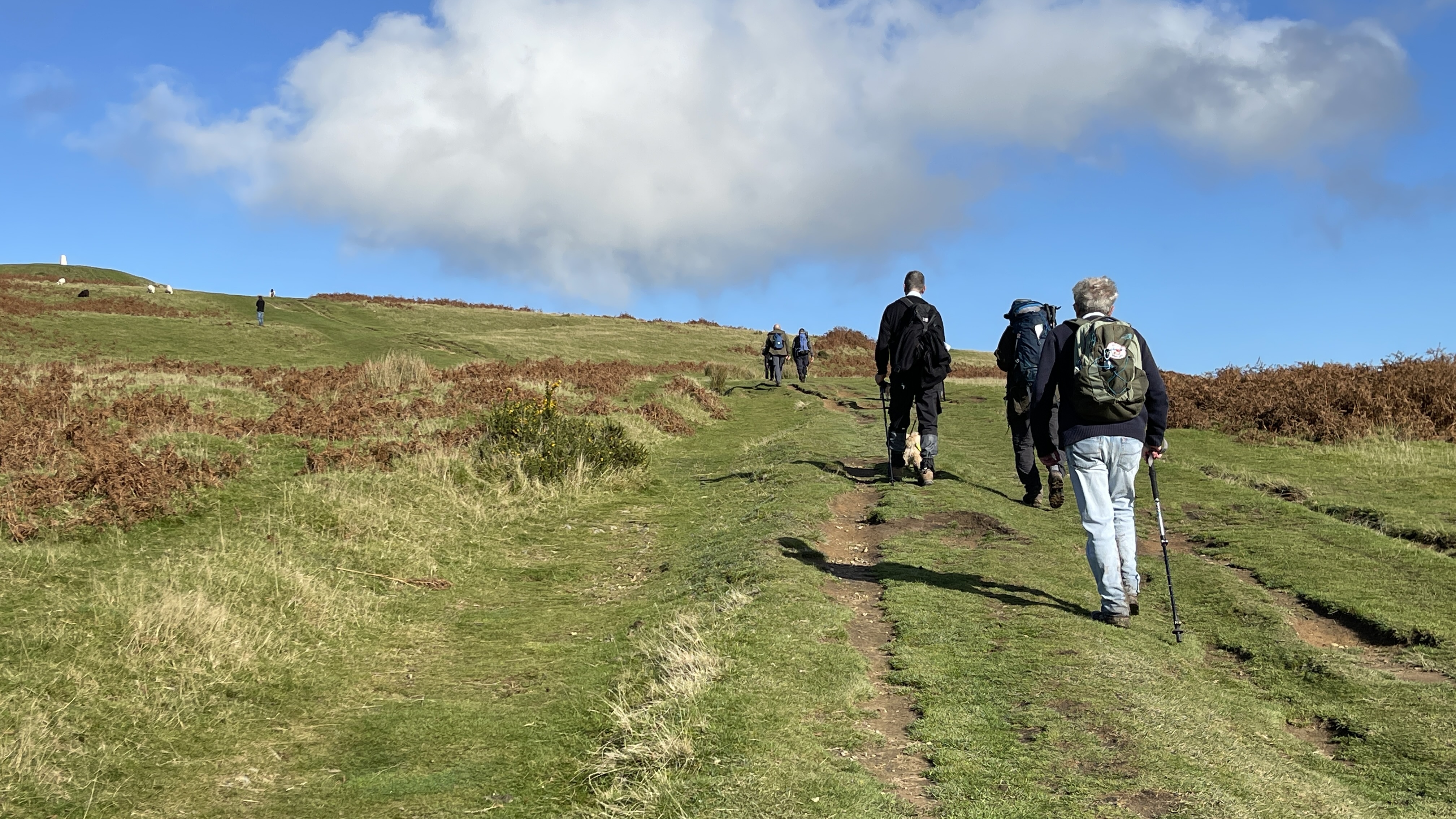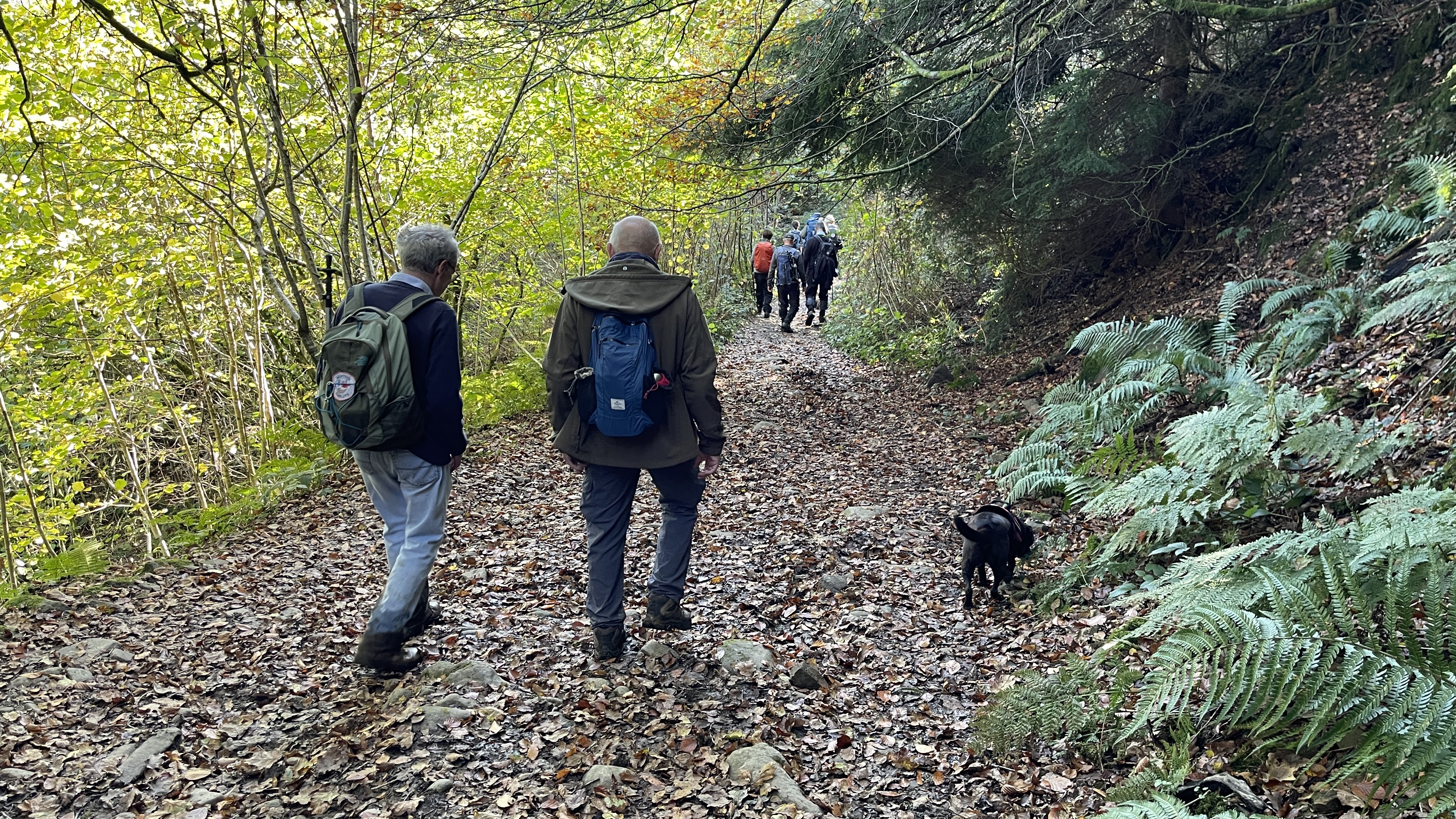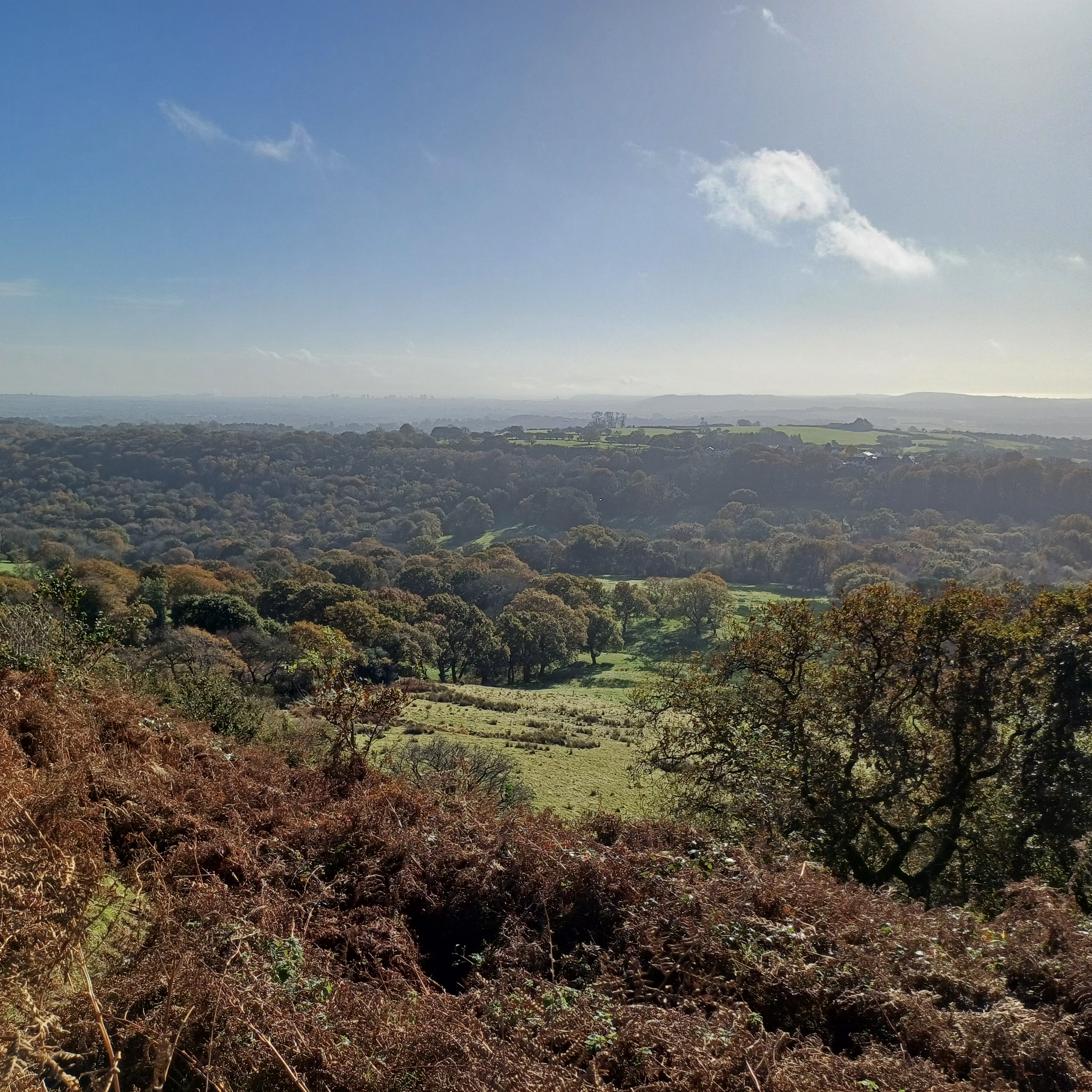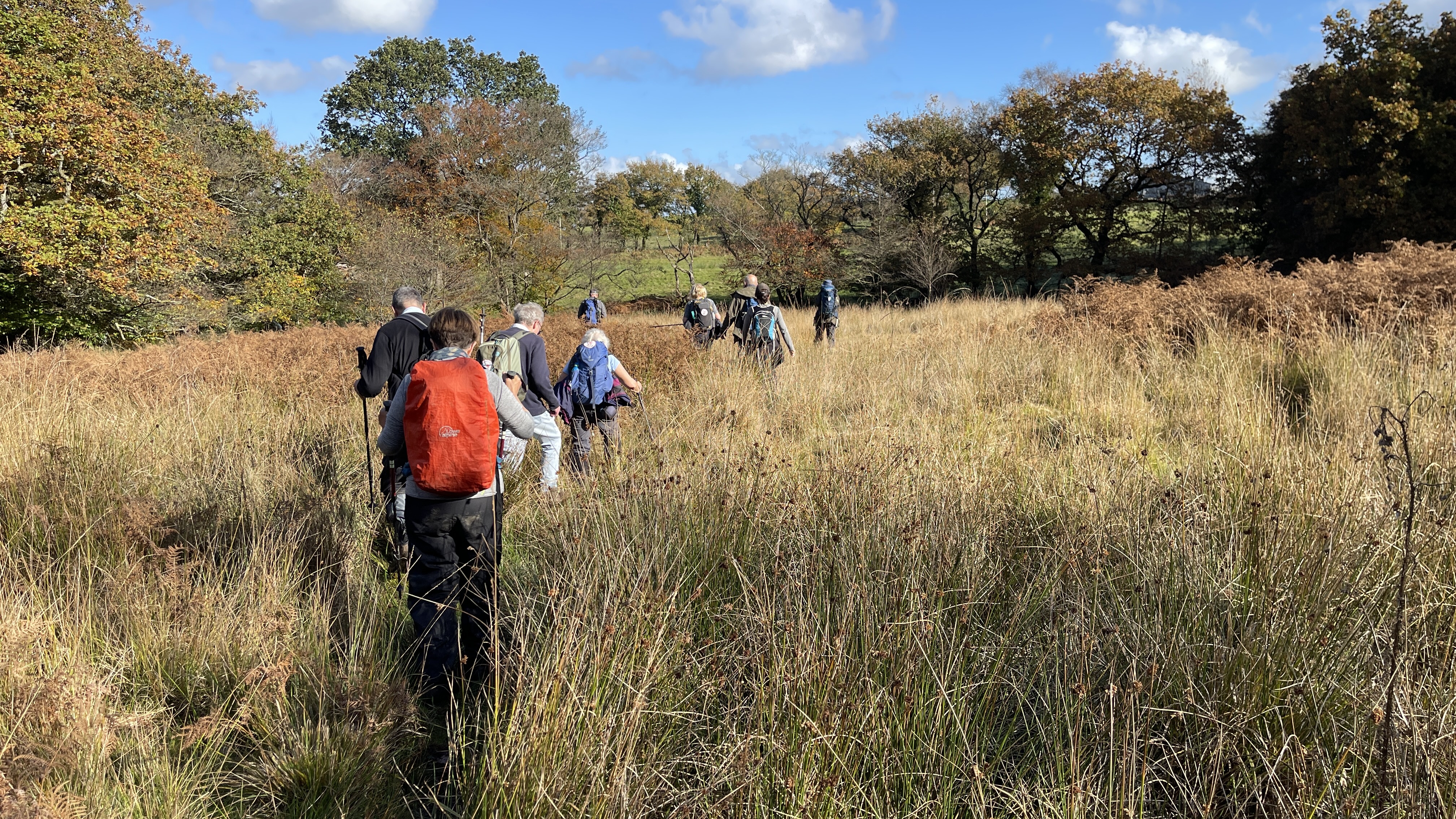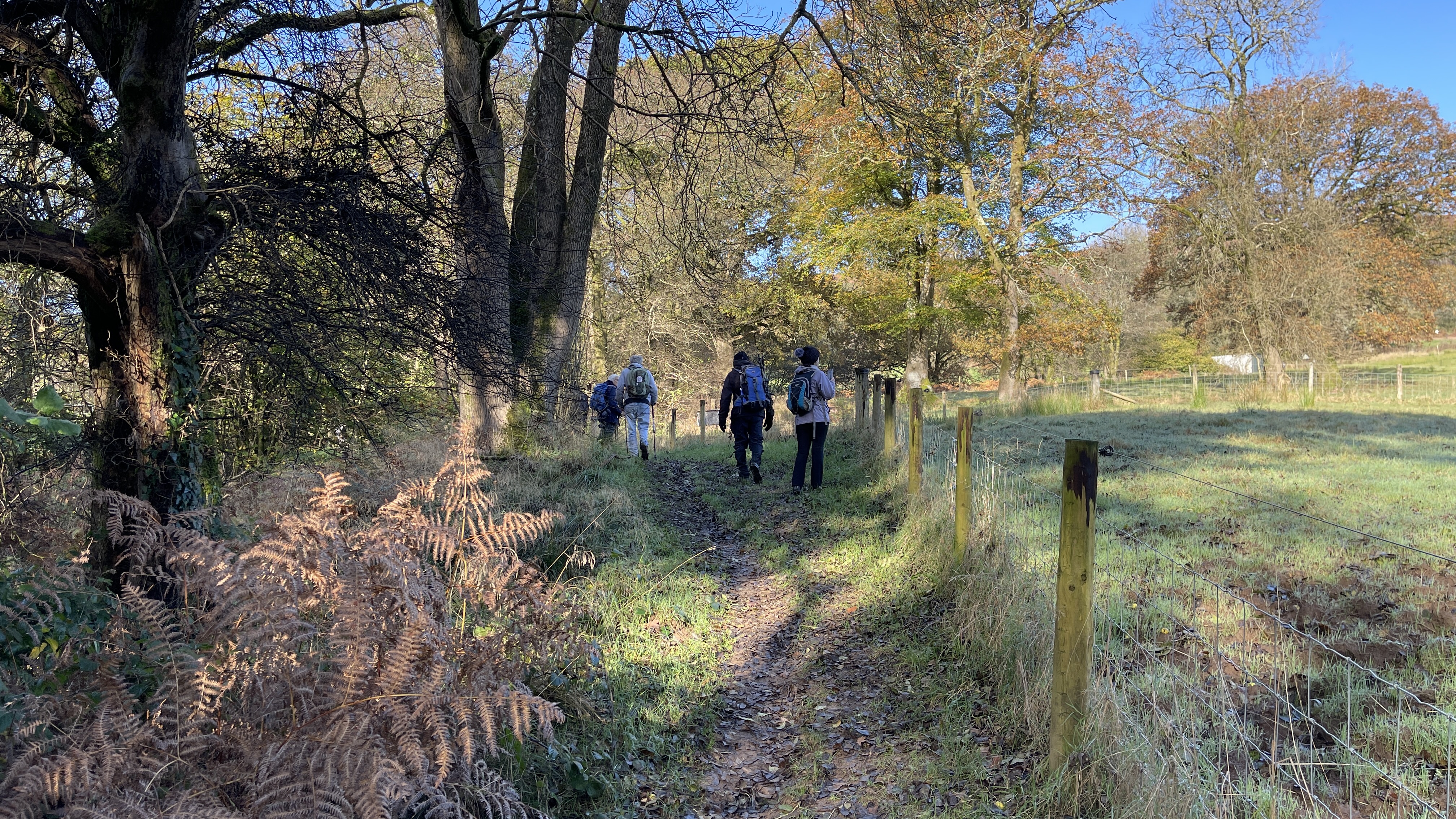 Very misty weather greeted 10 hardy ramblers (including welcome guests Jackie, Sam and new member Michael) at the car park at Heol Yr Ynys car park yesterday. We started by walking along the road to Tynewydd where we used the footpath beside the road. We then crossed the road and made our way through the Coed Y Bedw nature reserve, crossing the Nant Cwmllwydrew and generally heading west. By now, the sun had burnt through the mist and blue skies and bright sunshine were at the fore. At the road, we headed northeast where we caught the Taff Ely Ridgeway walk and had our first cuppa. Suitably refreshed, we continued on, heading for our next target, the trig point on Garth Hill and the obligatory group photo. It was then north to Garth Fawr where we headed east to Lan Farm. Mud and water had always been in evidence but now it reared its ugly head big time! Mud glorious mud and paddy fields were the order of the day as we headed south but feet remained dry (and muddy) and spirits remained high as we splashed our way forward. Civilisation then loomed as we met the road and walked to the park at Taffs Well for lunch, an amazing place that I'd never visited before. Well (lol) lunched, we made our way via path and road past the new metro yard and to the start. A superb walk thanks to John for great leadership and to all for the wonderful company.