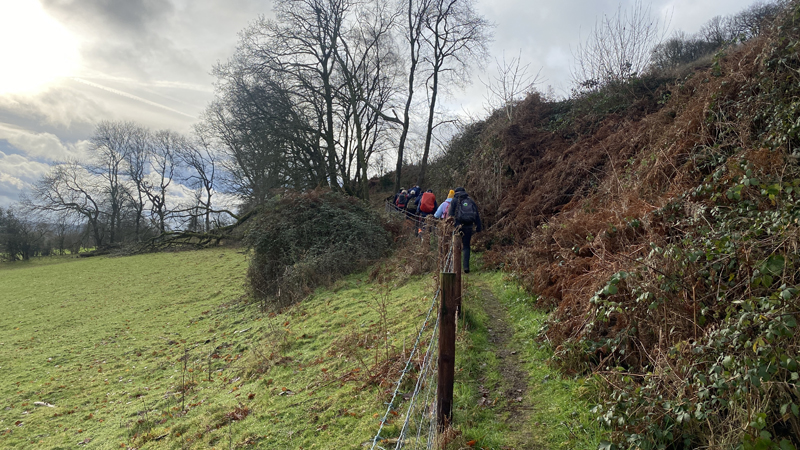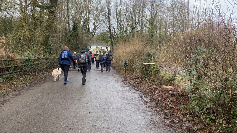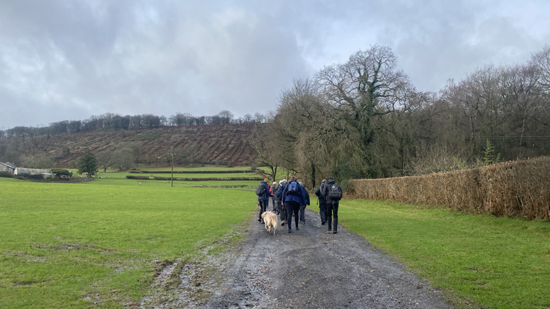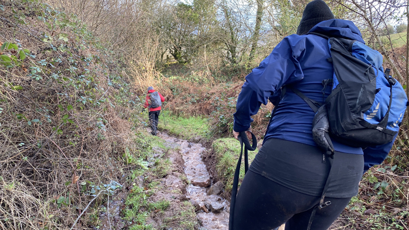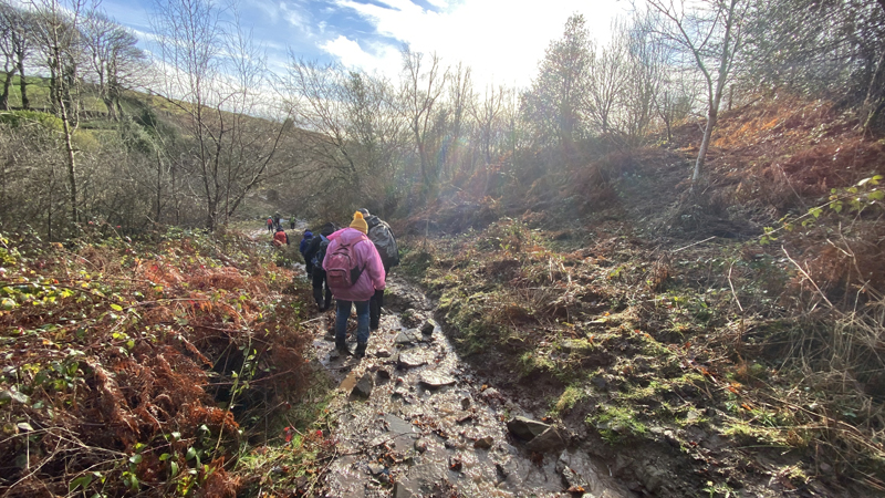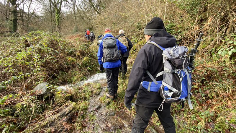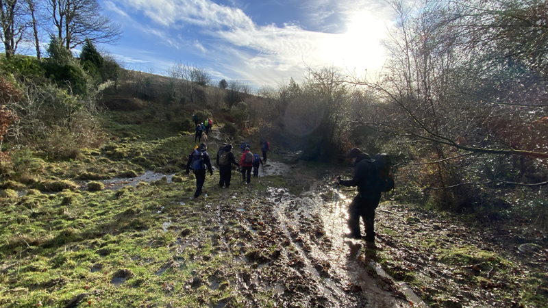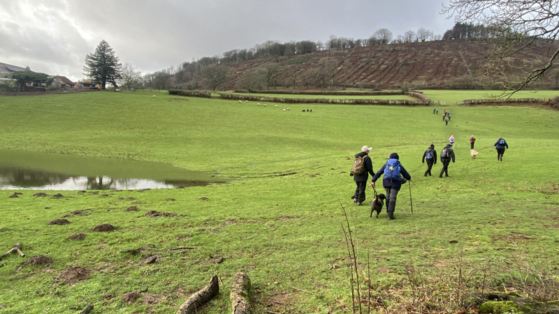 Goitre Wharf welcomed 18 hardy Merthyr Valley Ramblers (including welcome guests Gillian, Hillary and Michael) on today’s 9.5 mile walk. In cold but mainly dry weather, we made our way past Pentre farm to the base of Pentre hill then headed South to the Holy Well and a welcome cuppa a little further on. Then, we headed South West between Mynydd Garn-wen and Drain eos along muddy and waterlogged paths to Tir-croes Bleddyn where we had lunch. We silver surfers then paddled down the running river Roman road (see video and pictures) East to the welcome turnoff and headed North past Lambrook to turn Eastward and cross-country to the canal. It was then flat all the way back to the start. Ten stiles and uncounted streams forded made this a challenging but ultimately satisfying walk, well led by John and the great company, who’s spirits never wavered - well done all!