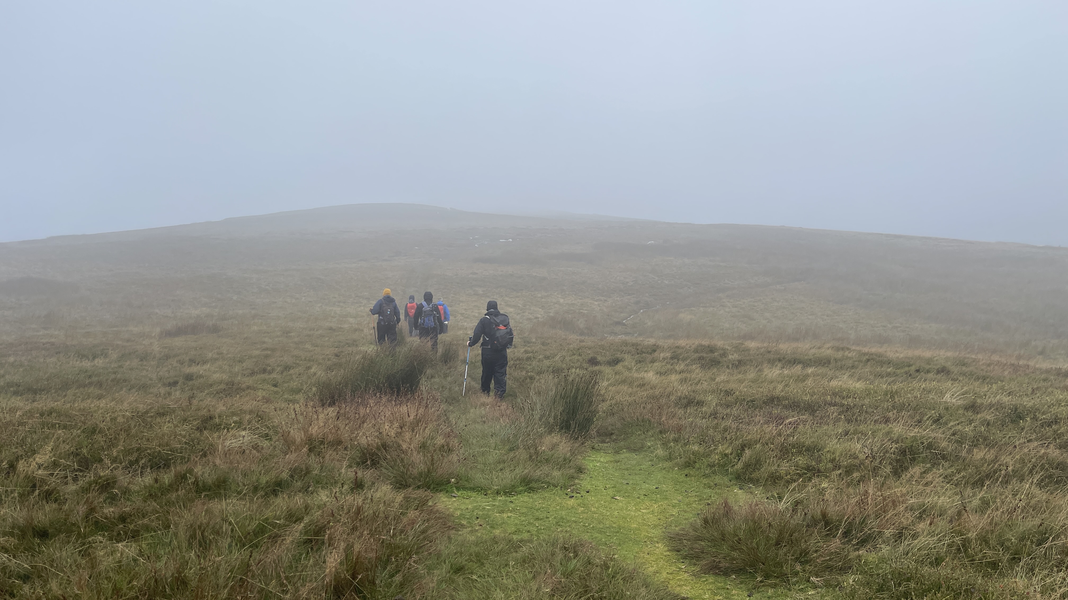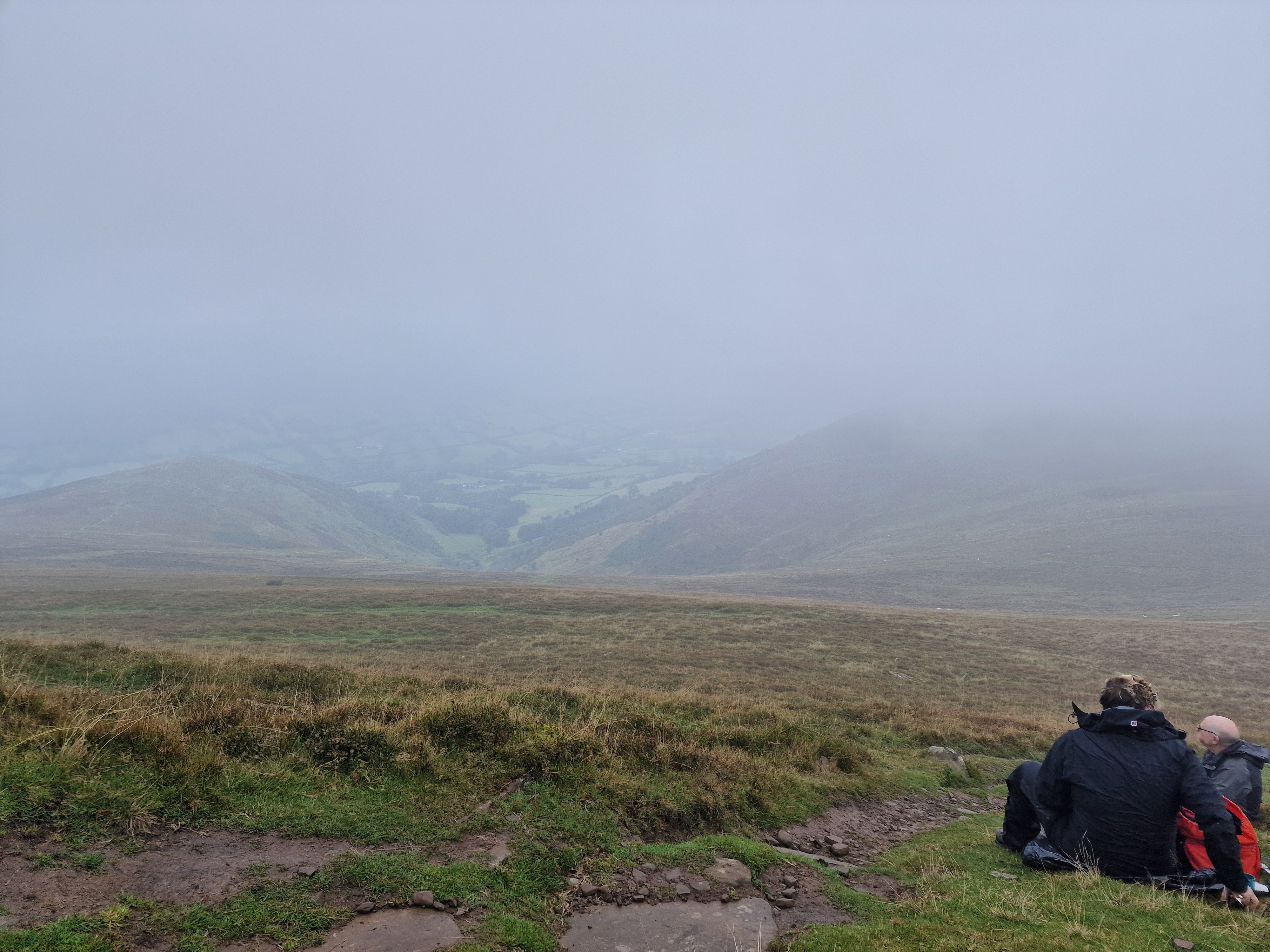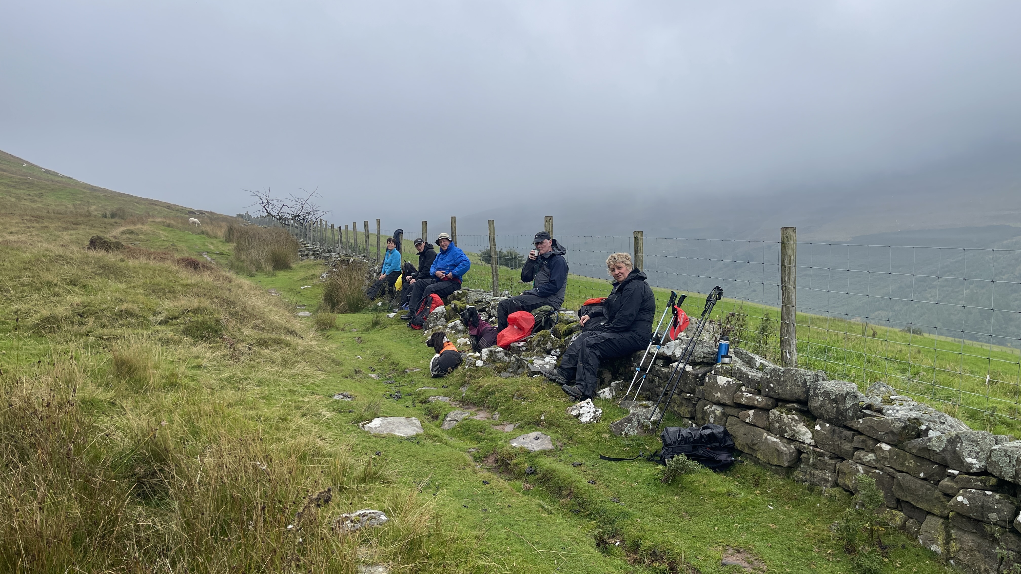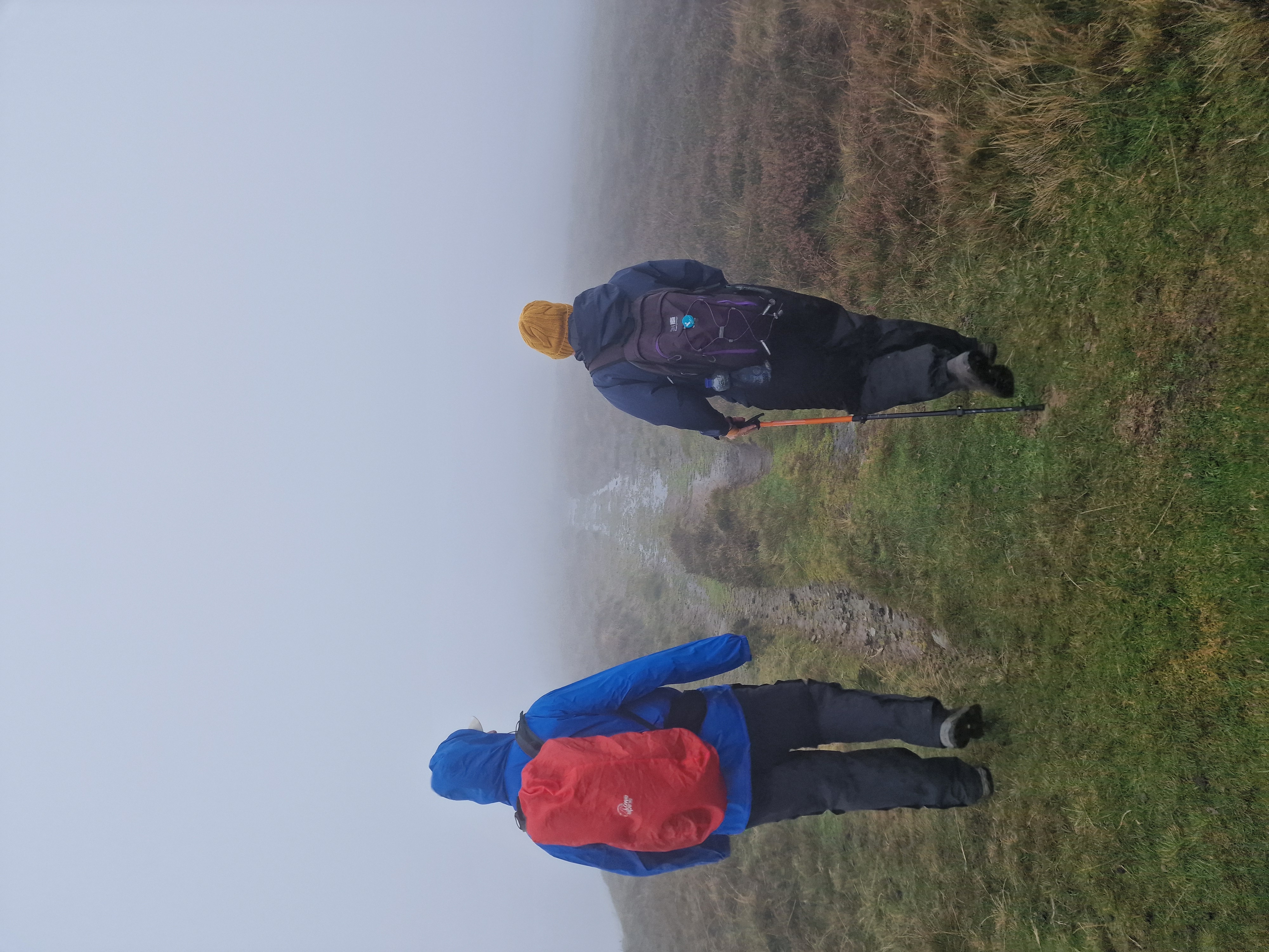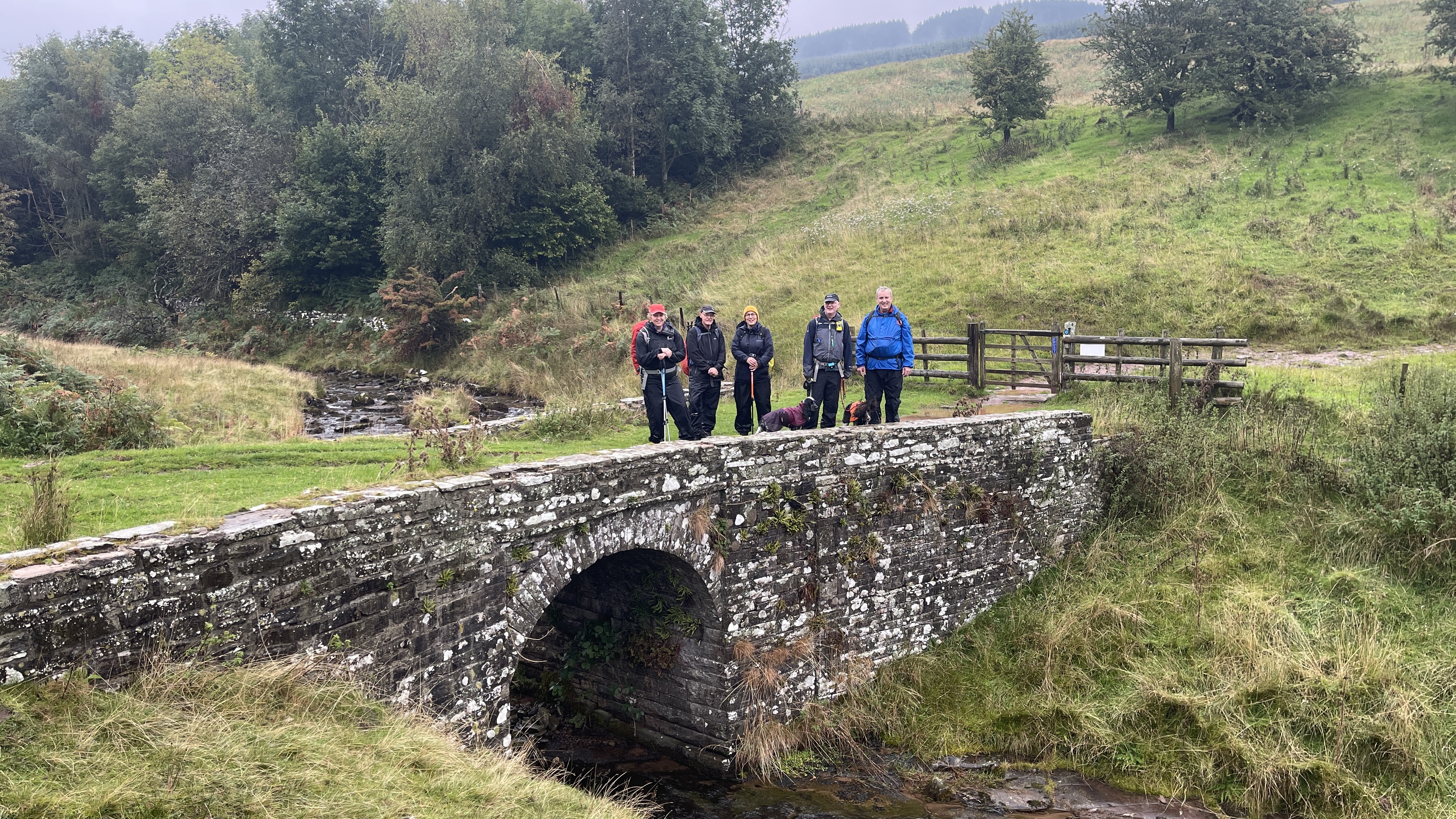 What an incredible day leading the Merthyr Valley Ramblers deep into the Black Mountains! Our journey began at The Hermitage, a secluded historical gem nestled in the Grwyne Valley. Originally built in the 18th century, The Hermitage was once a serene retreat, now a picturesque ruin surrounded by nature. Ordinarily, we would have crossed the ford and explored the ruins, but with the water level higher than usual and slippery rocks, we opted for a safer route towards the Grwyne Valley. The rain initially seemed relentless, but it soon subsided, leaving us with near-perfect walking conditions. We paused for a group photo on the Tal-y-maes bridge, a charming structure on the historic Macnamara's Road. From there, we began our slow and steady ascent up the valley. Heading towards Pen Trumau and the Cambrian Way path, we soon changed direction towards our highest point of the day, Mynydd Llysiau. The wind was fierce on the approach, but once on the sheltered side, we enjoyed an early lunch break. The mist was heavy, limiting our views, but we caught fleeting glimpses of the Dragon's Back and beyond. Our journey continued southward towards Pen Twyn Glas, passing the disused quarry and cairn. We encountered a young couple embarking on a 12-mile hike, a rare sight as we had only seen one other person all day! Finally, we descended to the farmyard at Pentwyn and picked up the lane back to our starting point.