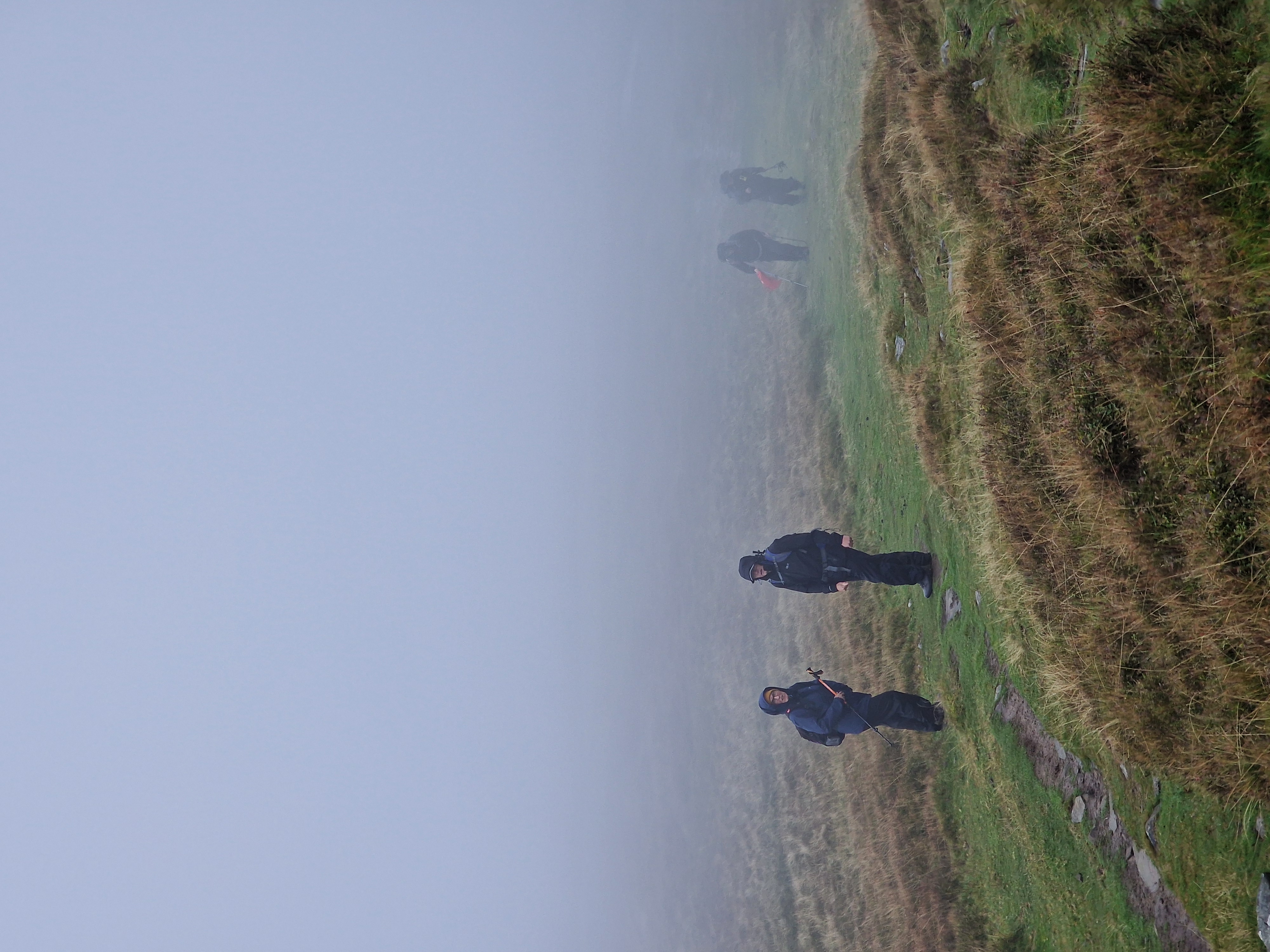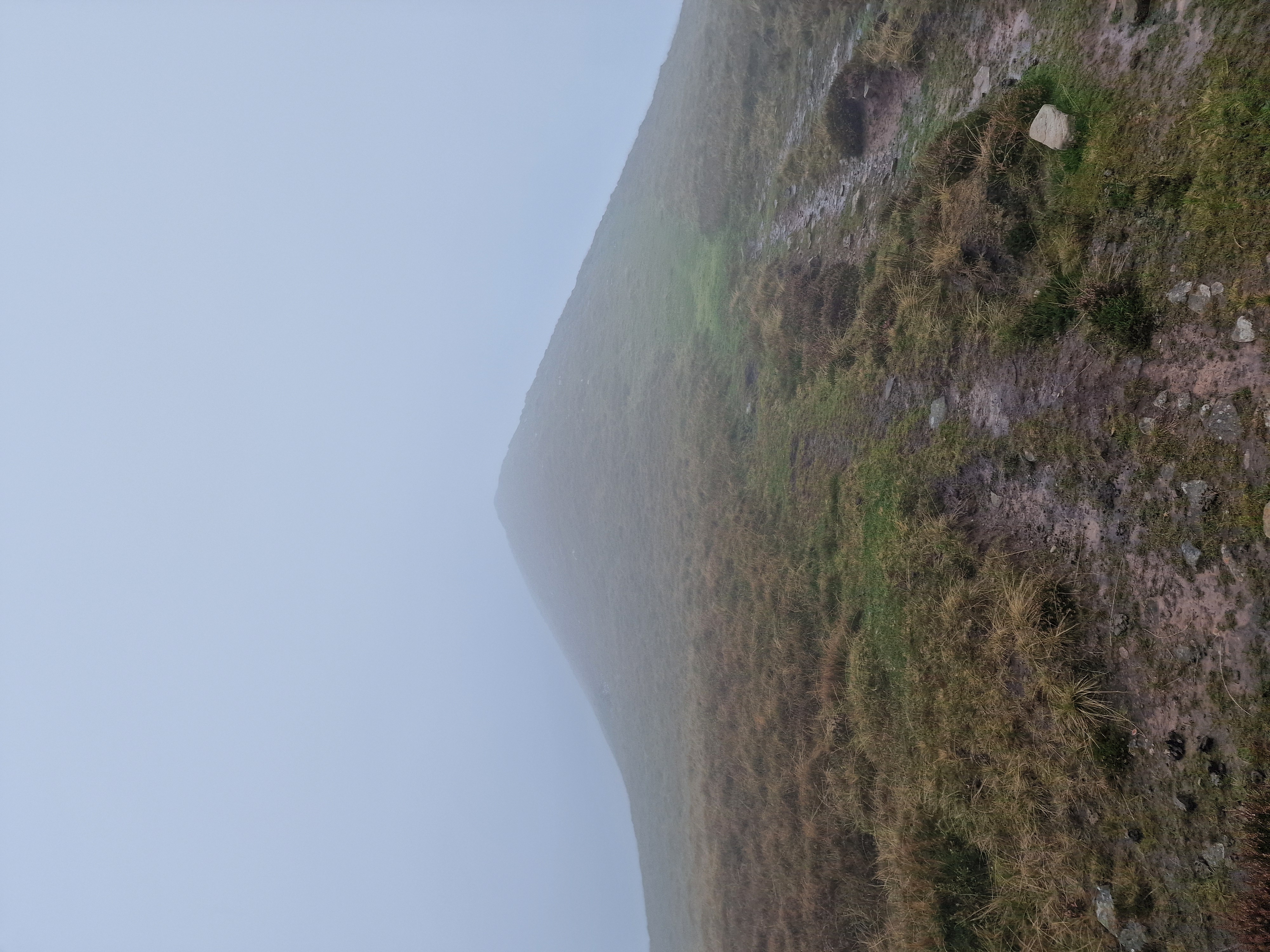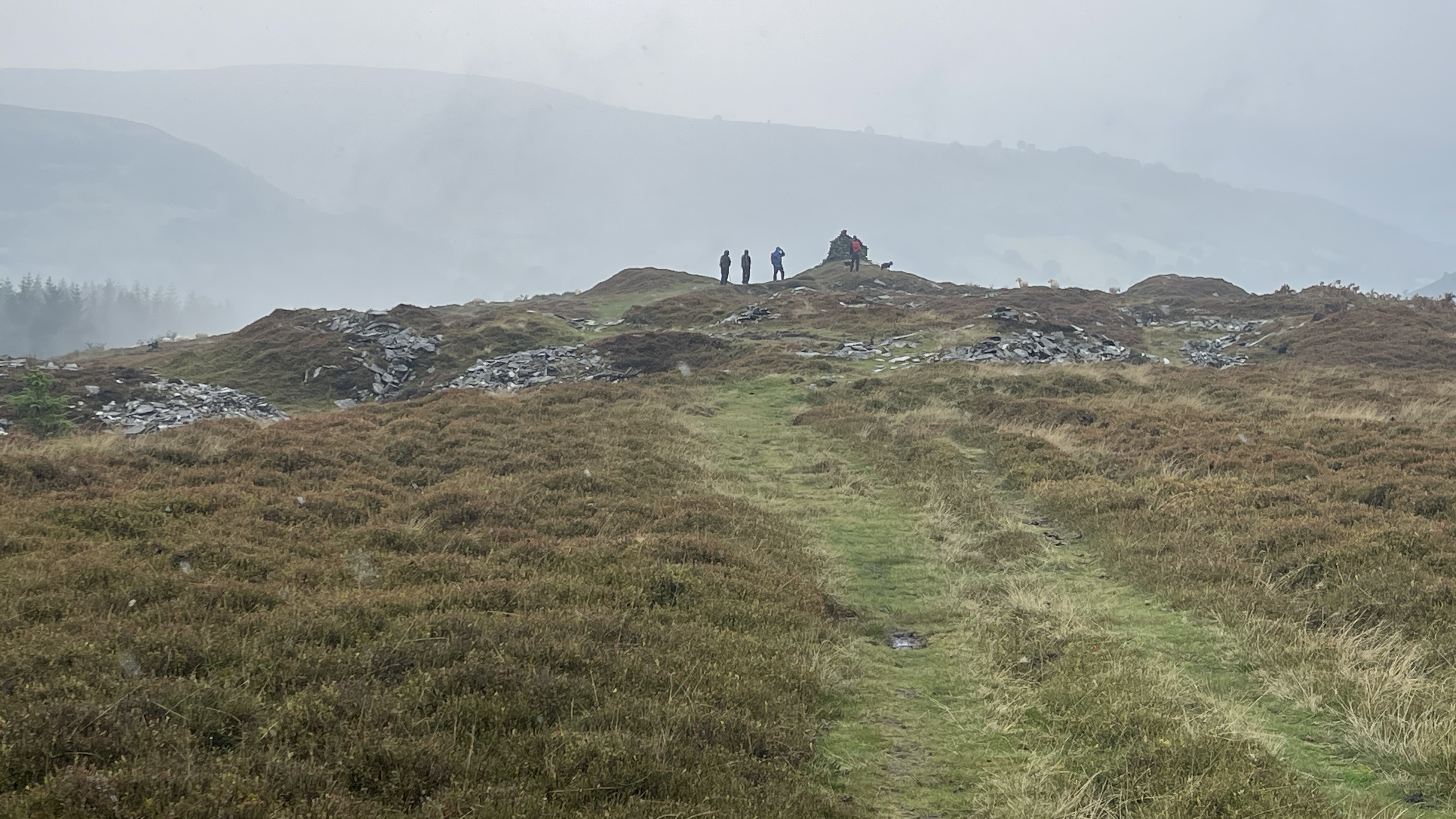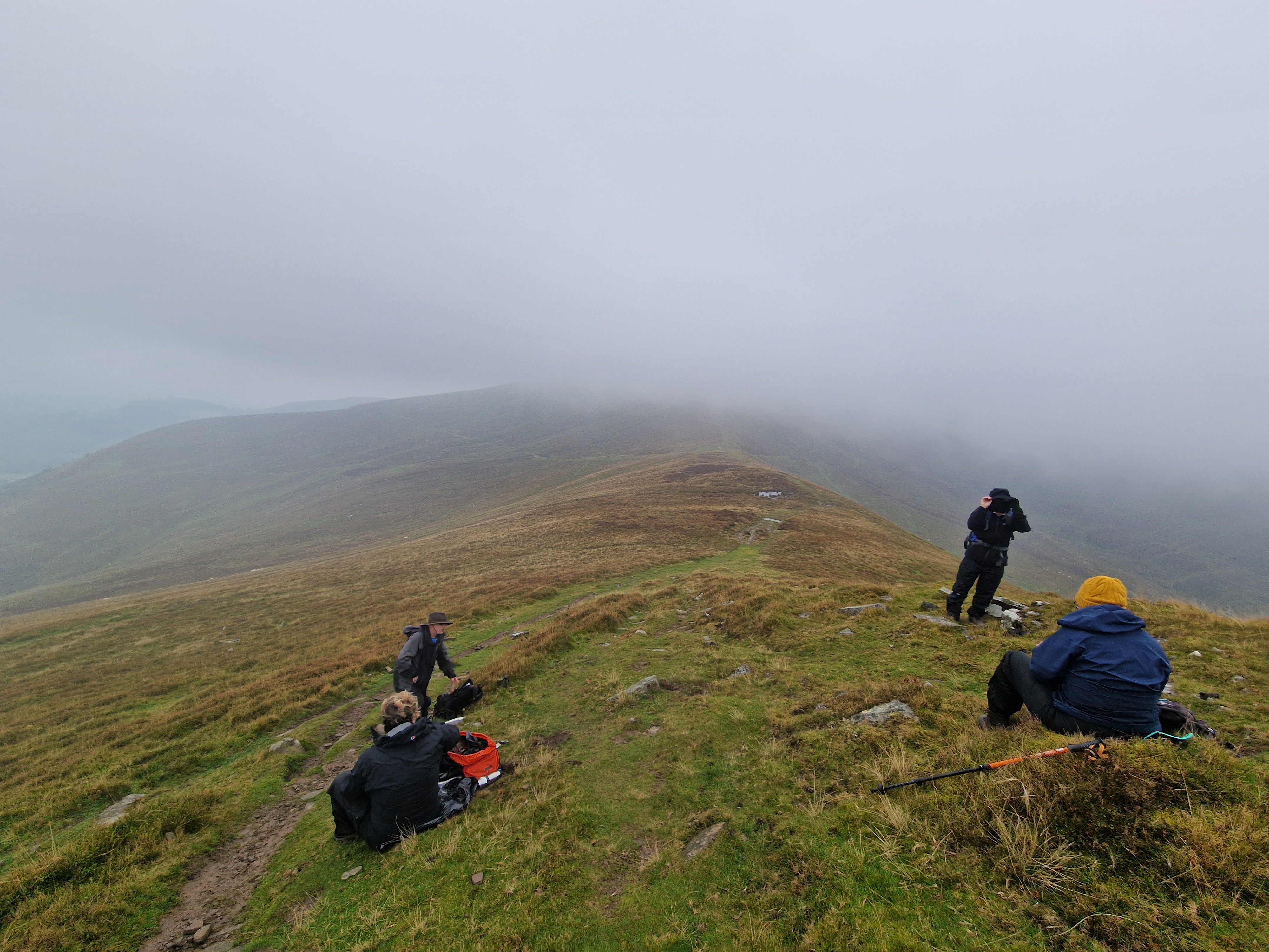 What an incredible day leading the Merthyr Valley Ramblers deep into the Black Mountains! Our journey began at The Hermitage, a secluded historical gem nestled in the Grwyne Valley. Originally built in the 18th century, The Hermitage was once a serene retreat, now a picturesque ruin surrounded by nature. Ordinarily, we would have crossed the ford and explored the ruins, but with the water level higher than usual and slippery rocks, we opted for a safer route towards the Grwyne Valley. The rain initially seemed relentless, but it soon subsided, leaving us with near-perfect walking conditions. We paused for a group photo on the Tal-y-maes bridge, a charming structure on the historic Macnamara's Road. From there, we began our slow and steady ascent up the valley. Heading towards Pen Trumau and the Cambrian Way path, we soon changed direction towards our highest point of the day, Mynydd Llysiau. The wind was fierce on the approach, but once on the sheltered side, we enjoyed an early lunch break. The mist was heavy, limiting our views, but we caught fleeting glimpses of the Dragon's Back and beyond. Our journey continued southward towards Pen Twyn Glas, passing the disused quarry and cairn. We encountered a young couple embarking on a 12-mile hike, a rare sight as we had only seen one other person all day! Finally, we descended to the farmyard at Pentwyn and picked up the lane back to our starting point.