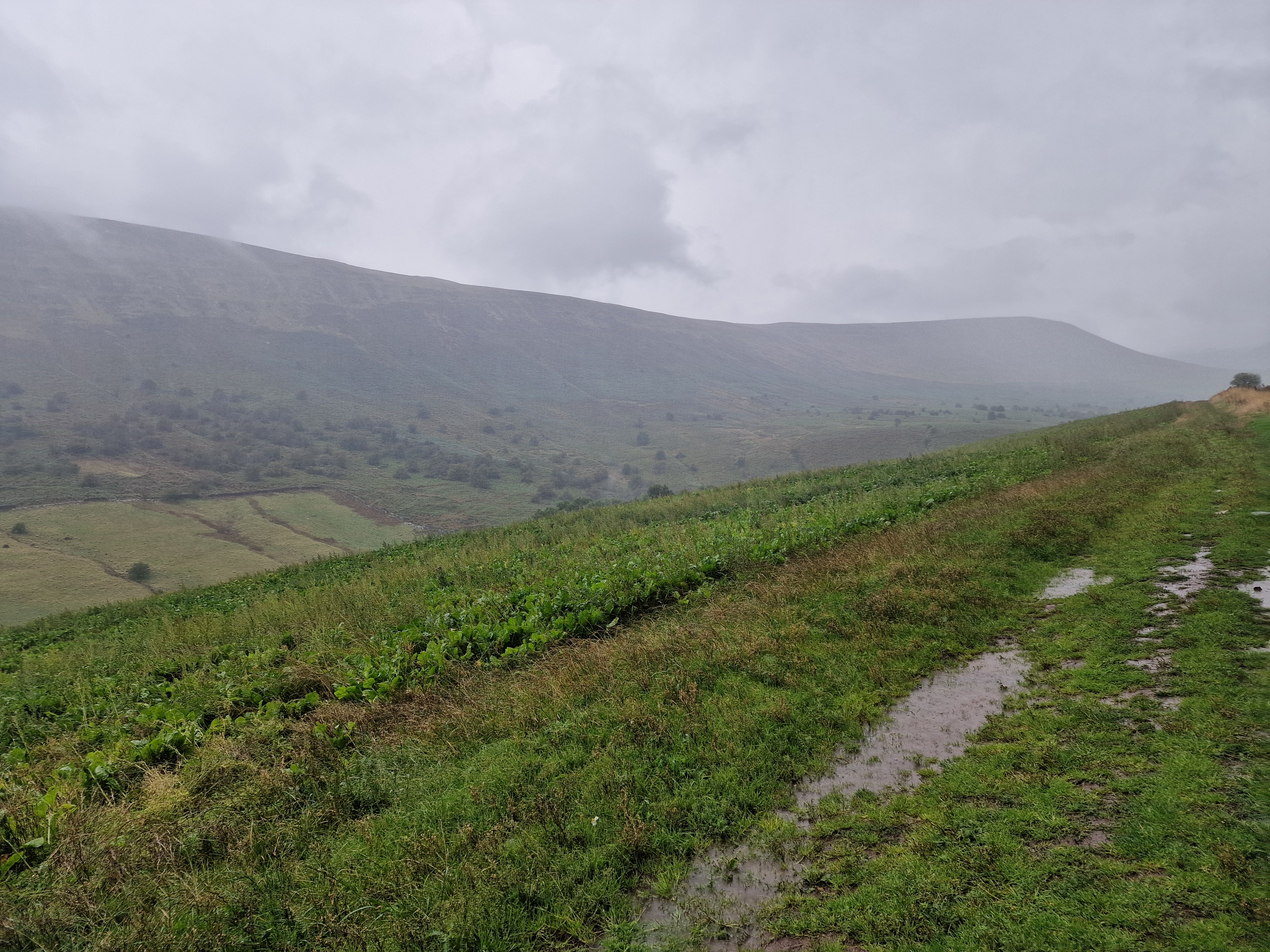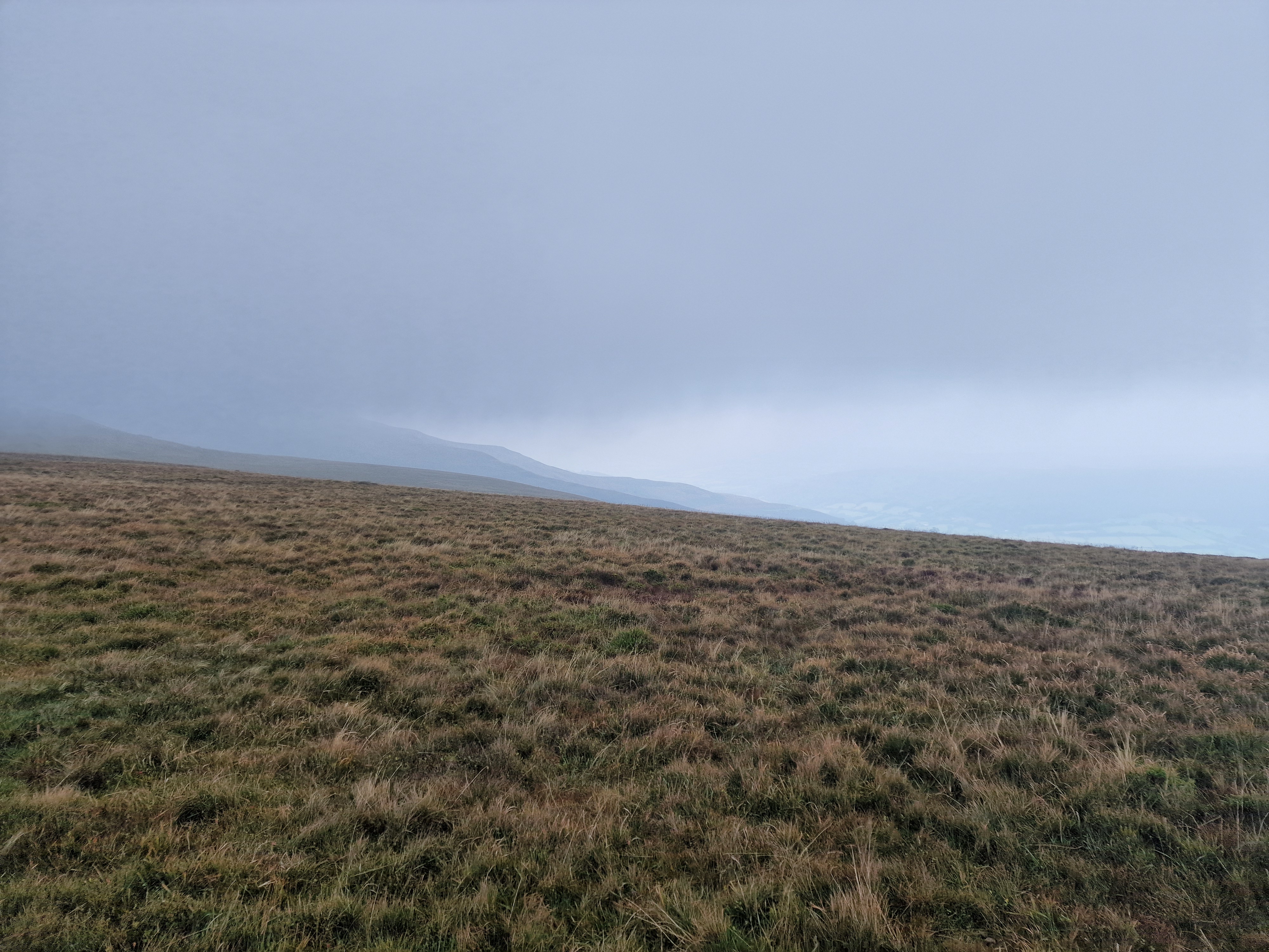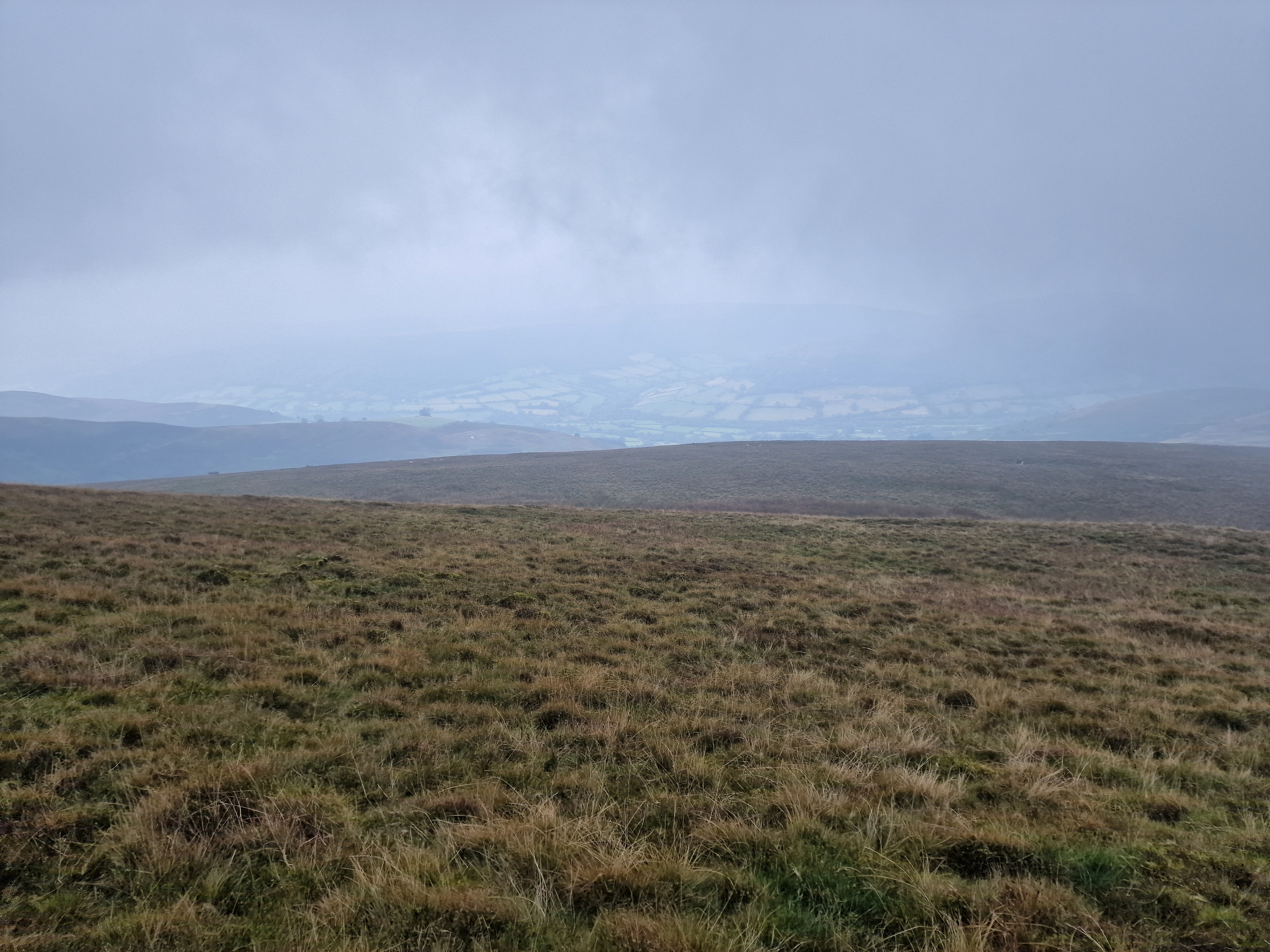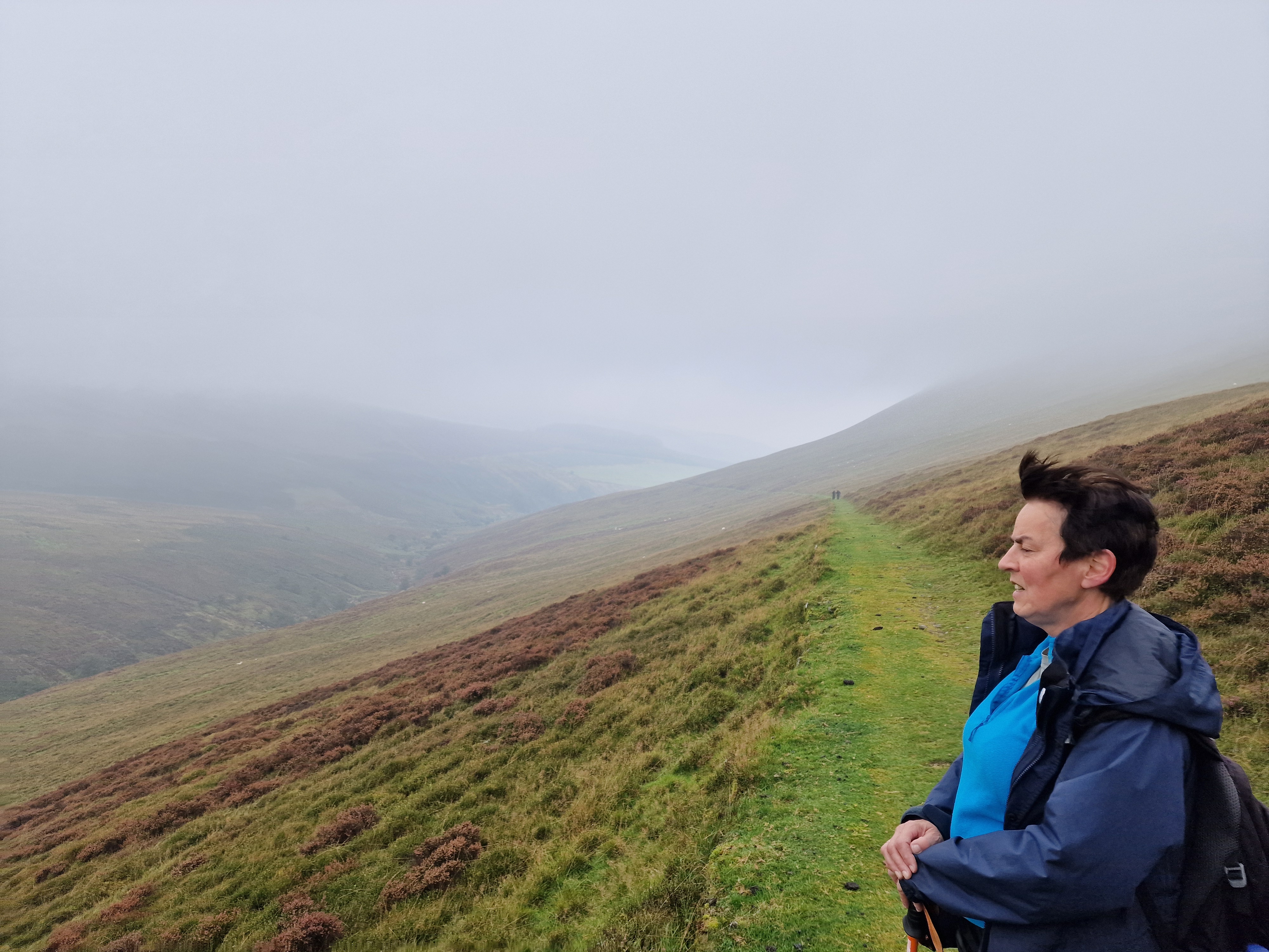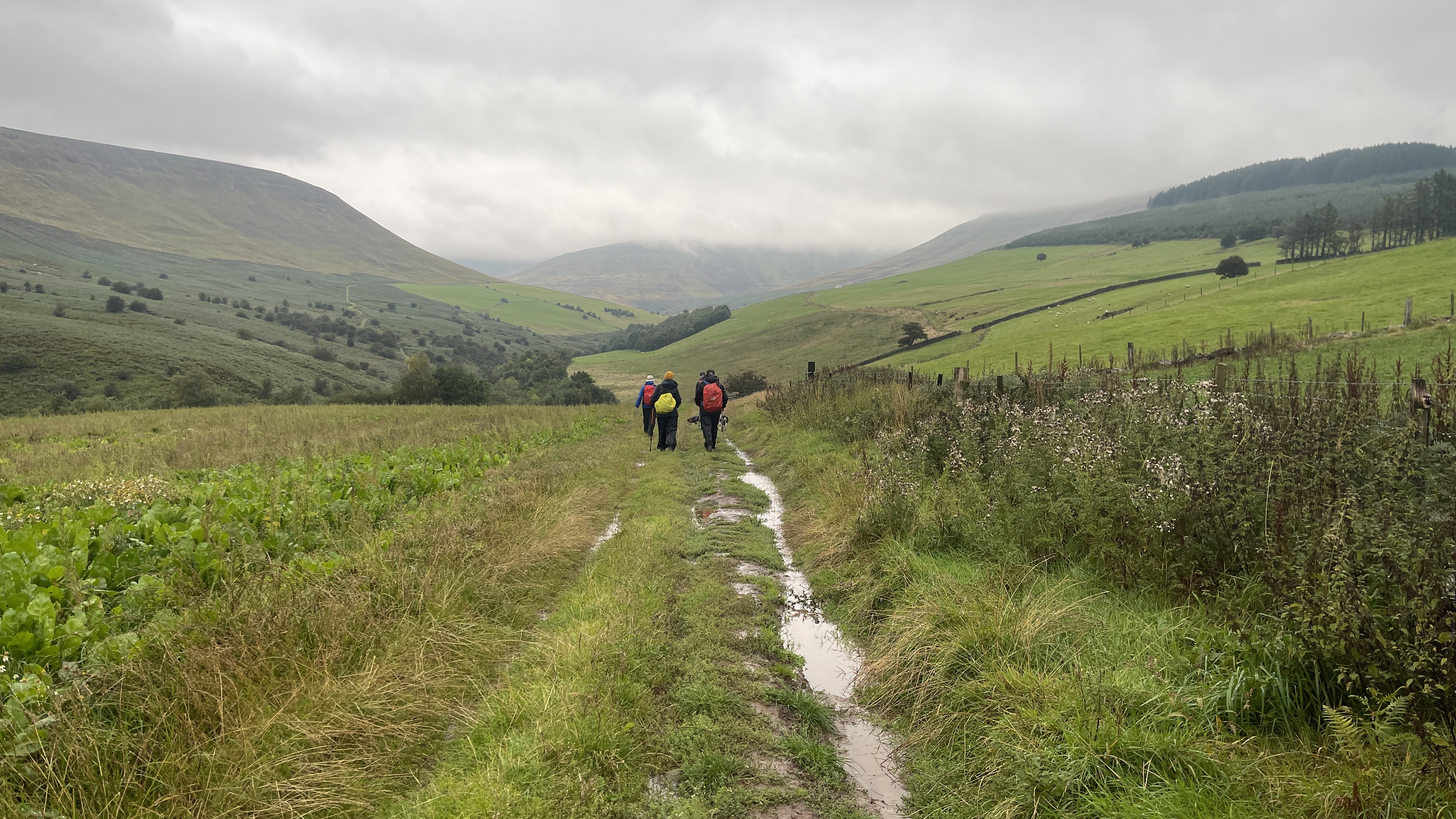 What an incredible day leading the Merthyr Valley Ramblers deep into the Black Mountains! Our journey began at The Hermitage, a secluded historical gem nestled in the Grwyne Valley. Originally built in the 18th century, The Hermitage was once a serene retreat, now a picturesque ruin surrounded by nature. Ordinarily, we would have crossed the ford and explored the ruins, but with the water level higher than usual and slippery rocks, we opted for a safer route towards the Grwyne Valley. The rain initially seemed relentless, but it soon subsided, leaving us with near-perfect walking conditions. We paused for a group photo on the Tal-y-maes bridge, a charming structure on the historic Macnamara's Road. From there, we began our slow and steady ascent up the valley. Heading towards Pen Trumau and the Cambrian Way path, we soon changed direction towards our highest point of the day, Mynydd Llysiau. The wind was fierce on the approach, but once on the sheltered side, we enjoyed an early lunch break. The mist was heavy, limiting our views, but we caught fleeting glimpses of the Dragon's Back and beyond. Our journey continued southward towards Pen Twyn Glas, passing the disused quarry and cairn. We encountered a young couple embarking on a 12-mile hike, a rare sight as we had only seen one other person all day! Finally, we descended to the farmyard at Pentwyn and picked up the lane back to our starting point.