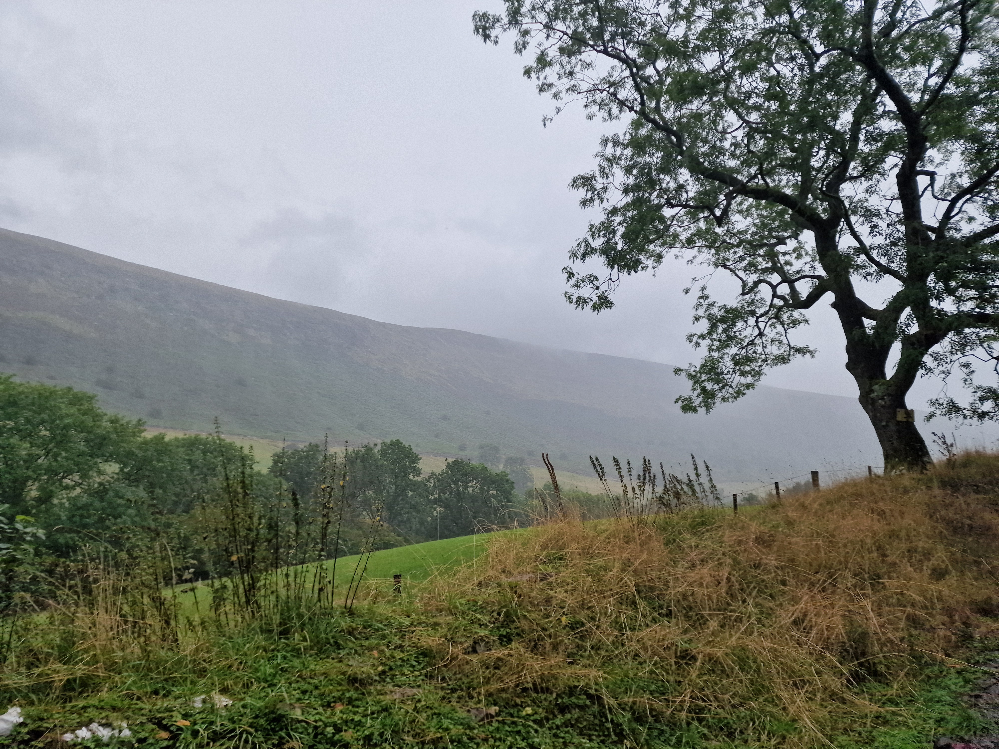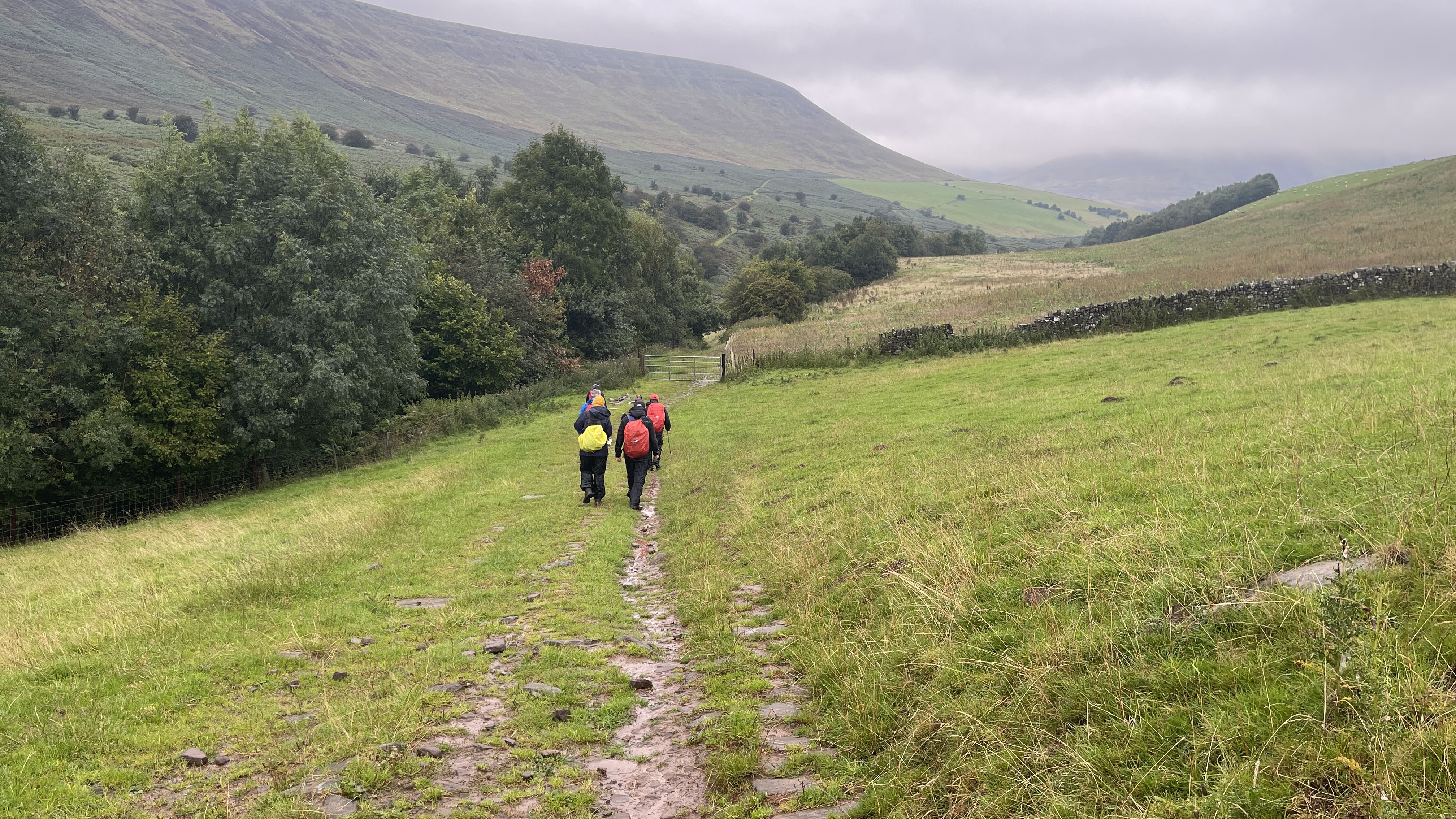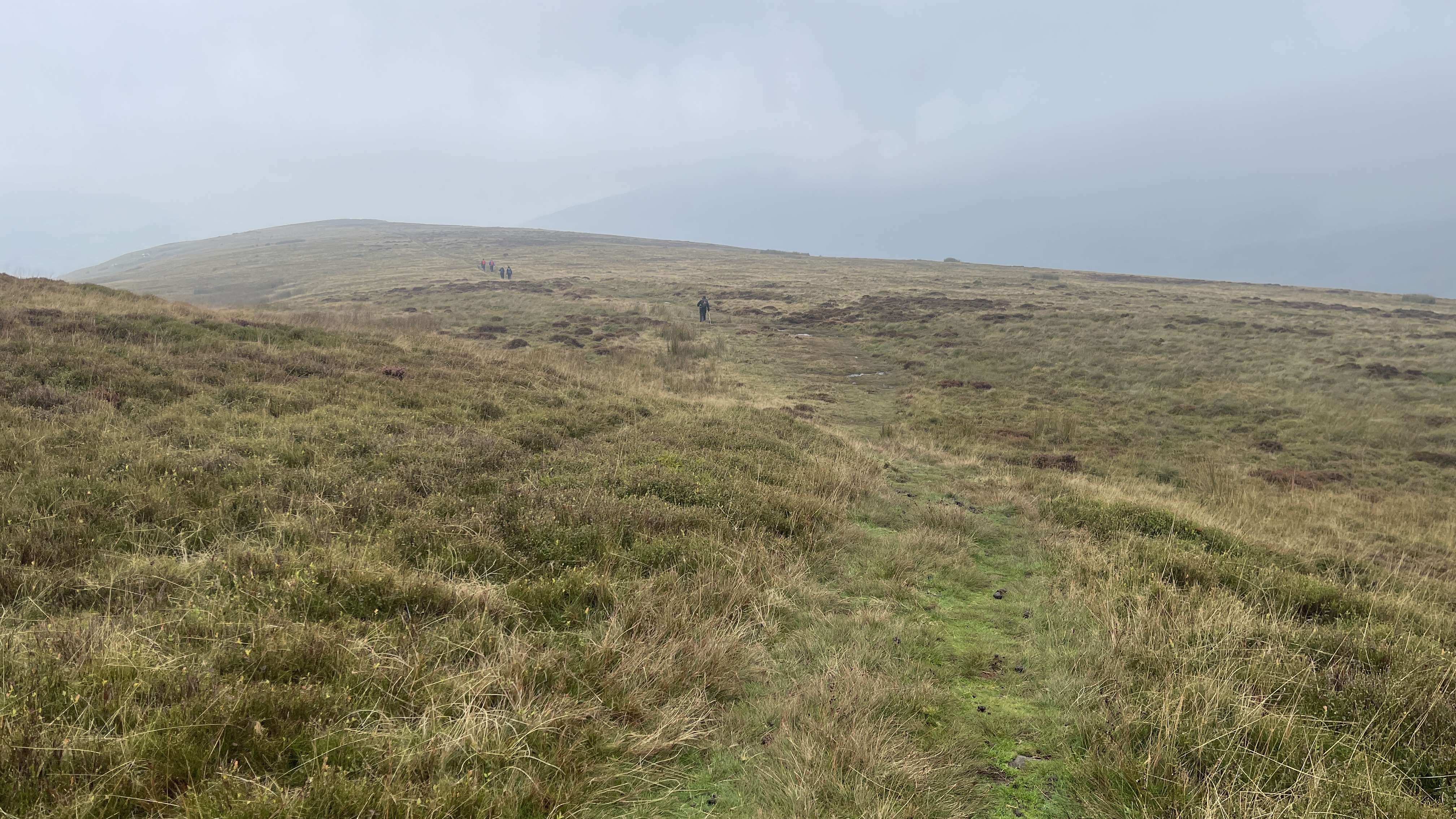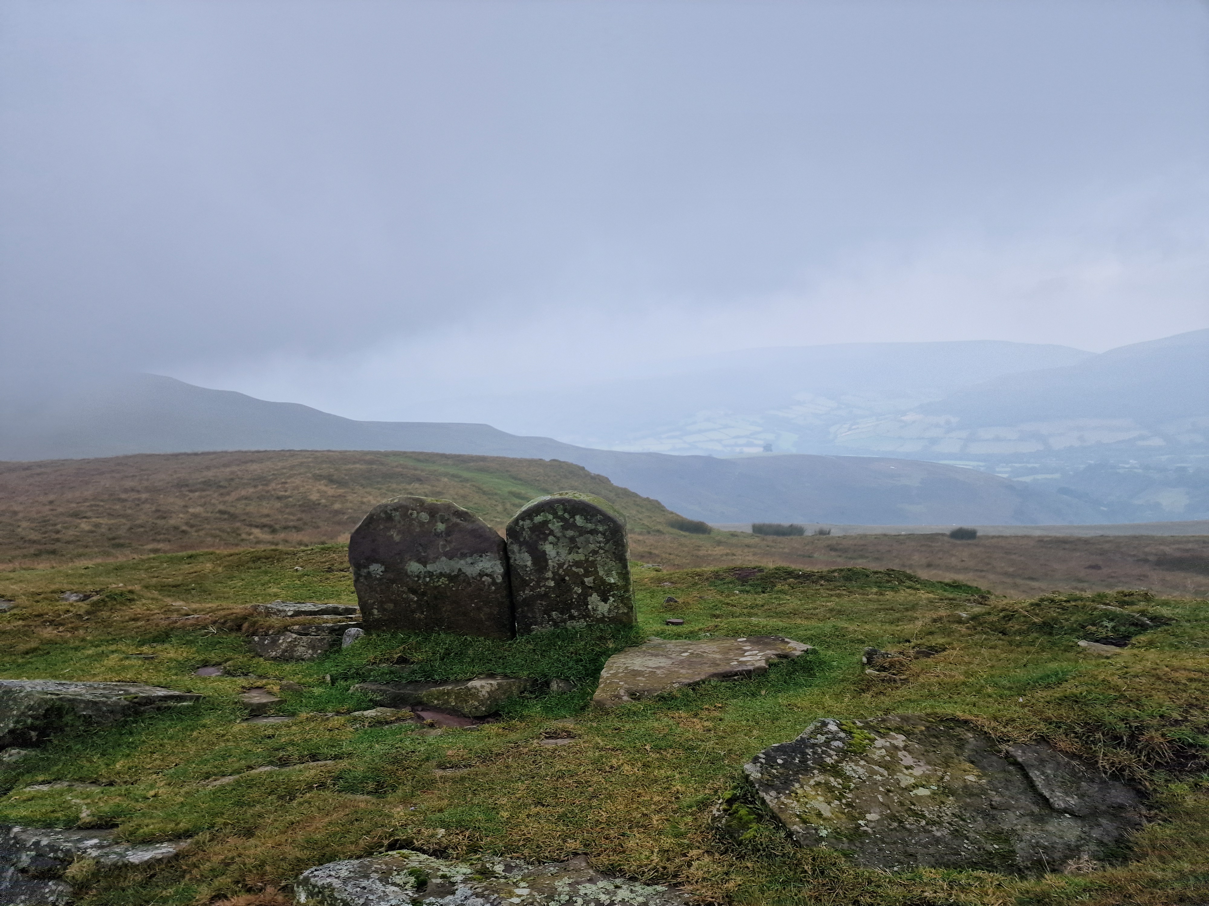 What an incredible day leading the Merthyr Valley Ramblers deep into the Black Mountains! Our journey began at The Hermitage, a secluded historical gem nestled in the Grwyne Valley. Originally built in the 18th century, The Hermitage was once a serene retreat, now a picturesque ruin surrounded by nature. Ordinarily, we would have crossed the ford and explored the ruins, but with the water level higher than usual and slippery rocks, we opted for a safer route towards the Grwyne Valley. The rain initially seemed relentless, but it soon subsided, leaving us with near-perfect walking conditions. We paused for a group photo on the Tal-y-maes bridge, a charming structure on the historic Macnamara's Road. From there, we began our slow and steady ascent up the valley. Heading towards Pen Trumau and the Cambrian Way path, we soon changed direction towards our highest point of the day, Mynydd Llysiau. The wind was fierce on the approach, but once on the sheltered side, we enjoyed an early lunch break. The mist was heavy, limiting our views, but we caught fleeting glimpses of the Dragon's Back and beyond. Our journey continued southward towards Pen Twyn Glas, passing the disused quarry and cairn. We encountered a young couple embarking on a 12-mile hike, a rare sight as we had only seen one other person all day! Finally, we descended to the farmyard at Pentwyn and picked up the lane back to our starting point.