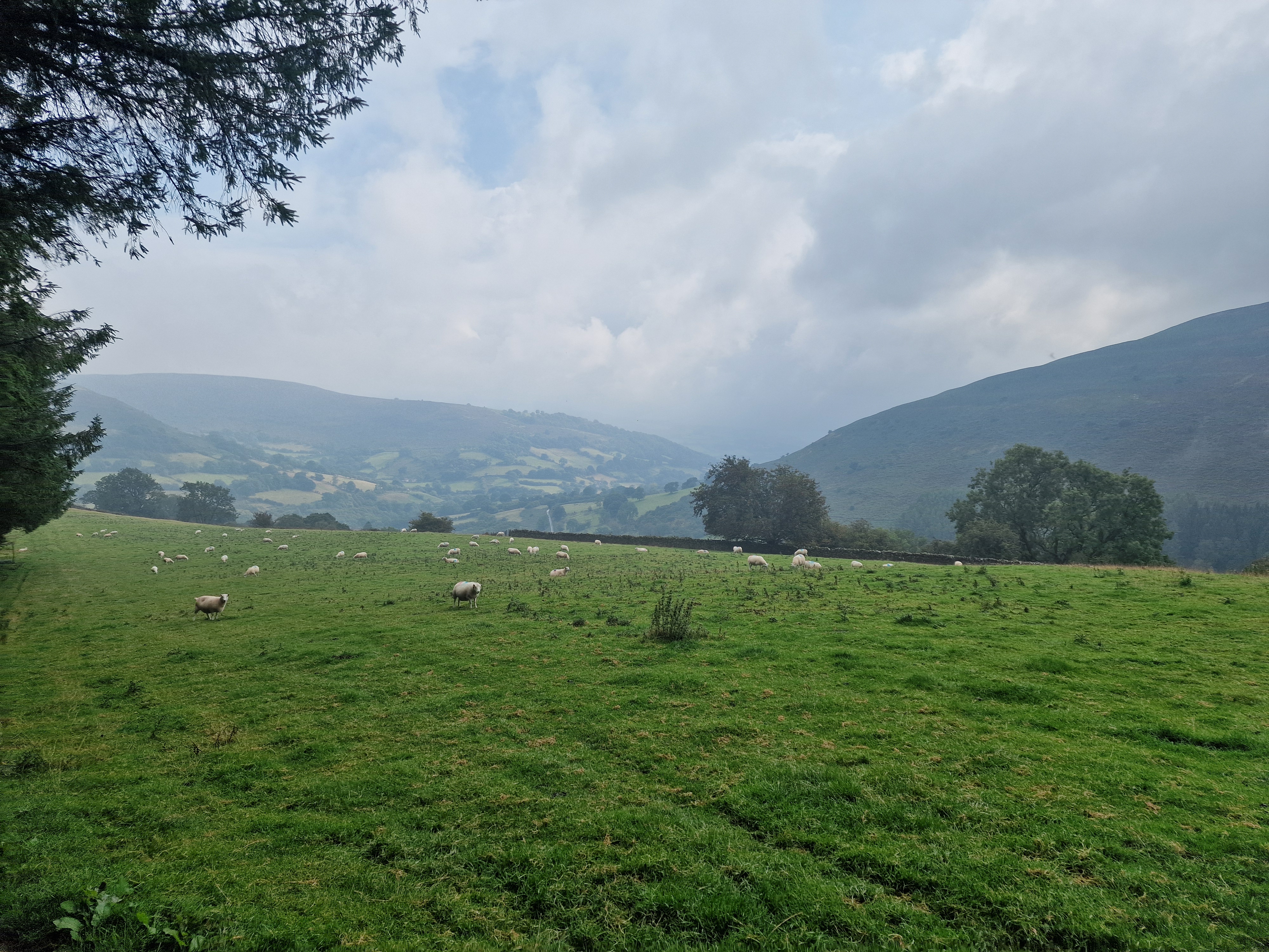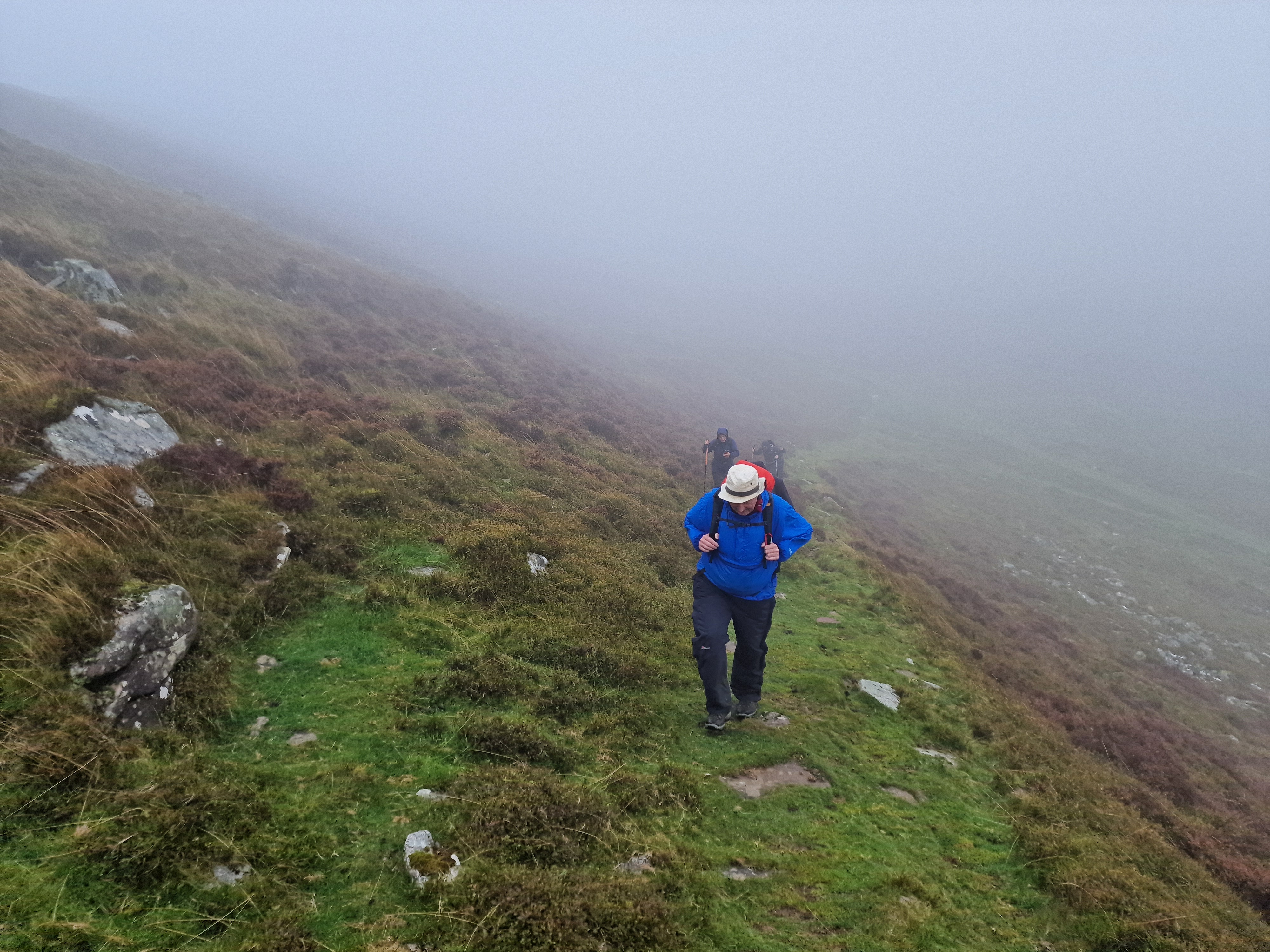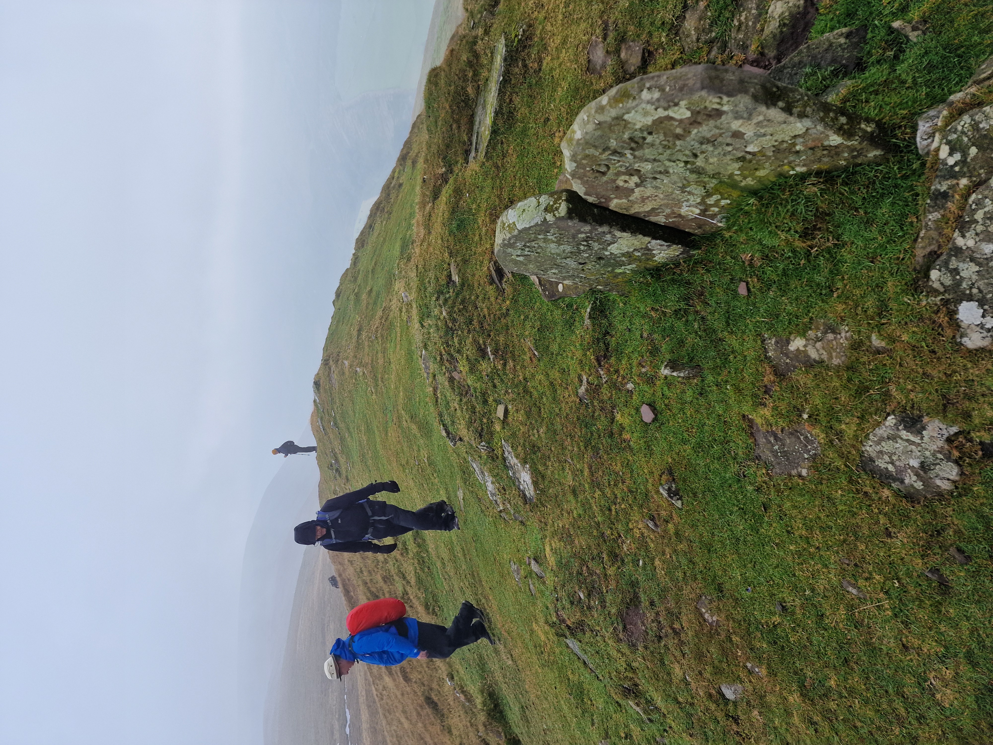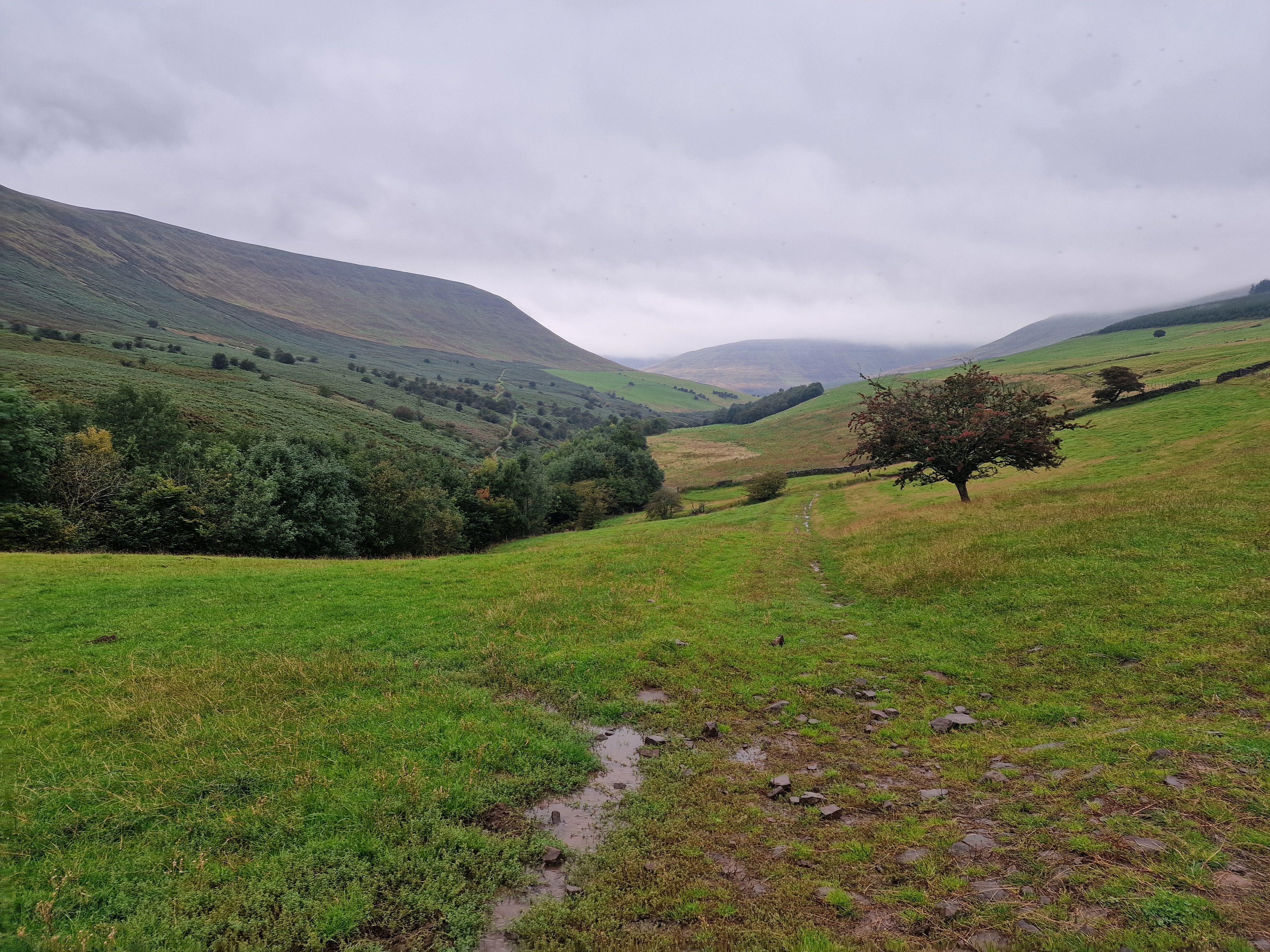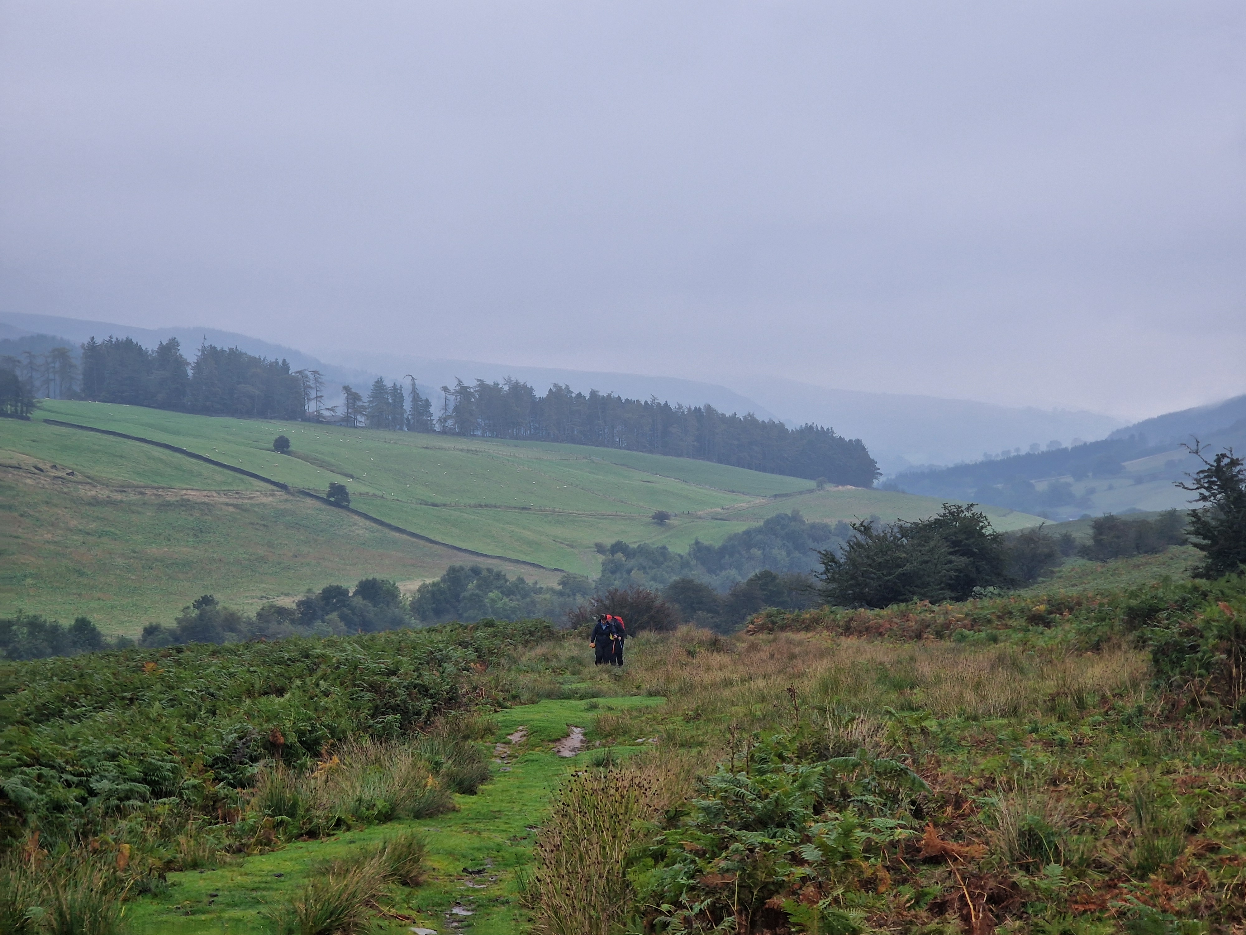 What an incredible day leading the Merthyr Valley Ramblers deep into the Black Mountains! Our journey began at The Hermitage, a secluded historical gem nestled in the Grwyne Valley. Originally built in the 18th century, The Hermitage was once a serene retreat, now a picturesque ruin surrounded by nature. Ordinarily, we would have crossed the ford and explored the ruins, but with the water level higher than usual and slippery rocks, we opted for a safer route towards the Grwyne Valley. The rain initially seemed relentless, but it soon subsided, leaving us with near-perfect walking conditions. We paused for a group photo on the Tal-y-maes bridge, a charming structure on the historic Macnamara's Road. From there, we began our slow and steady ascent up the valley. Heading towards Pen Trumau and the Cambrian Way path, we soon changed direction towards our highest point of the day, Mynydd Llysiau. The wind was fierce on the approach, but once on the sheltered side, we enjoyed an early lunch break. The mist was heavy, limiting our views, but we caught fleeting glimpses of the Dragon's Back and beyond. Our journey continued southward towards Pen Twyn Glas, passing the disused quarry and cairn. We encountered a young couple embarking on a 12-mile hike, a rare sight as we had only seen one other person all day! Finally, we descended to the farmyard at Pentwyn and picked up the lane back to our starting point.