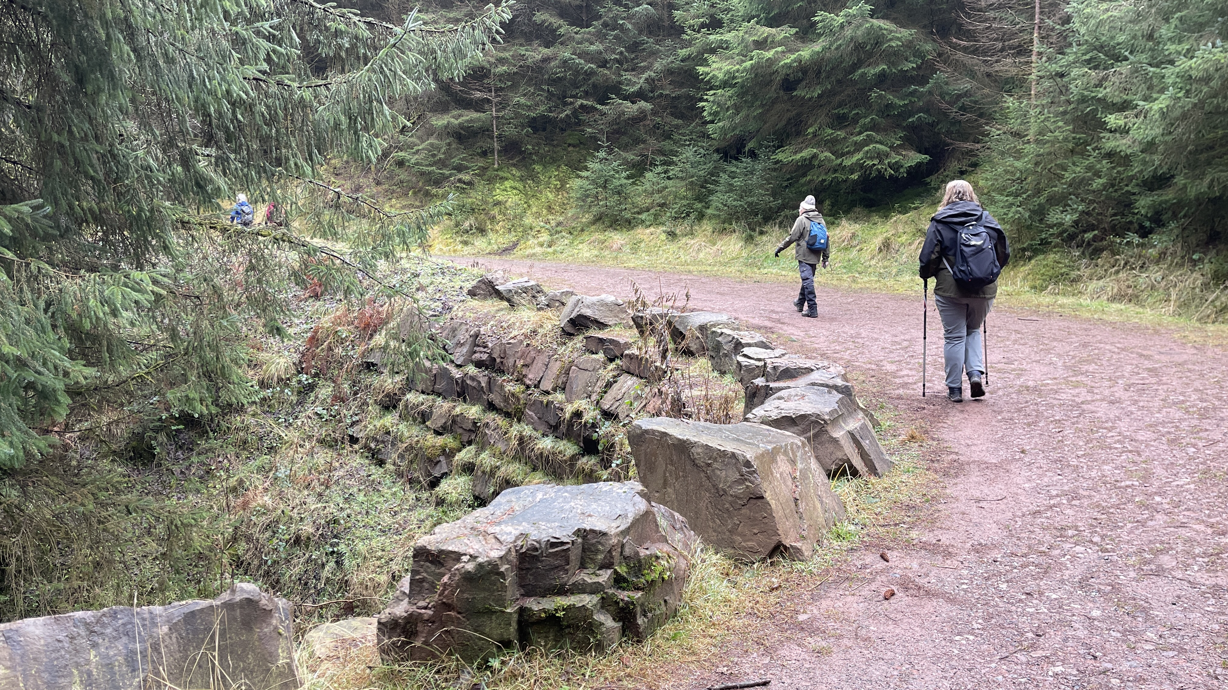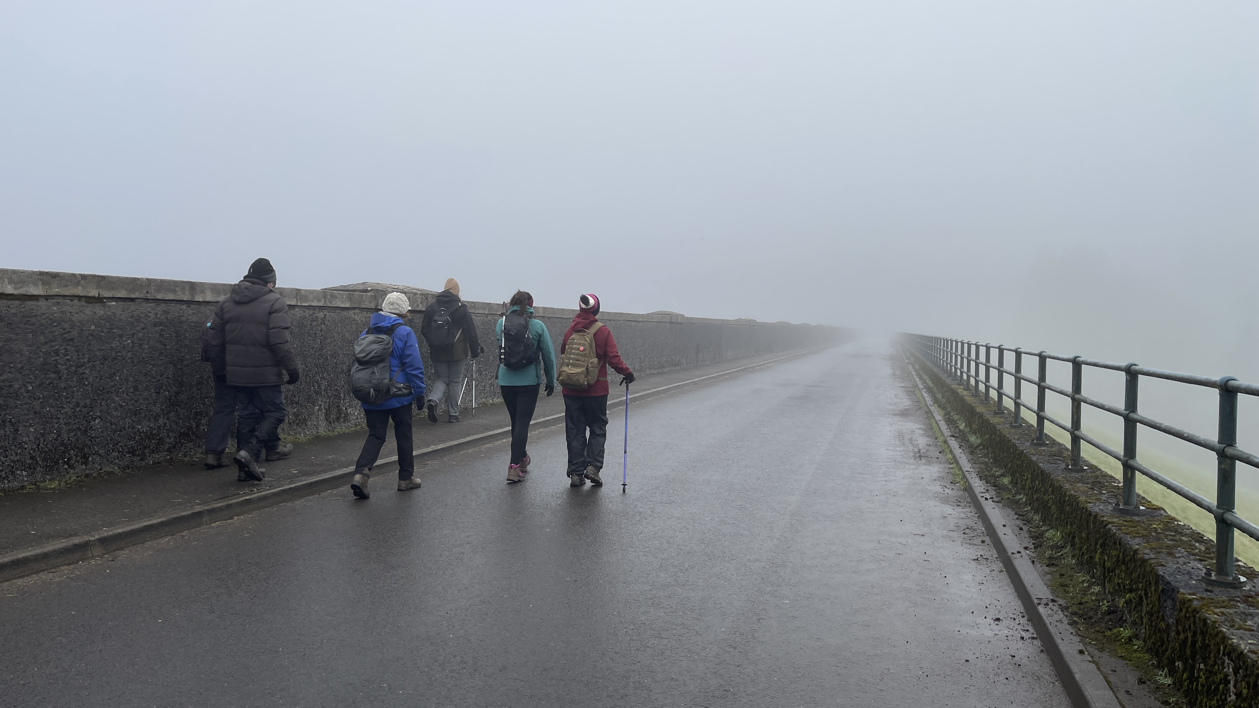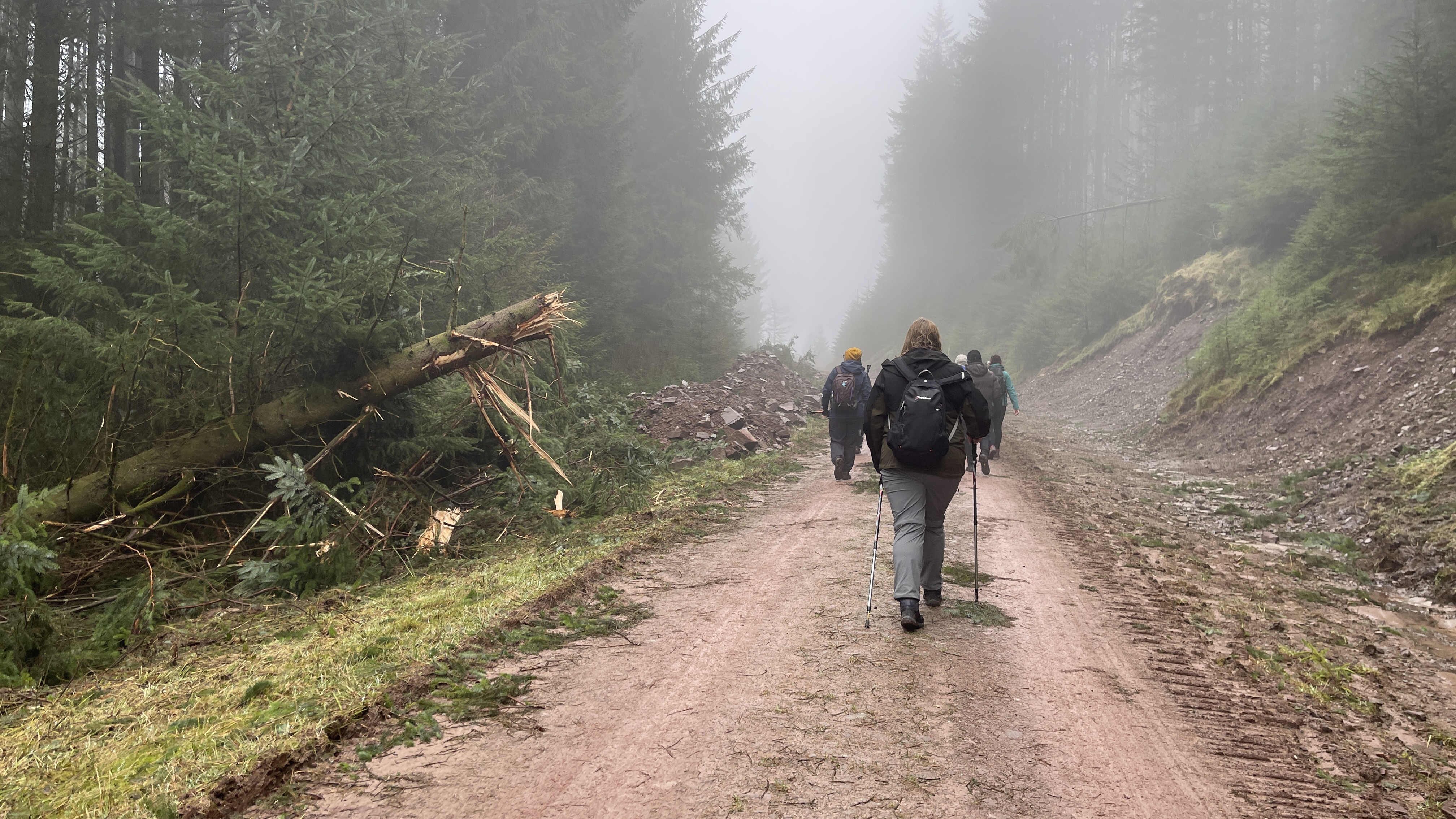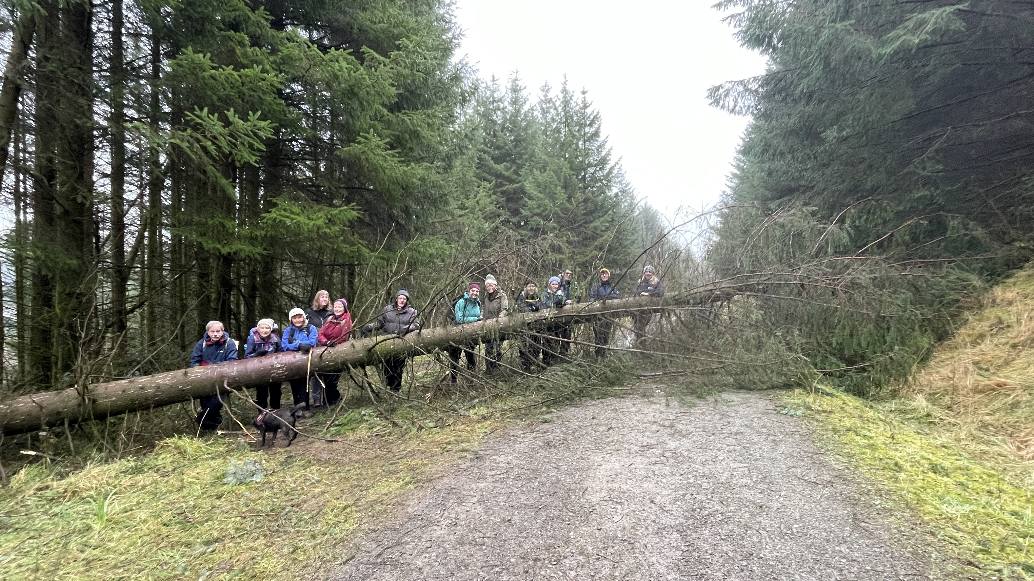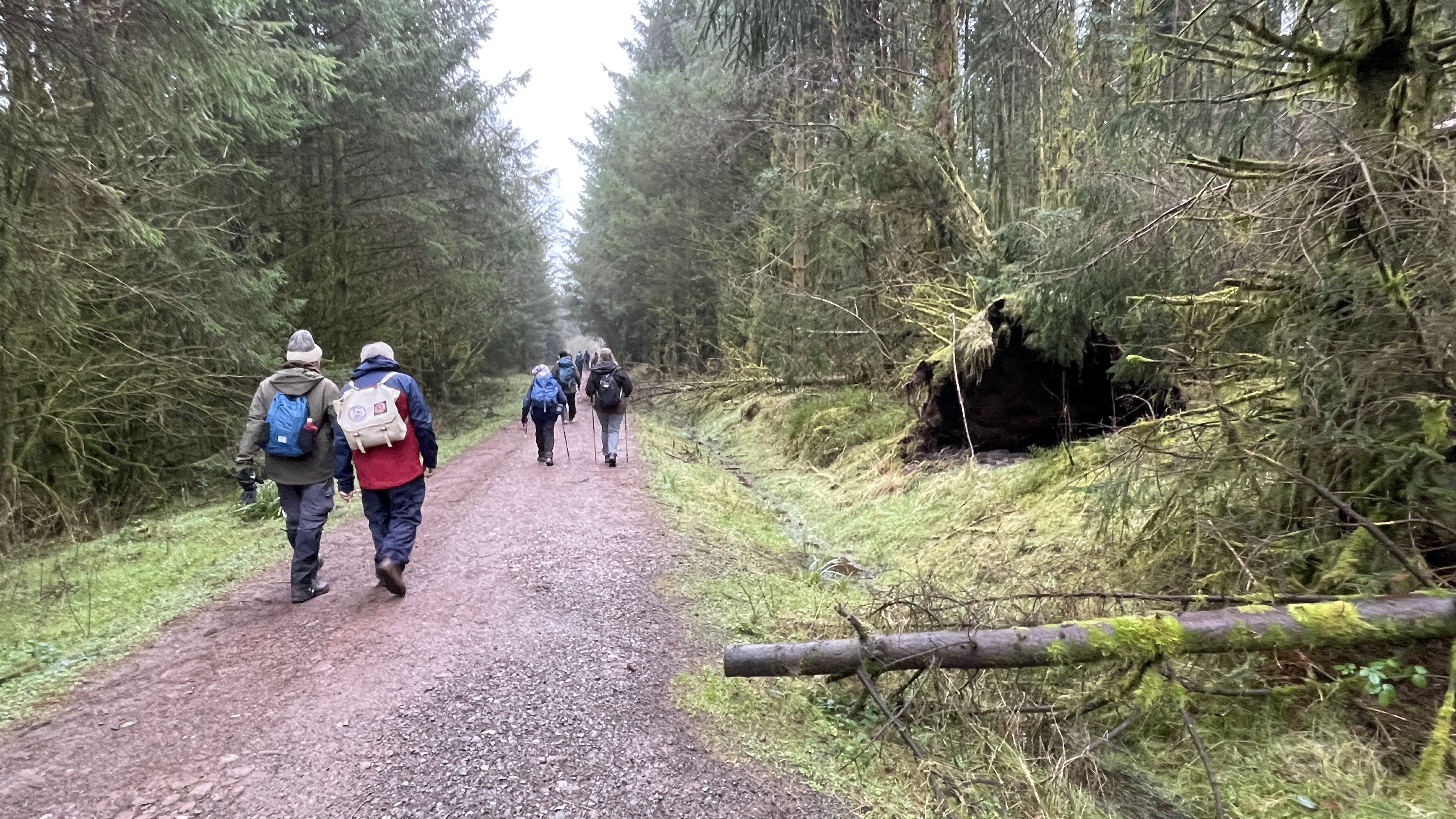 It was a cold and misty start to this morning's 8 mile walk around Pontsticill today. The 14 hardy ramblers (including welcome guest Jane) started from the bus terminus down the road to the dam and checked the overflow, which was now dry. We then worked our way alongside the reservoir, noting all the tree damage that the storms had caused. We then crossed the railway at the railway crossing and headed up to Cwm y Gorlan where, in slowly clearing weather, we followed the path around and headed back down Cwm Callan. After a quick cuppa at Dolygaer, we crossed the bridge between the dams and picked up another forestry track where we crossed the Nant Car Fach using the wooden bridge. Fallen trees proved to be no obstacle to the group as we made our way alongside track and road back to the bus stop. We then had a wonderful pre-booked meal in The Red Cow Pontsticil, a perfect end to a perfect walk thanks to the great company and additional walk leaders Maureen and Katherine.