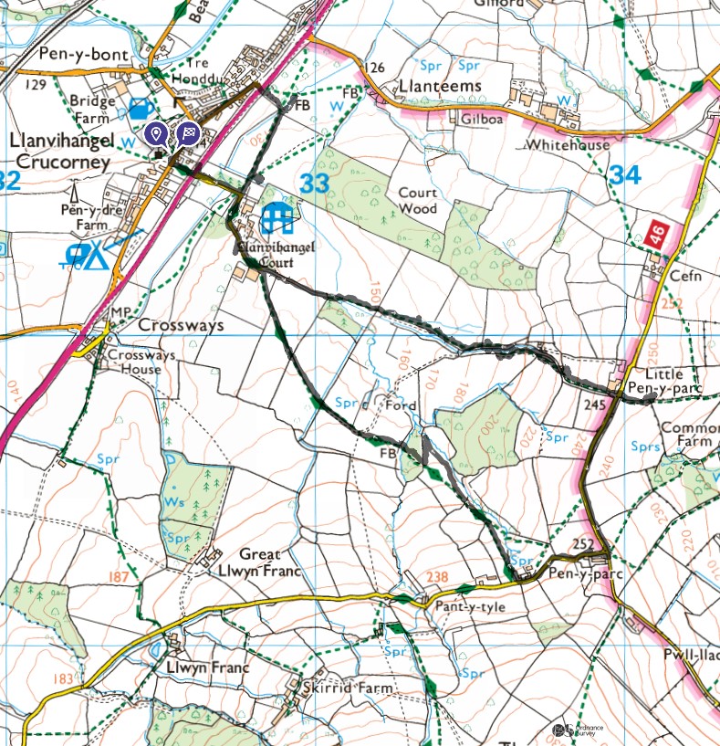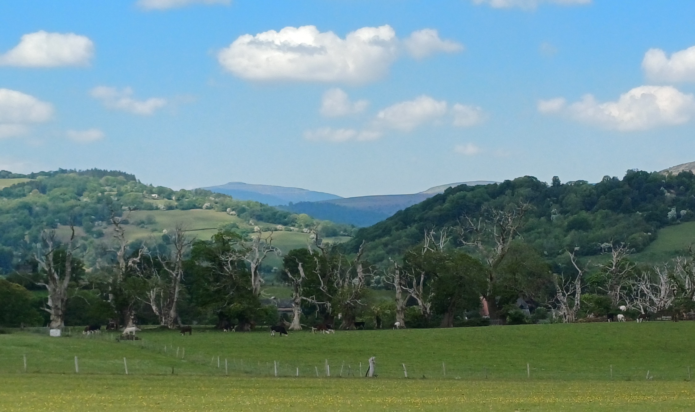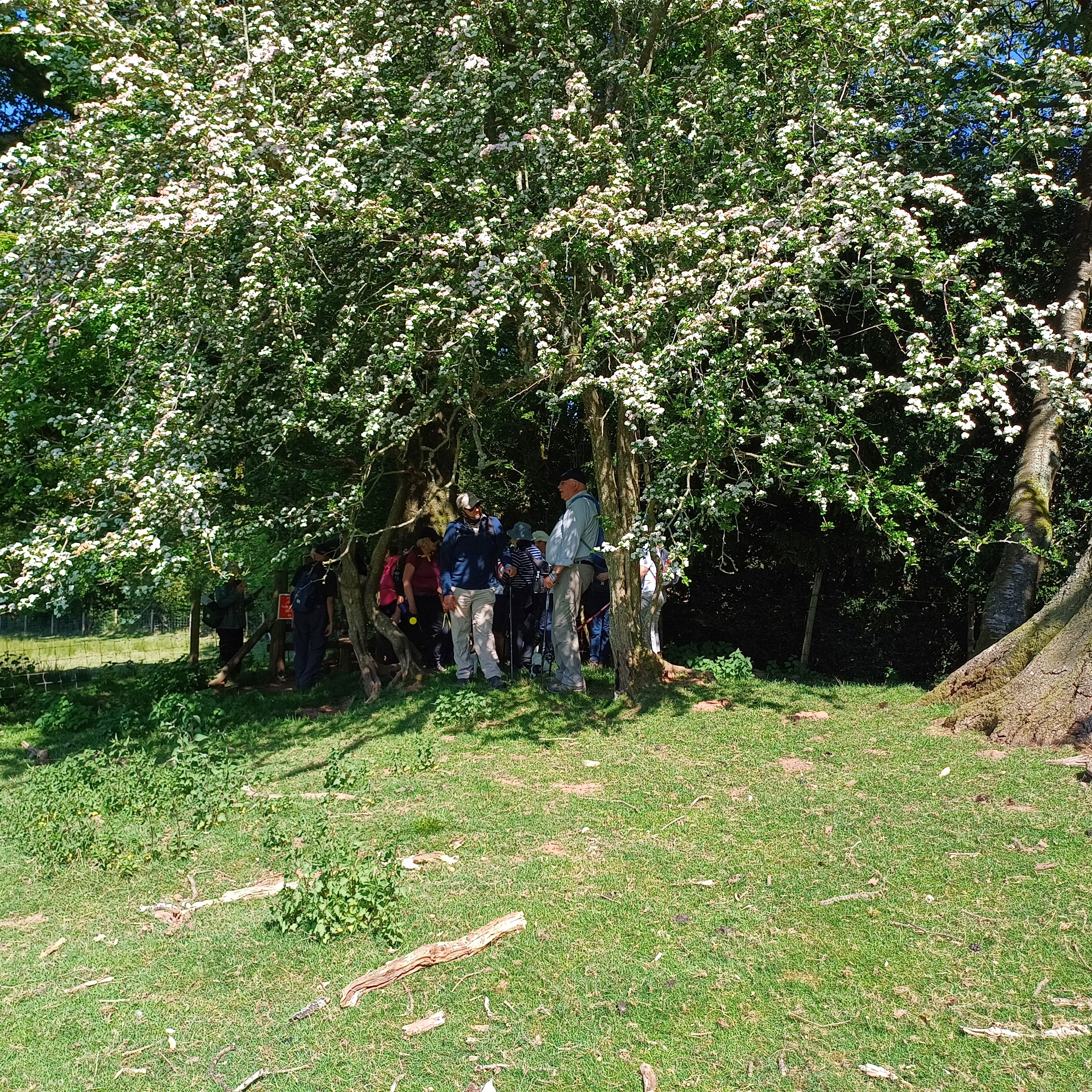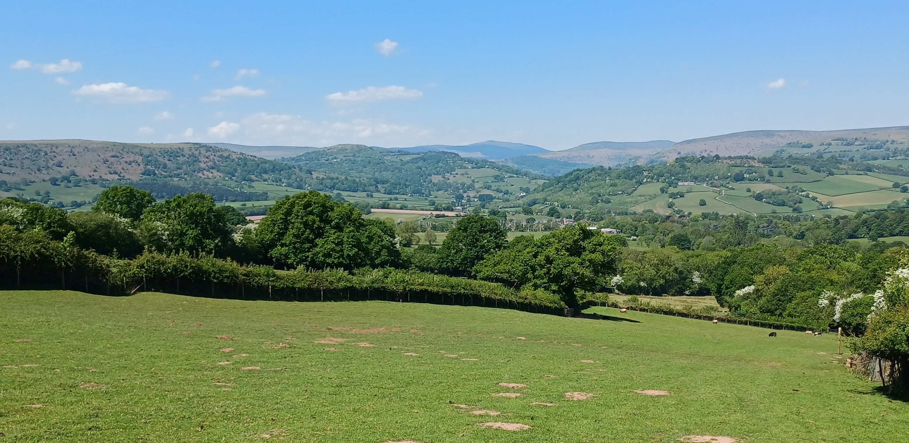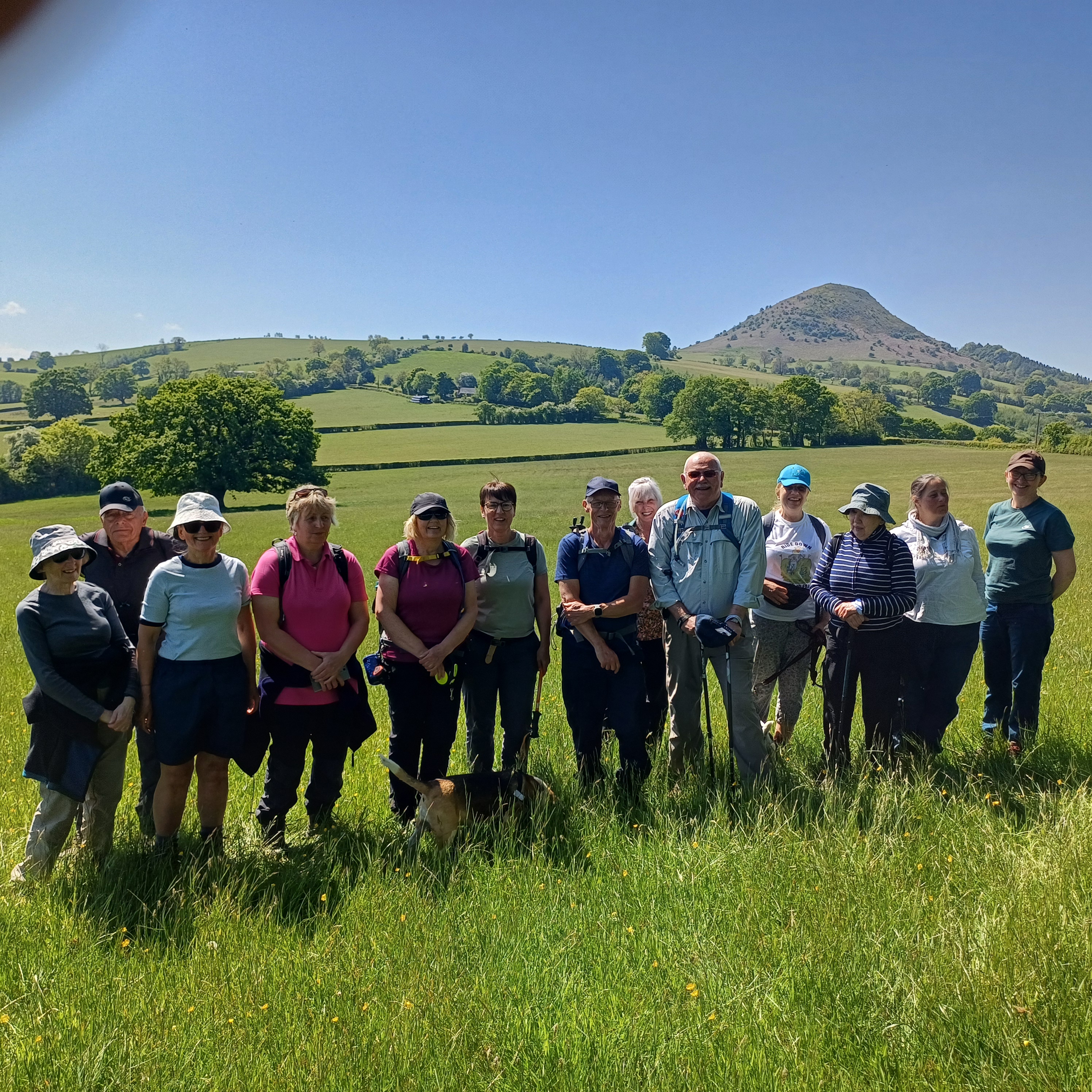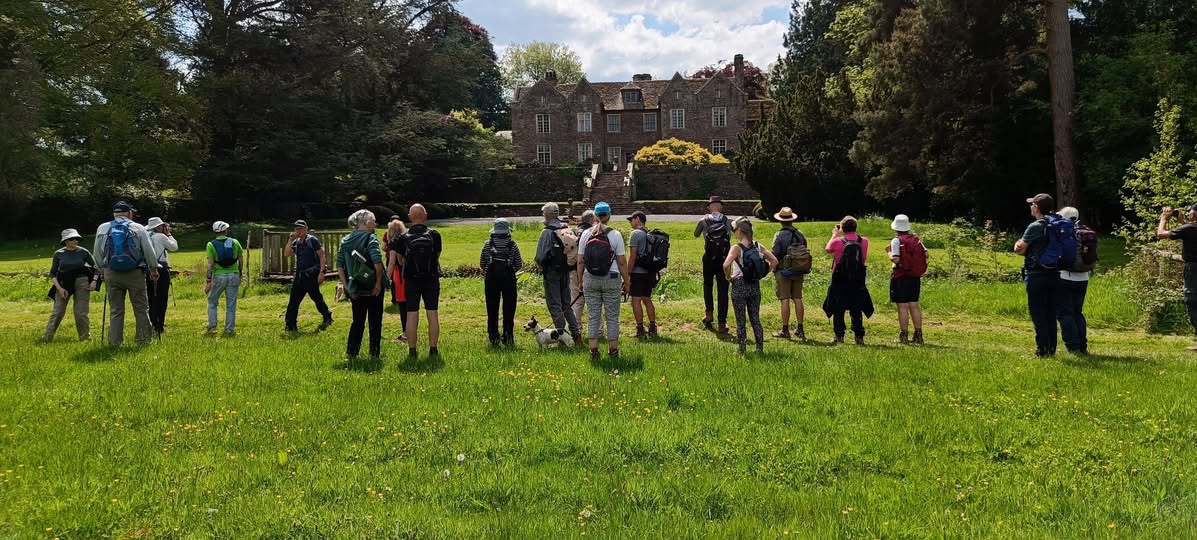 A lovely 7 mile ramble around Skirrid in The Black Mountains on a beautiful sunny day. Only Rob and Morfydd could start a walk with 14 ramblers and end up with 24!! Well done Morfydd and you weren't even on commission for persuading them to visit Llanvihangel Court The walk took us across the A465; it was a clear stretch of road, and we were able to cross easily. We took the narrow road past Llanvihangel Court, which we viewed on our return; it was a very old manor house still occupied today. We walked through the beautiful county of Monmouthshire, through fields and pasture land. There was a slight incline on the first part of the walk up to a lane that ran under the Skirrid. The walk took us down through fields and a wooded area that had a stream and two pretty bridges. We were in the heart of the Black Mountains, and the views were really lovely. The walk was clearly marked in the usual way. There were only two stiles; the rest had been replaced by gates. When we returned to the village, refreshments were enjoyed in the oldest pub in Wales, the Skirrid.