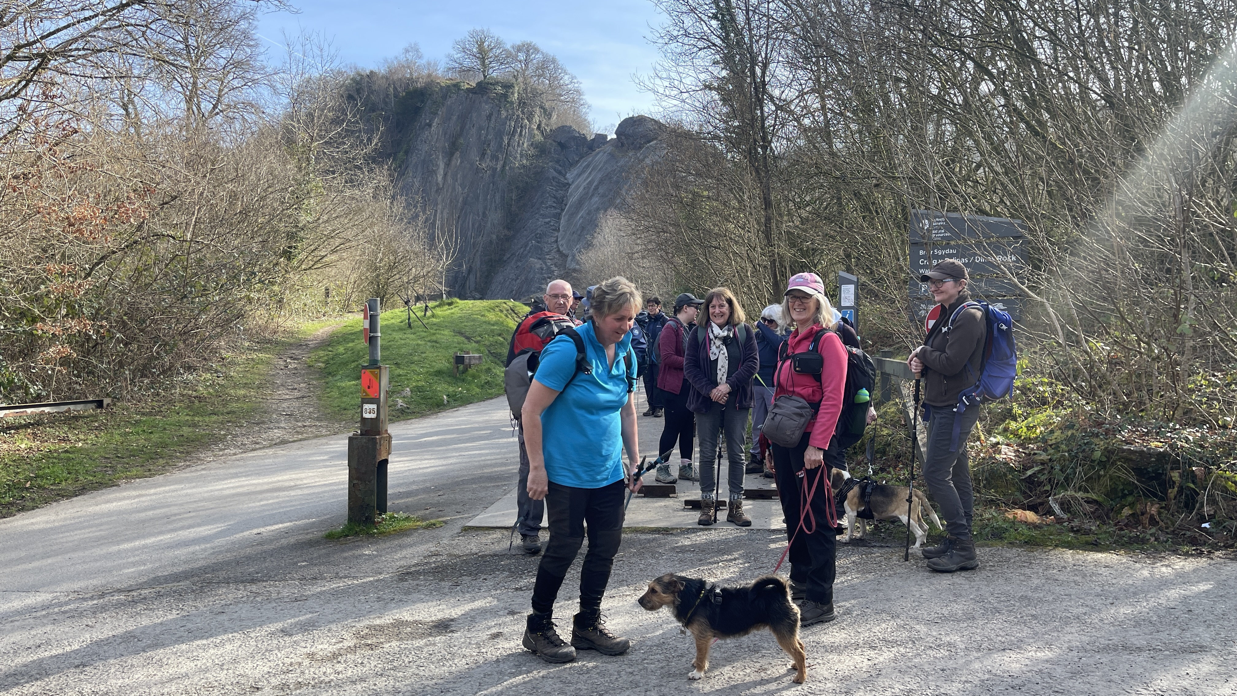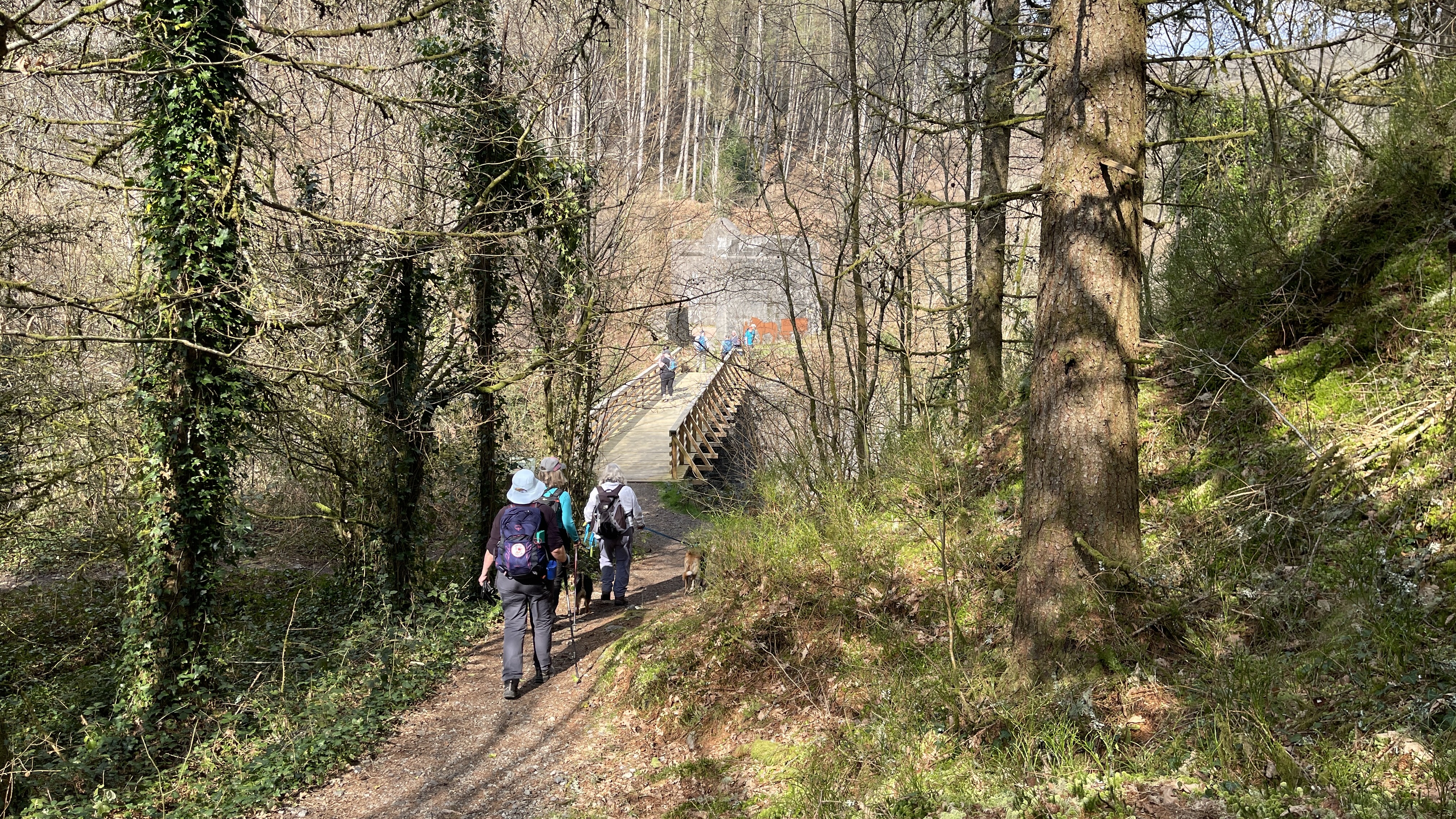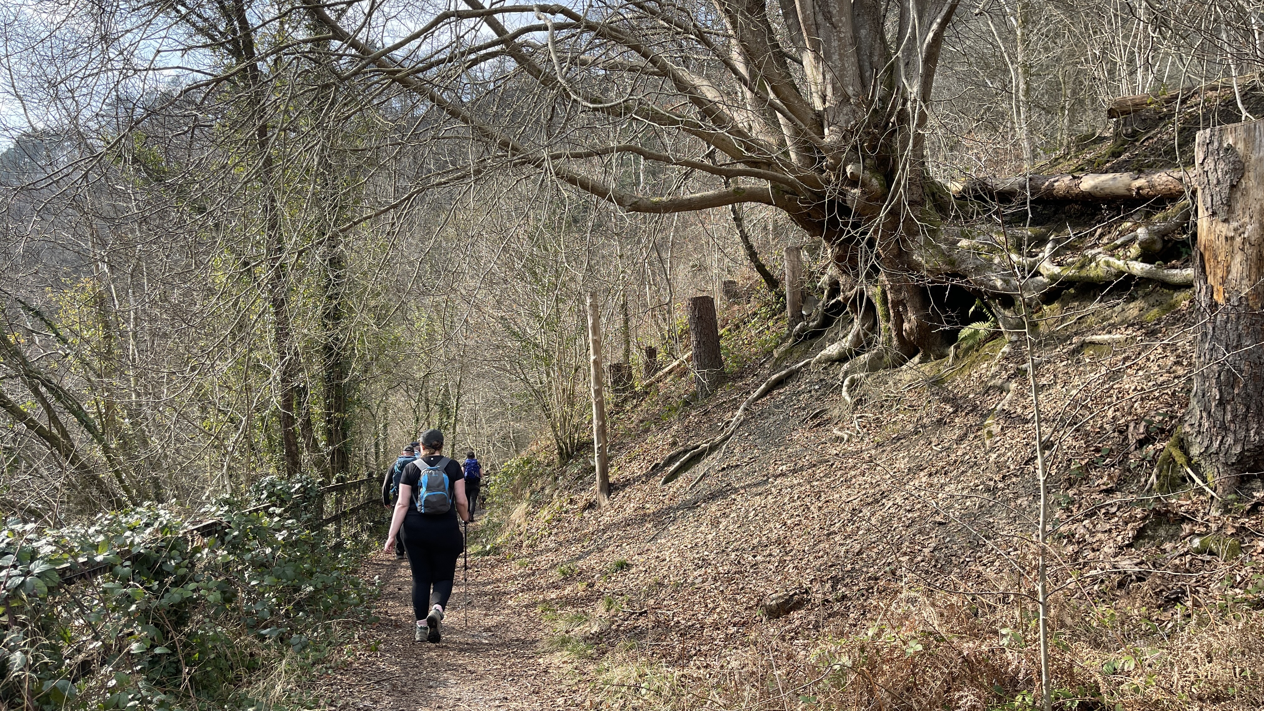 Dinas rock greeted fourteen Merthyr Valley Ramblers (including welcome guests Trudie and Helen) in bright sunshine today. Our 6.5 mile walk started uphill through Coed y Ffyrnau, across the Sychryd then due East to Ffynnon Ddu for a quick cuppa. We then criss-crossed along the tracks to Sgwg yr Elra where the bravest of us went down the steep path to the waterfall. It was then through Cilhepste Fach and Cerig and down a steep zig zag path to the old explosives factory where we had lunch. It was then along the river back to the start. A superb walk well led by Jenny and the usual great company.