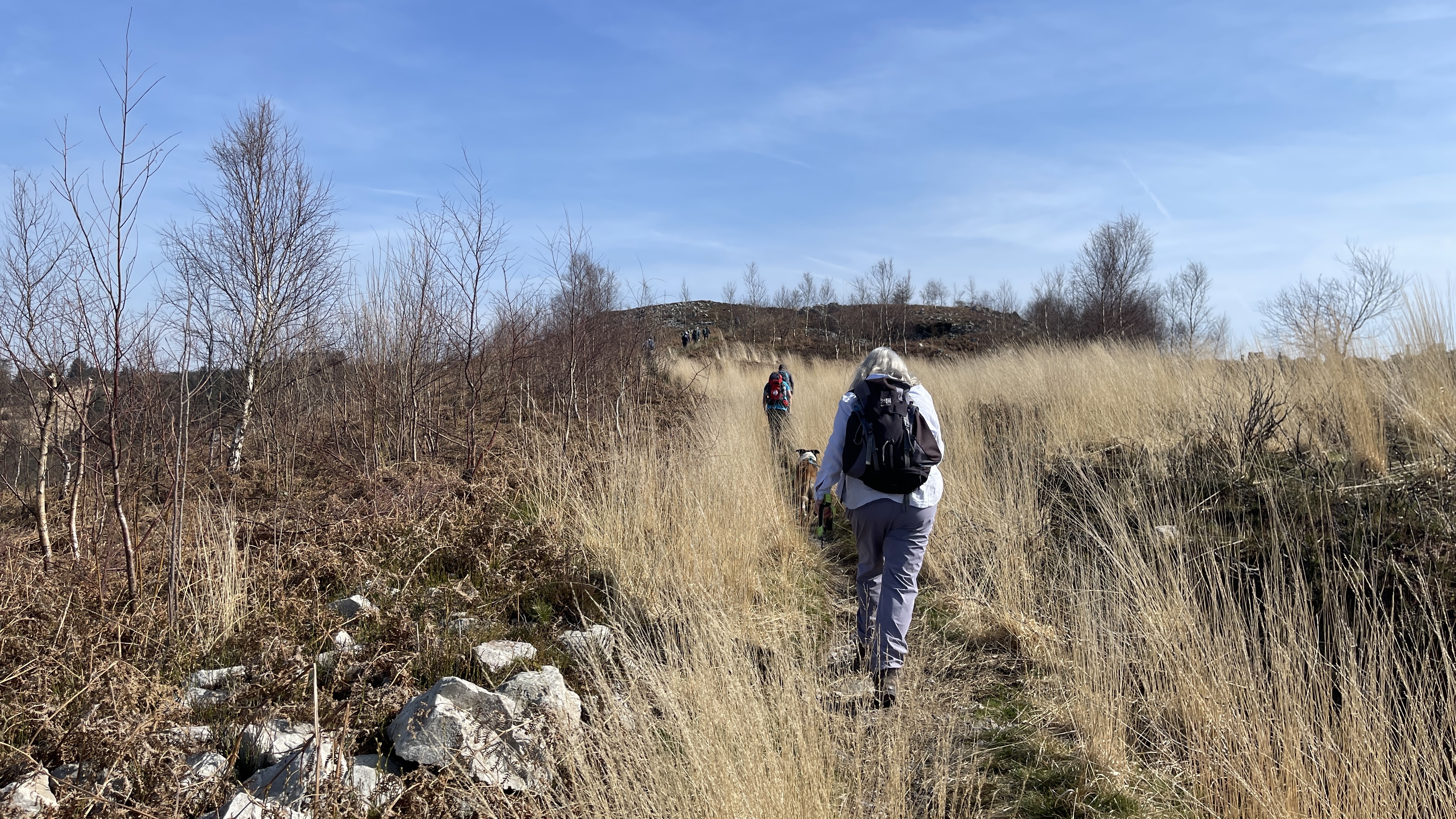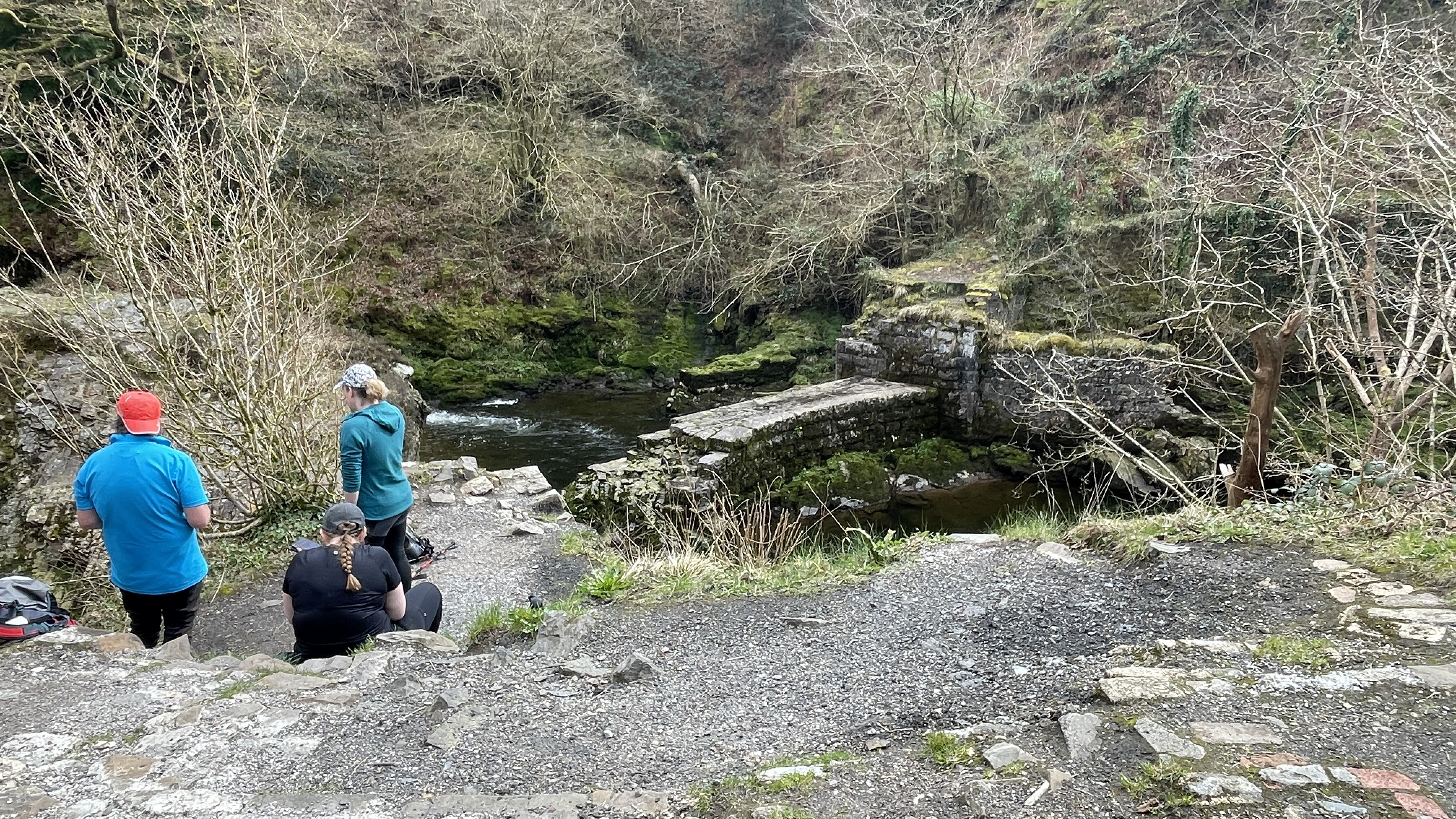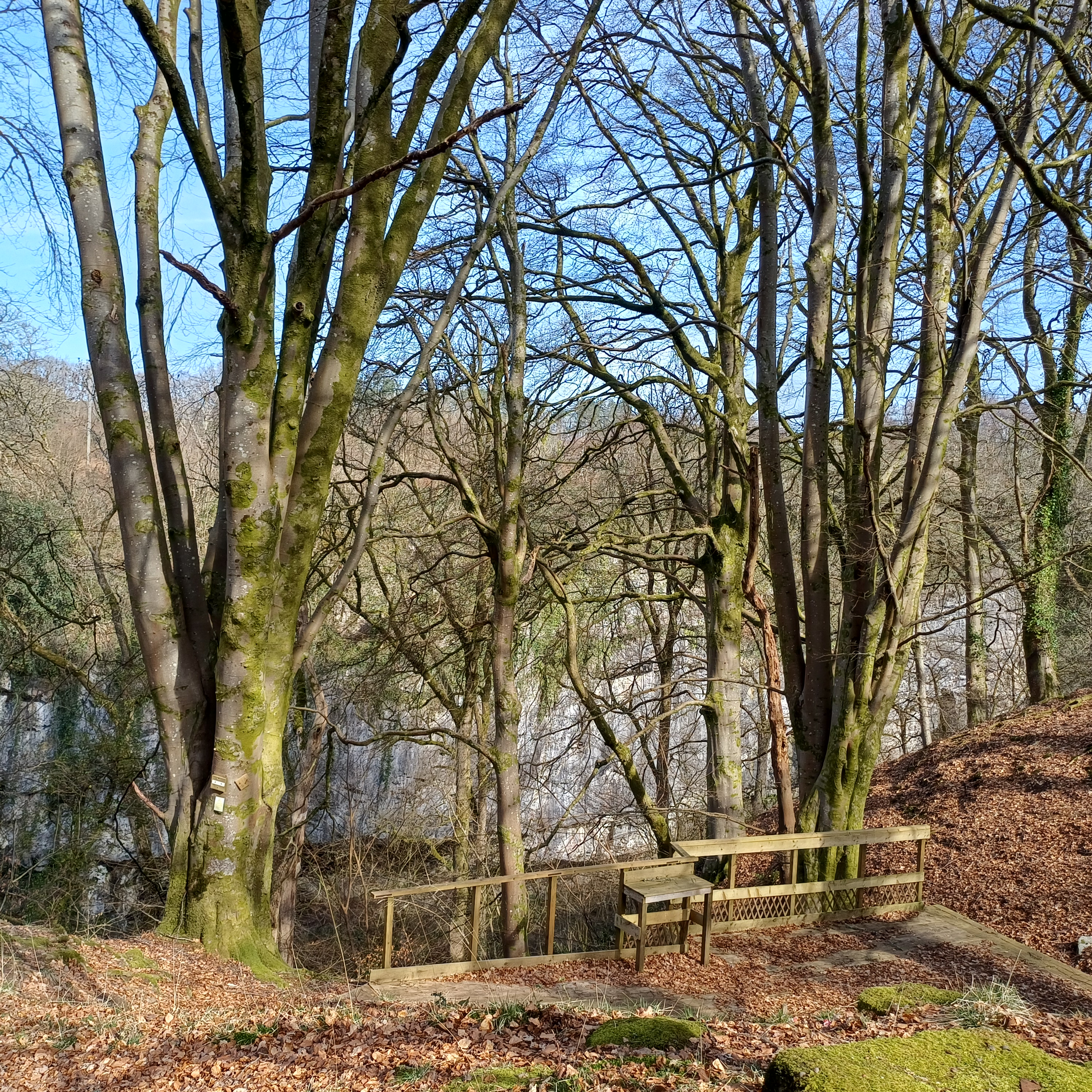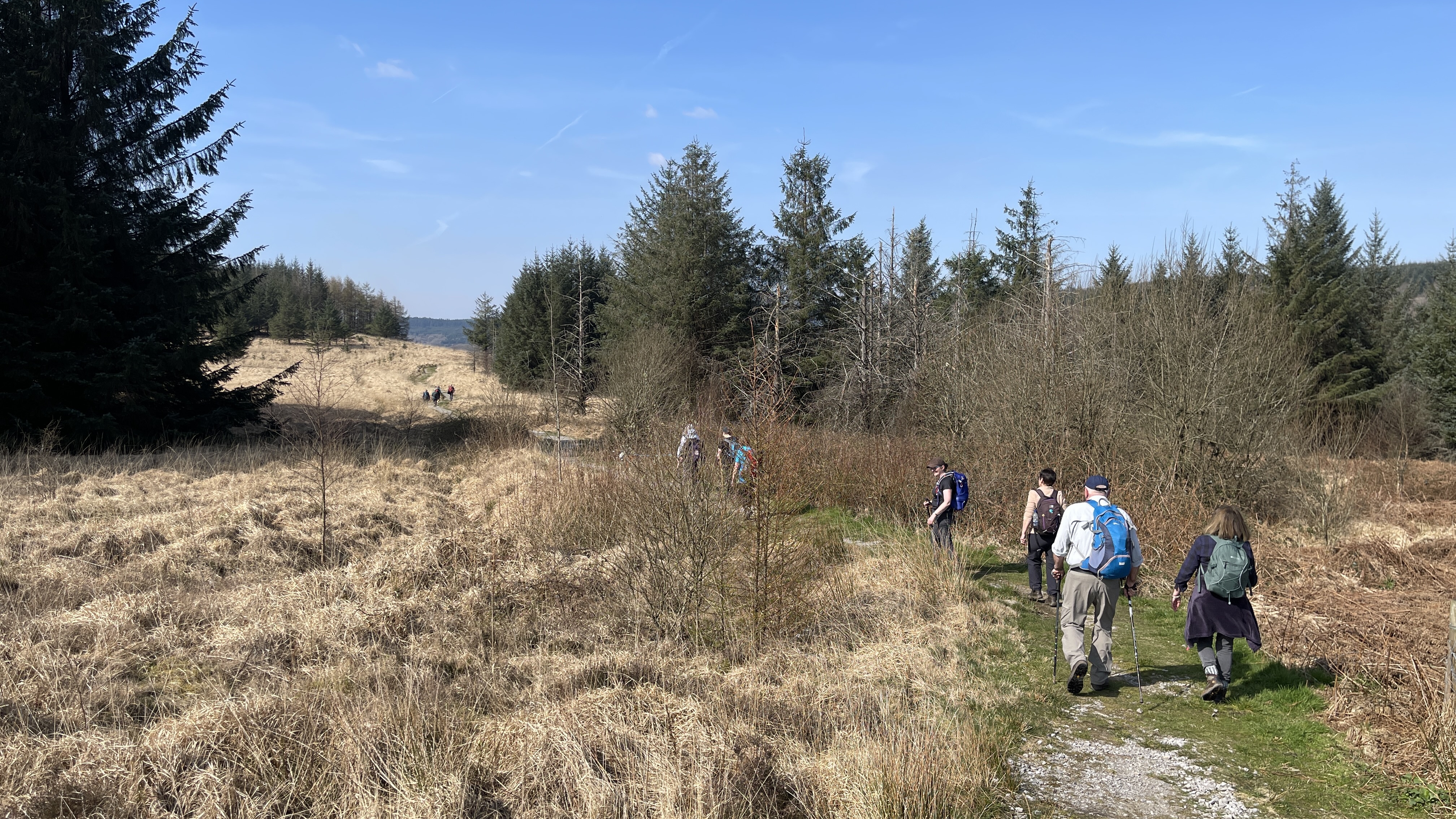 Dinas rock greeted fourteen Merthyr Valley Ramblers (including welcome guests Trudie and Helen) in bright sunshine today. Our 6.5 mile walk started uphill through Coed y Ffyrnau, across the Sychryd then due East to Ffynnon Ddu for a quick cuppa. We then criss-crossed along the tracks to Sgwg yr Elra where the bravest of us went down the steep path to the waterfall. It was then through Cilhepste Fach and Cerig and down a steep zig zag path to the old explosives factory where we had lunch. It was then along the river back to the start. A superb walk well led by Jenny and the usual great company.
