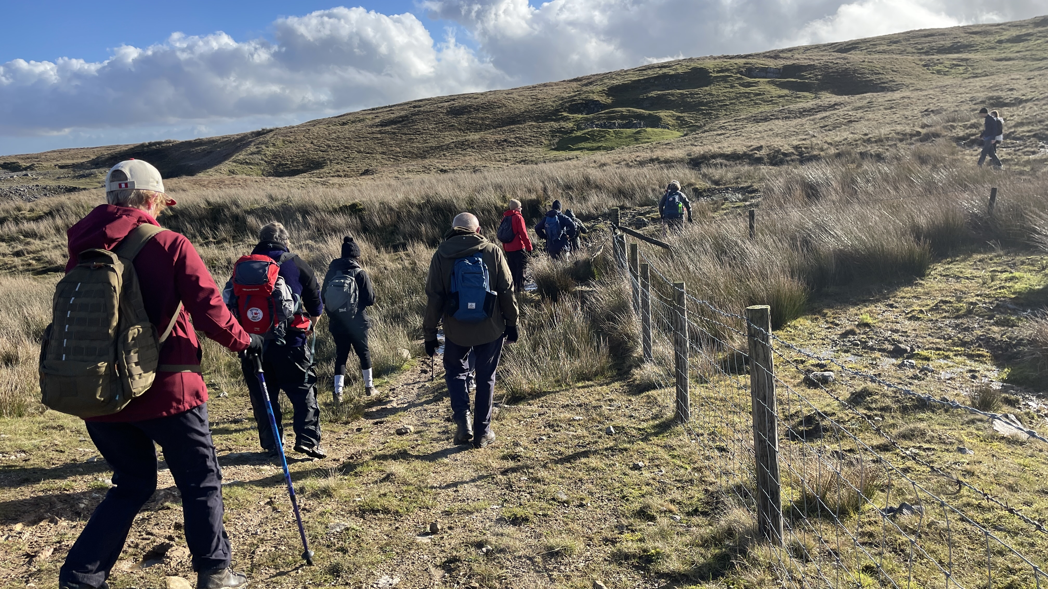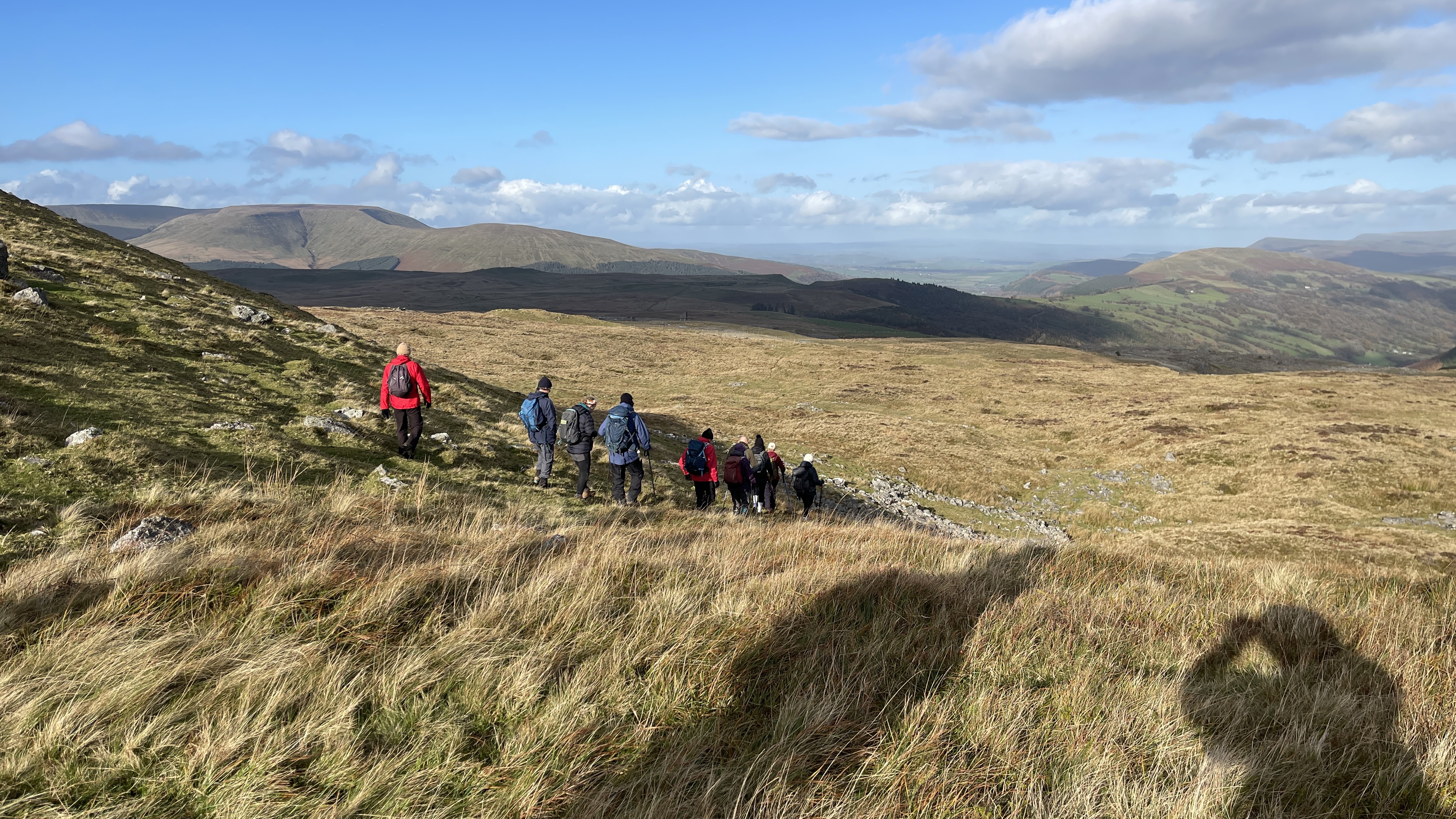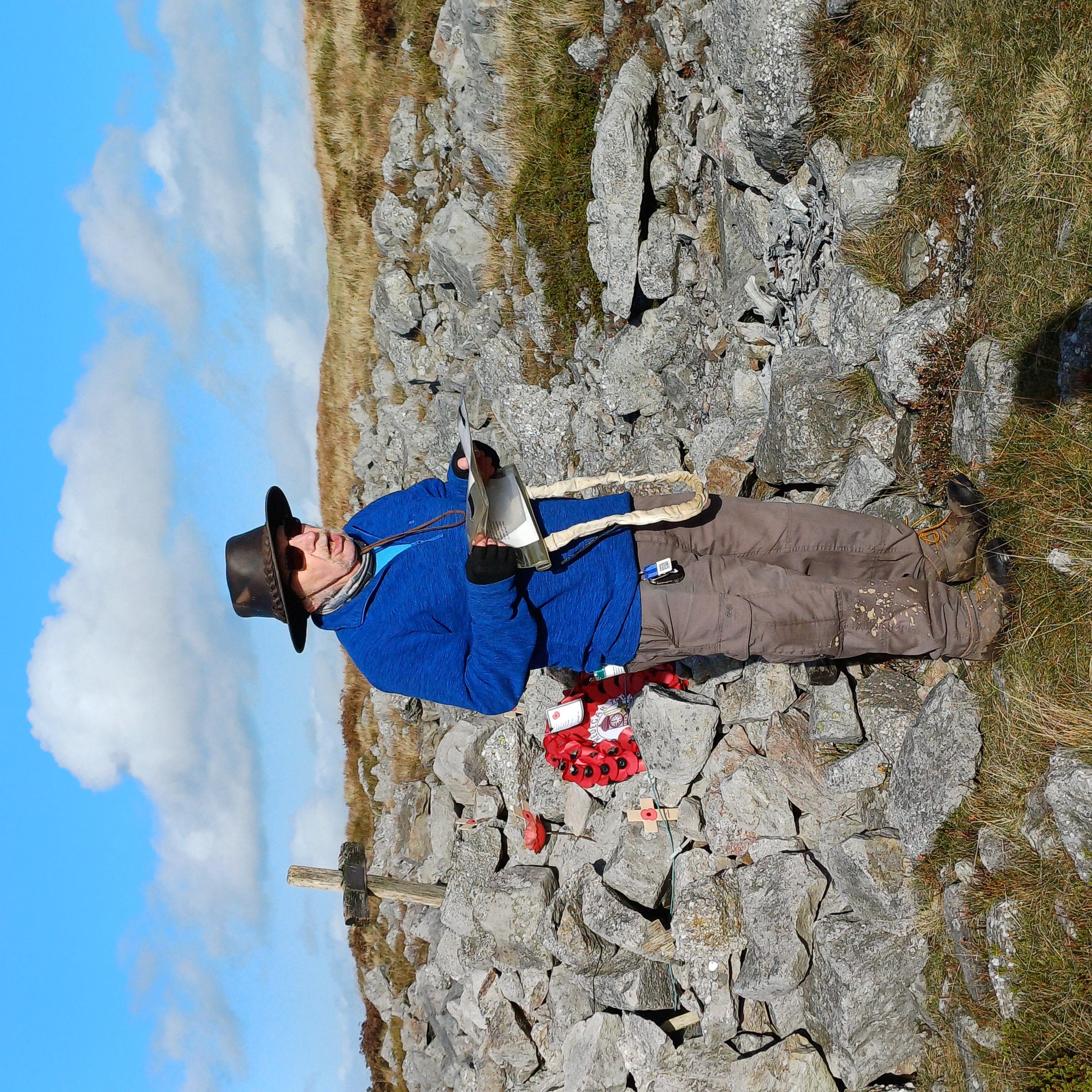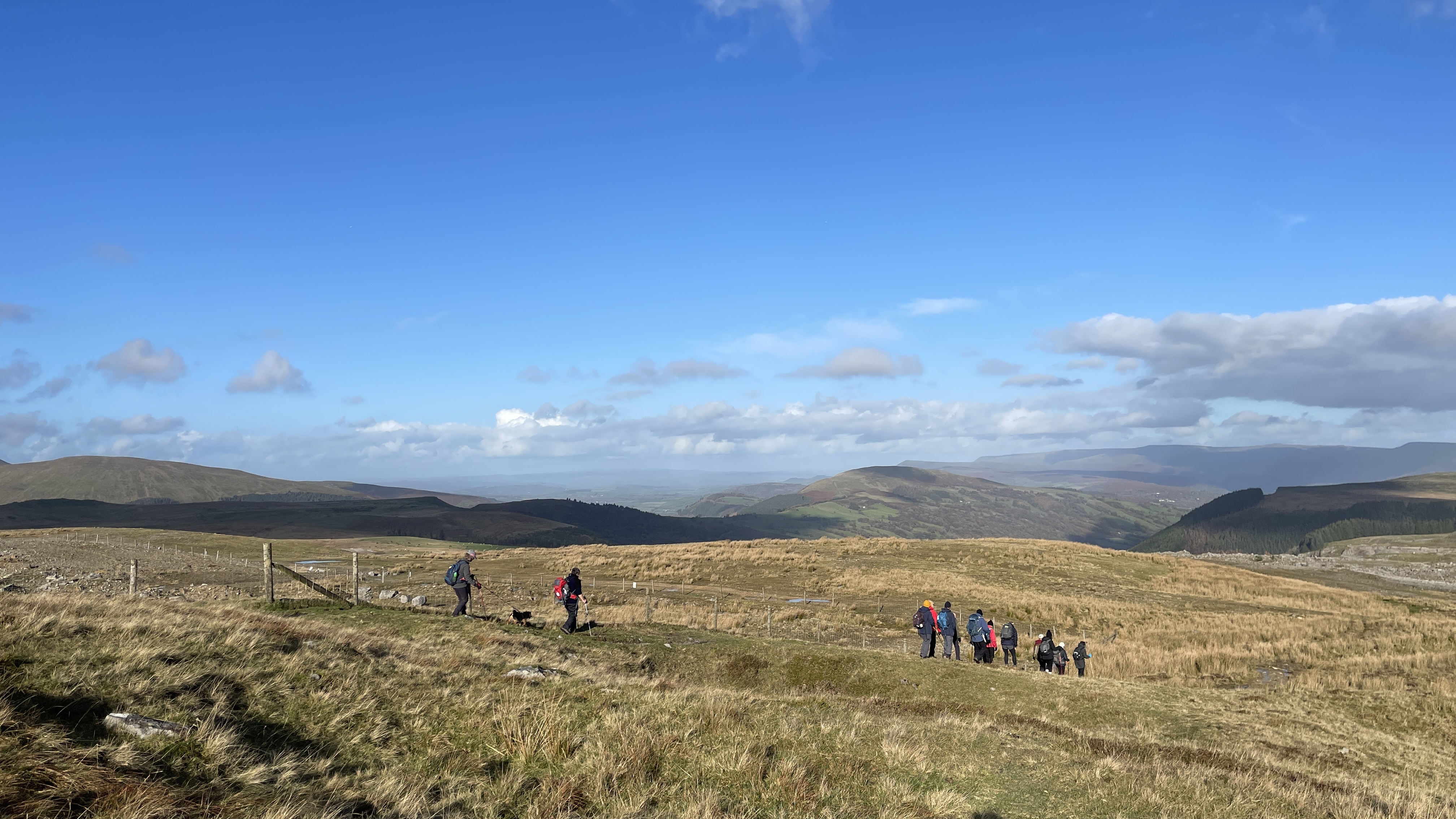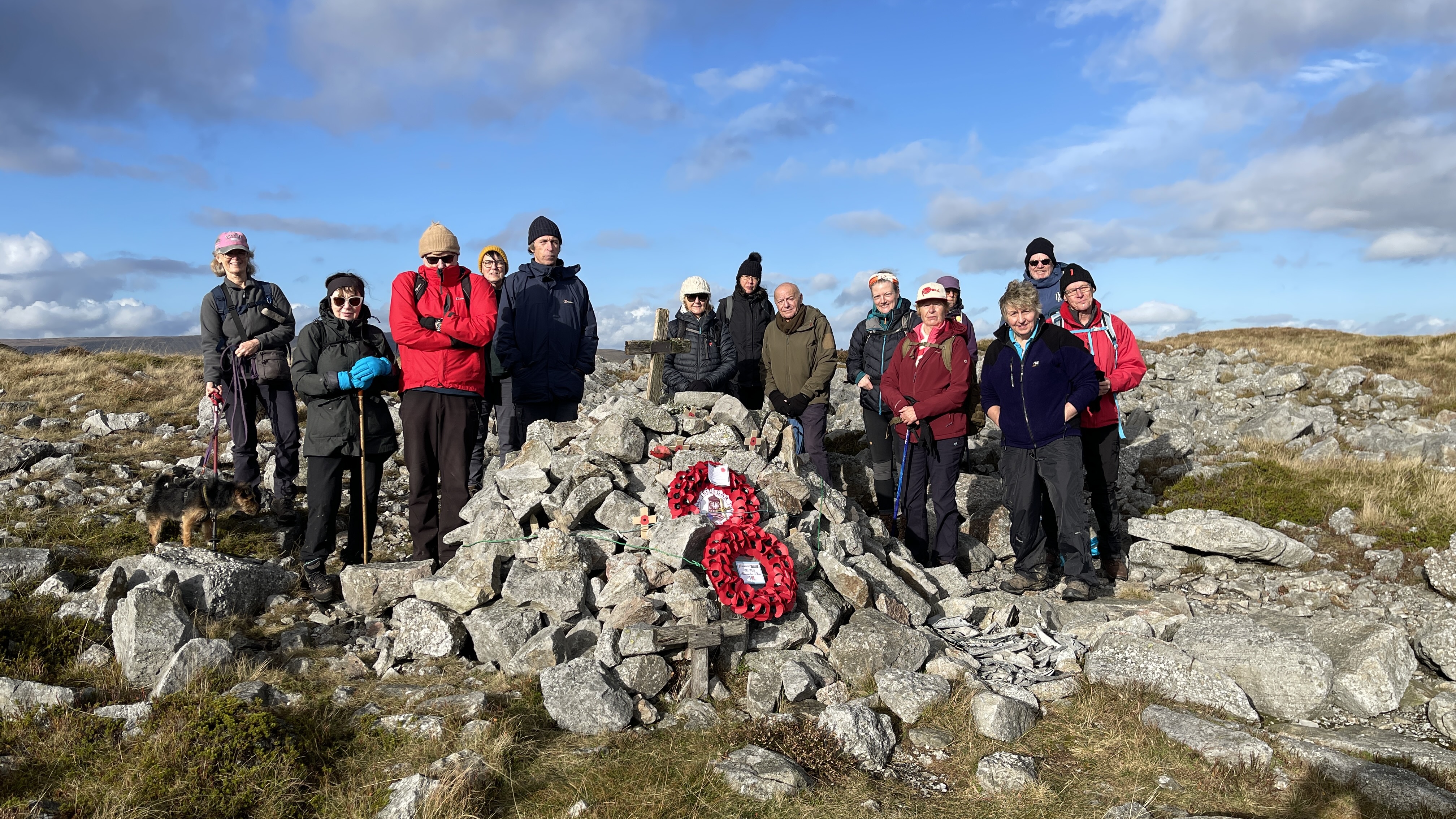 Despite the chill westerly breeze, 15 lucky ramblers (including welcome visitors Karen, John and newest Merthyr Valley Ramblers member Elaine) met in bright sunshine and blue skies at the start of our 9 1/4mile walk in Trefil today. Also waiting at Trefil was the annual memorial trip to the bomber site organised by Tredegar council. We set off up the road at a good pace passing the duke’s table and swung round by the woods to have our first cuppa. It was then through the quarried road and more tracks, finally going cross-country to the bomber memorial. We held a simple service there and laid a wreath (donated by Maureen), then had lunch. Despite the magnificent views and still bright sunshine, it was too cold to hang around so we made our back the same way to Trefil. A marvellous walk led by Morfedd and Rob, magnificent views of Pen Y Fan and the sugarloaf and great company which was the icing on the cake. And to cap it all, it poured down on the way home!! Thanks all!