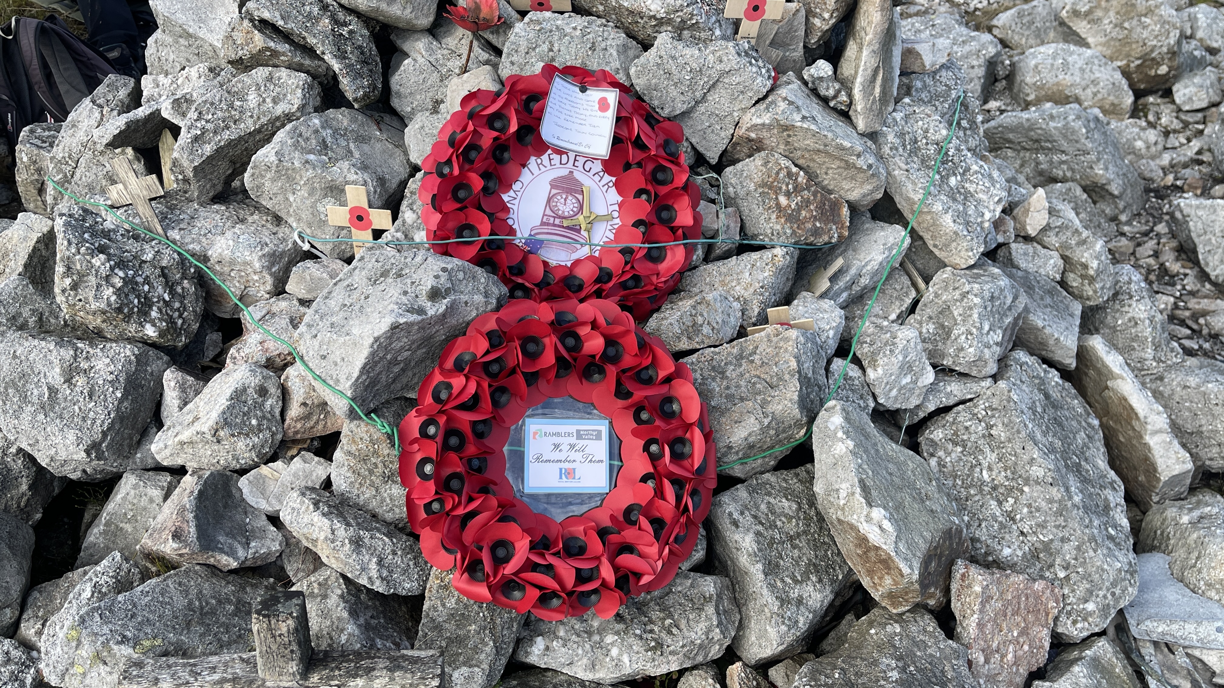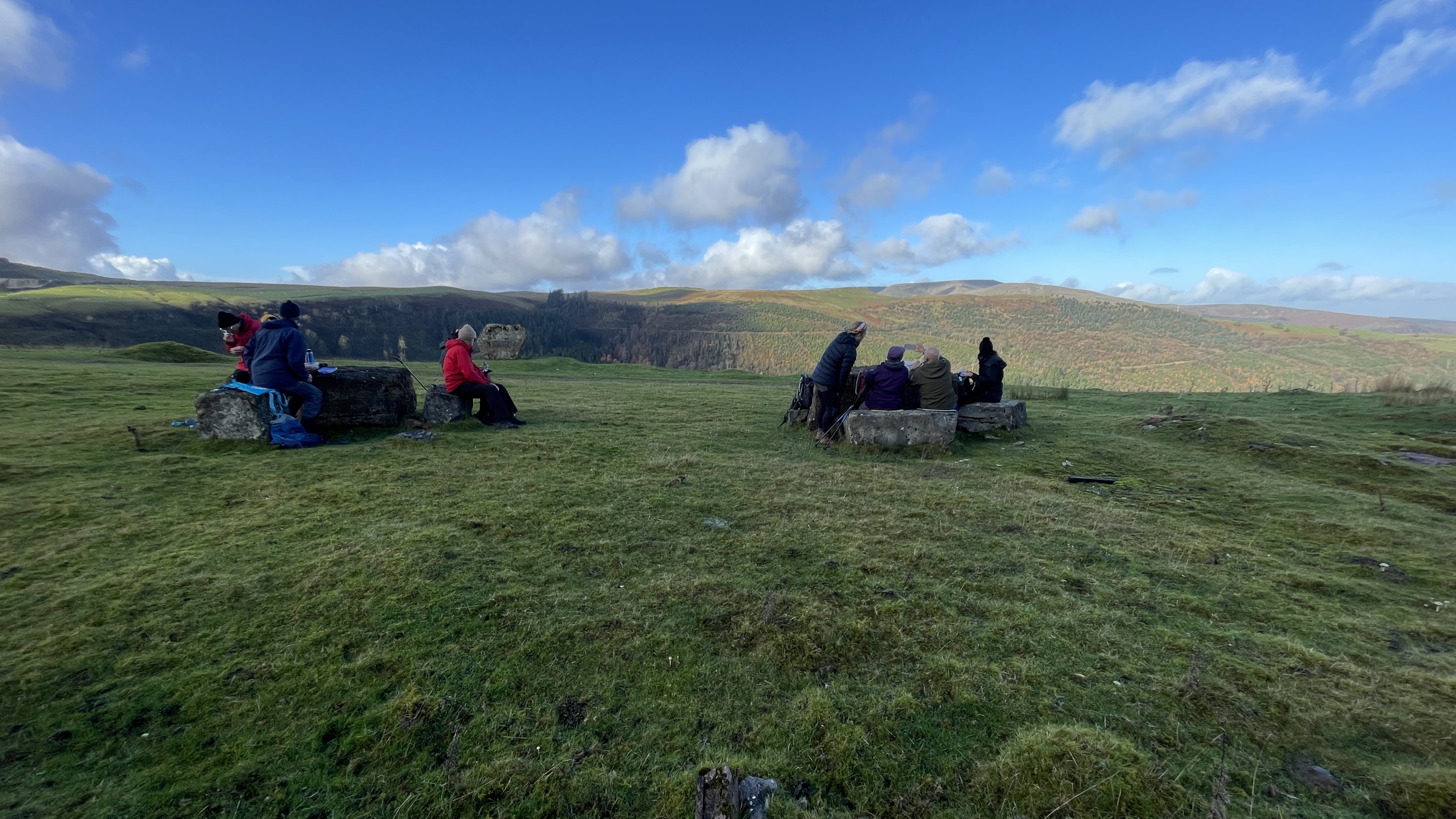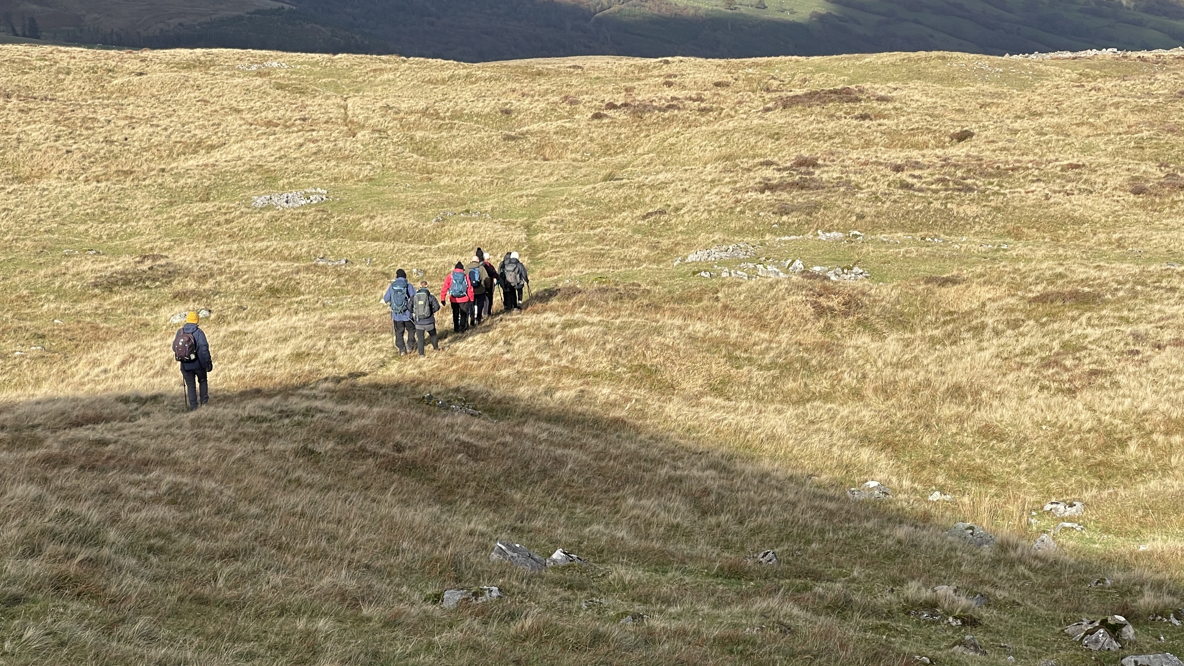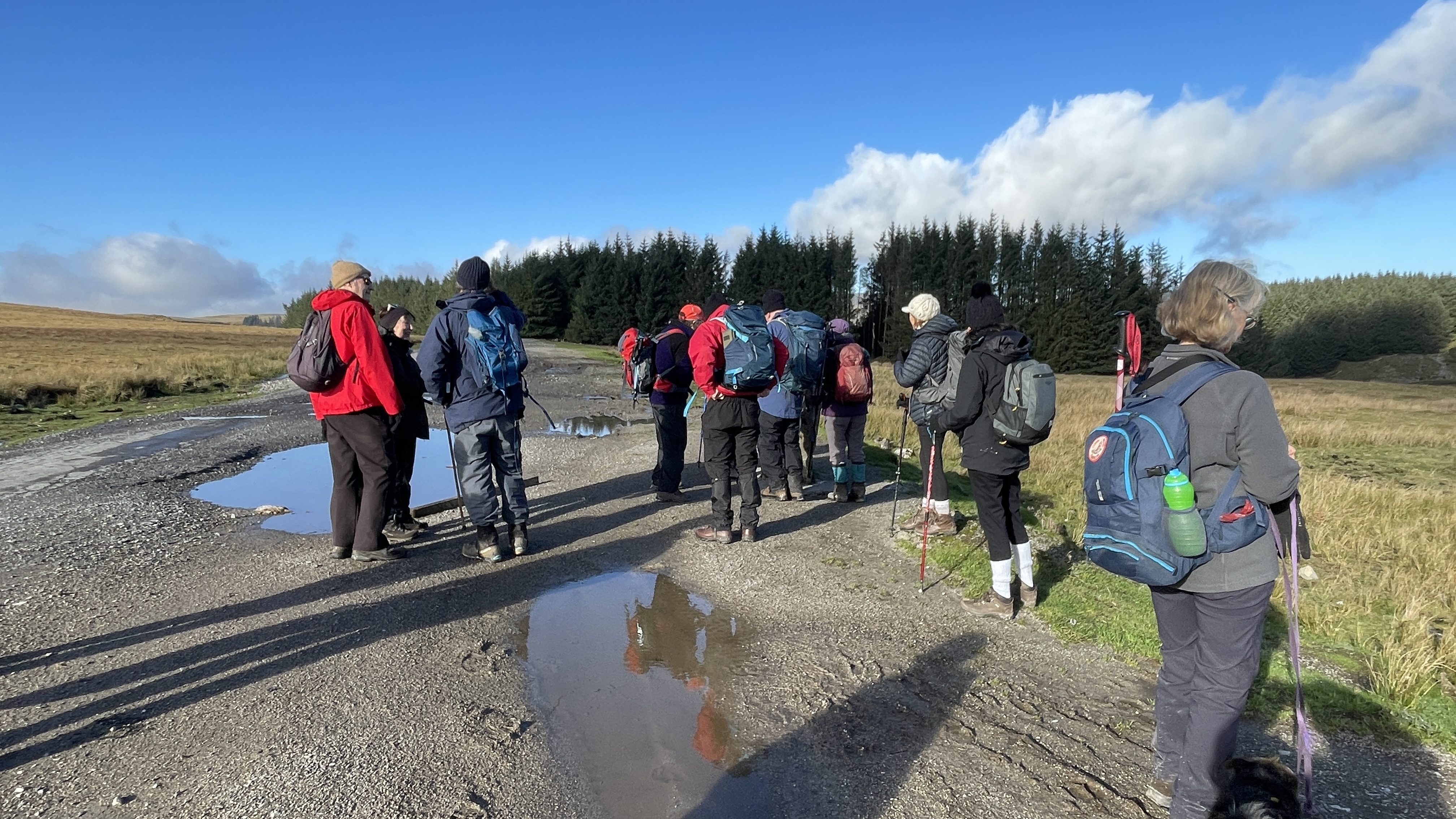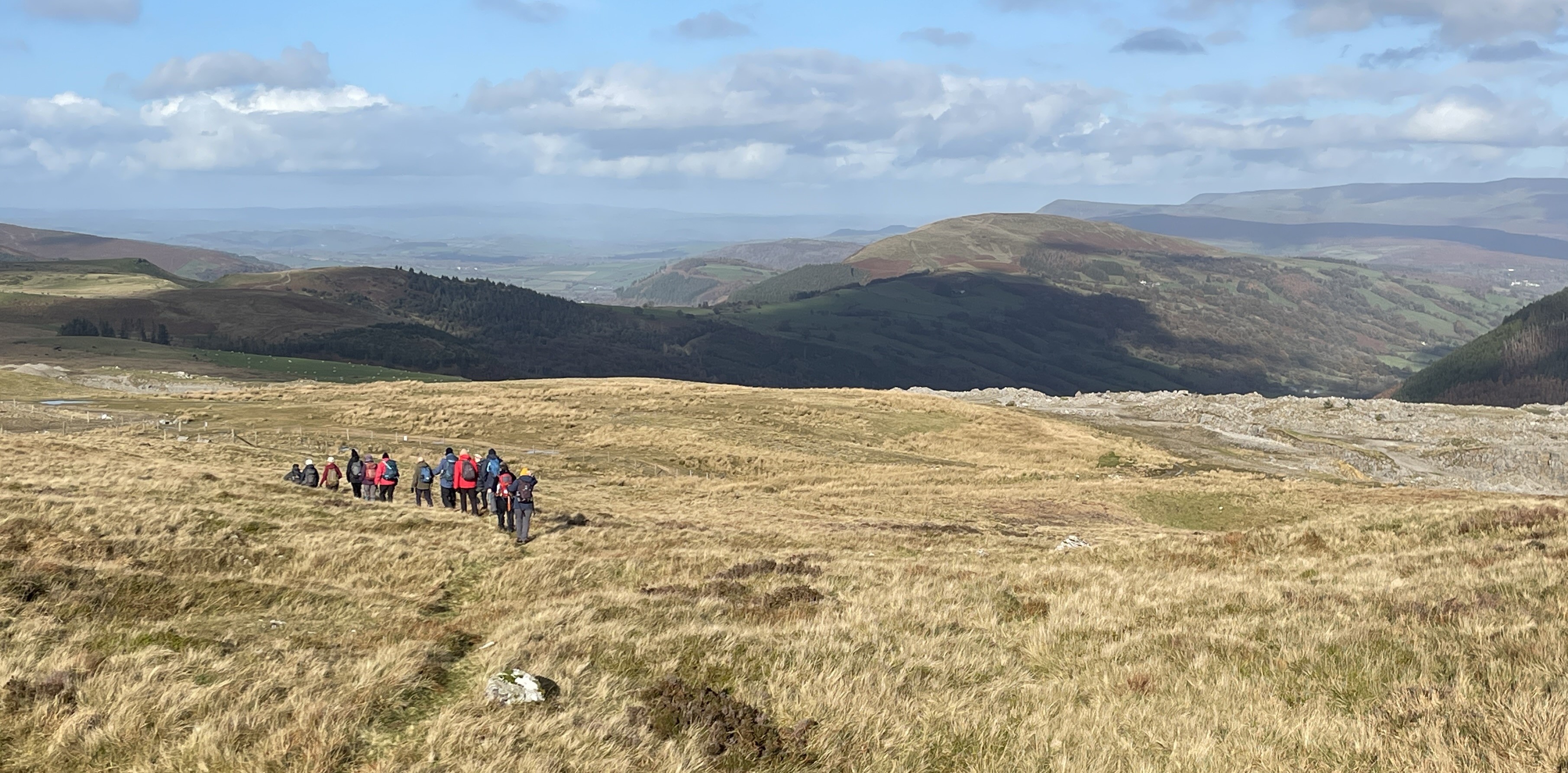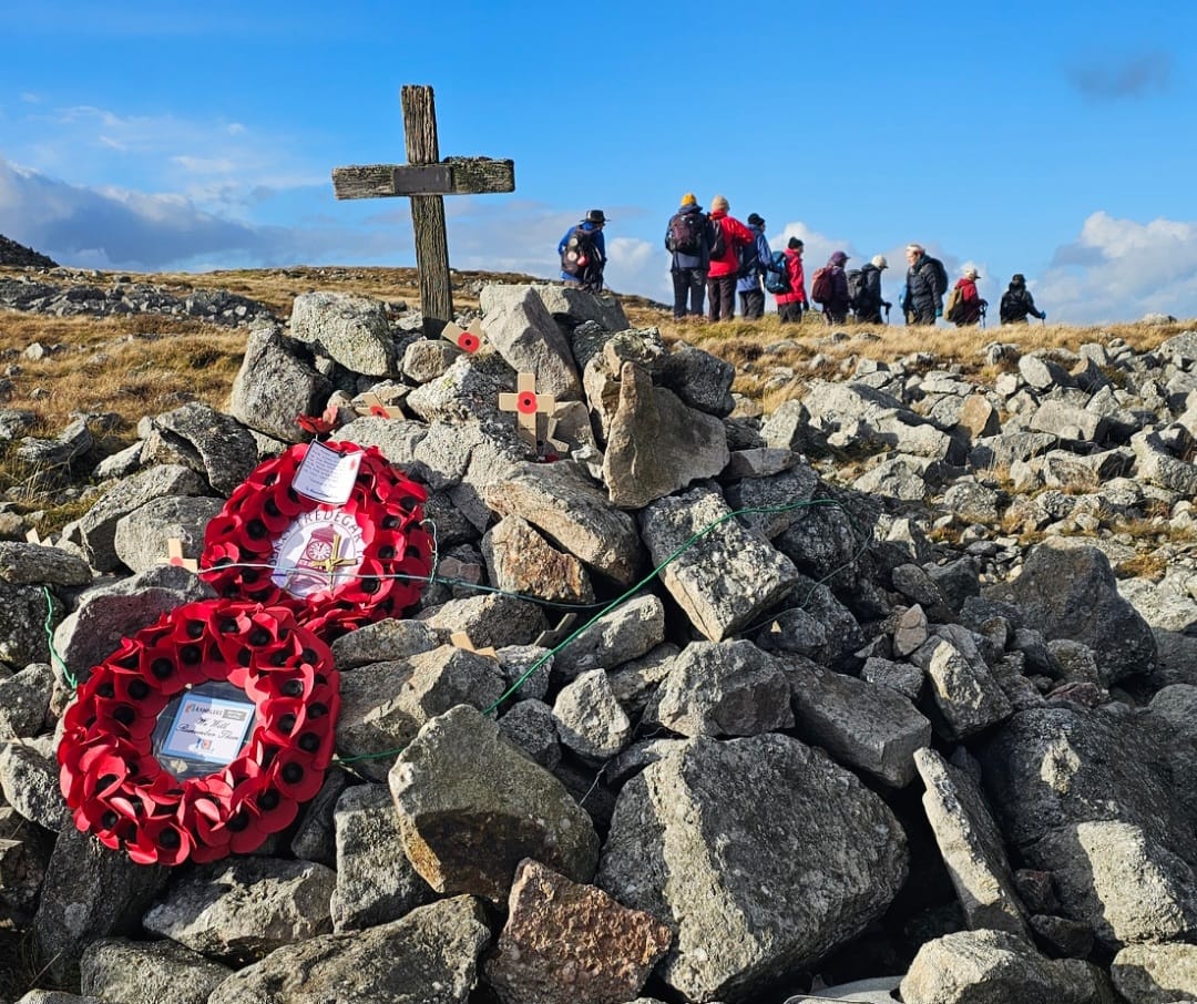 Despite the chill westerly breeze, 15 lucky ramblers (including welcome visitors Karen, John and newest Merthyr Valley Ramblers member Elaine) met in bright sunshine and blue skies at the start of our 9 1/4mile walk in Trefil today. Also waiting at Trefil was the annual memorial trip to the bomber site organised by Tredegar council. We set off up the road at a good pace passing the duke’s table and swung round by the woods to have our first cuppa. It was then through the quarried road and more tracks, finally going cross-country to the bomber memorial. We held a simple service there and laid a wreath (donated by Maureen), then had lunch. Despite the magnificent views and still bright sunshine, it was too cold to hang around so we made our back the same way to Trefil. A marvellous walk led by Morfedd and Rob, magnificent views of Pen Y Fan and the sugarloaf and great company which was the icing on the cake. And to cap it all, it poured down on the way home!! Thanks all!