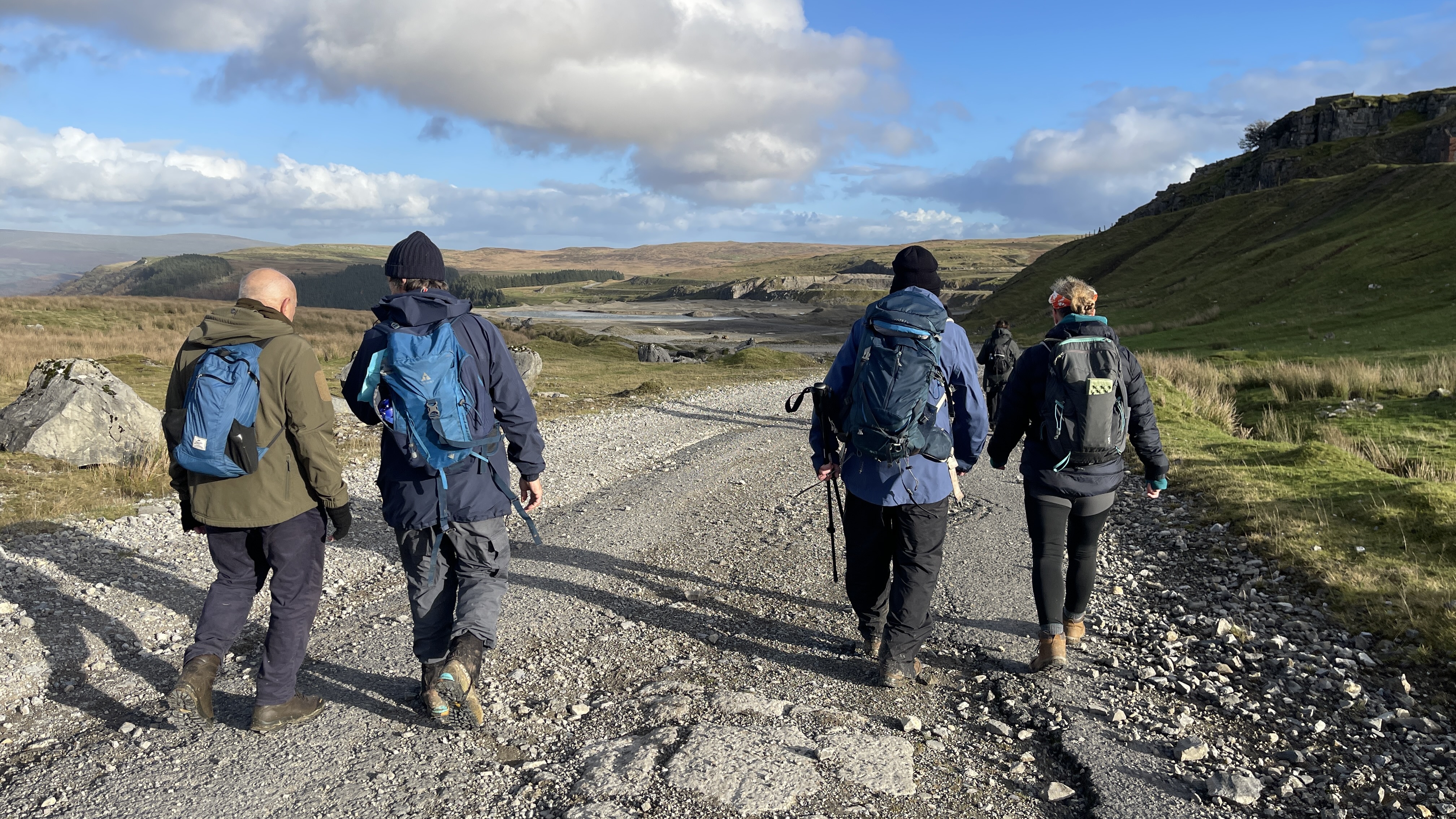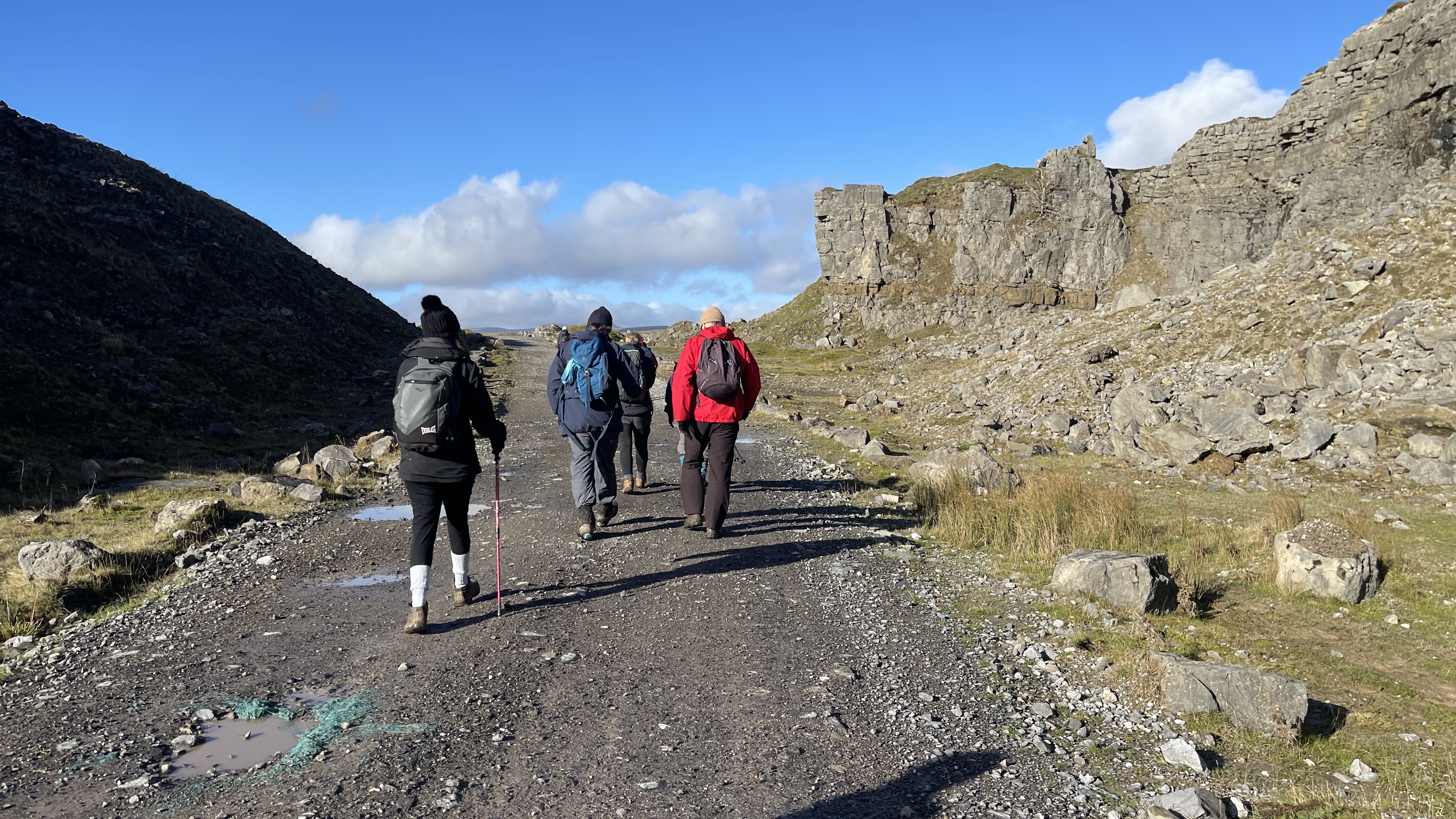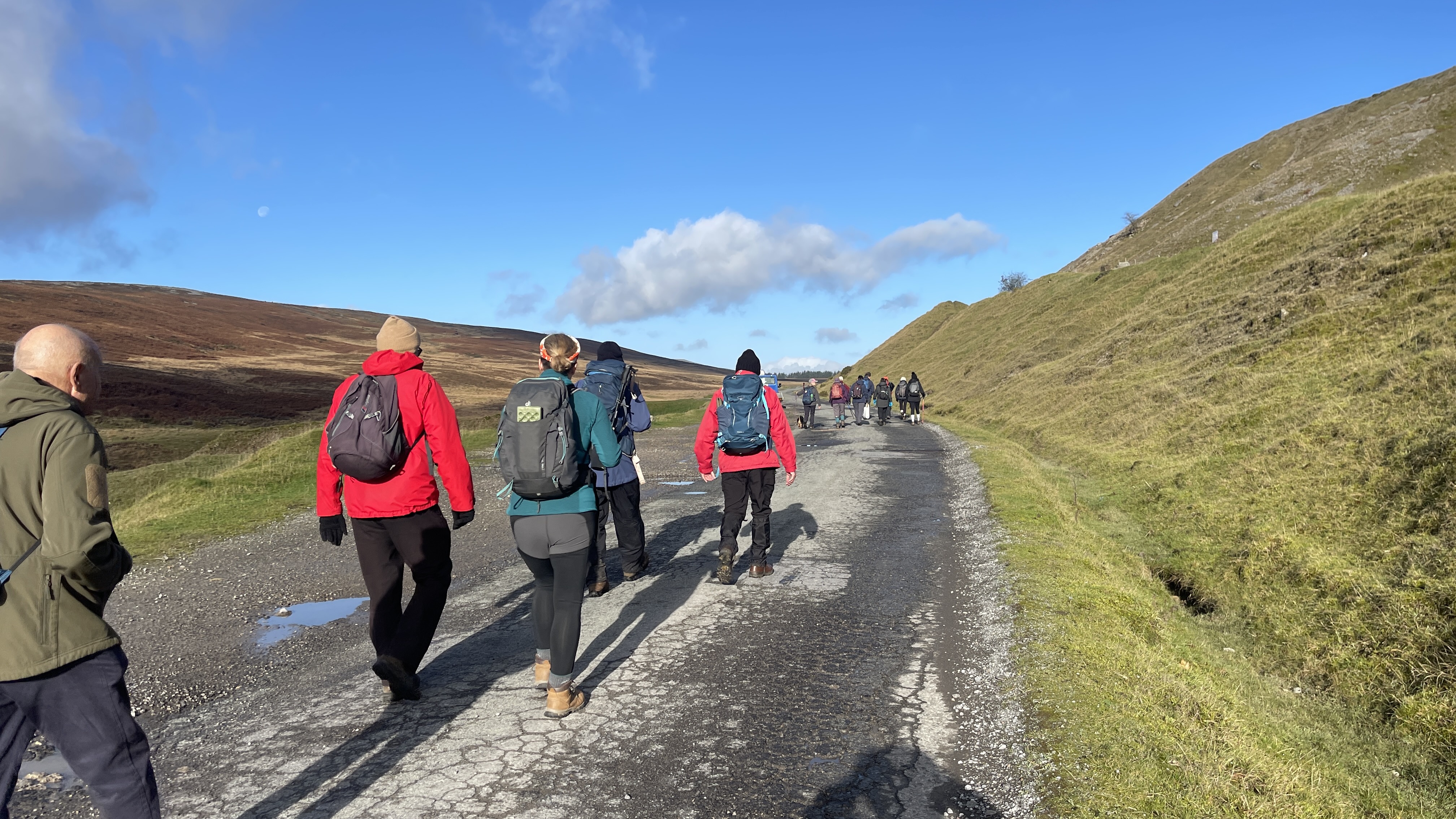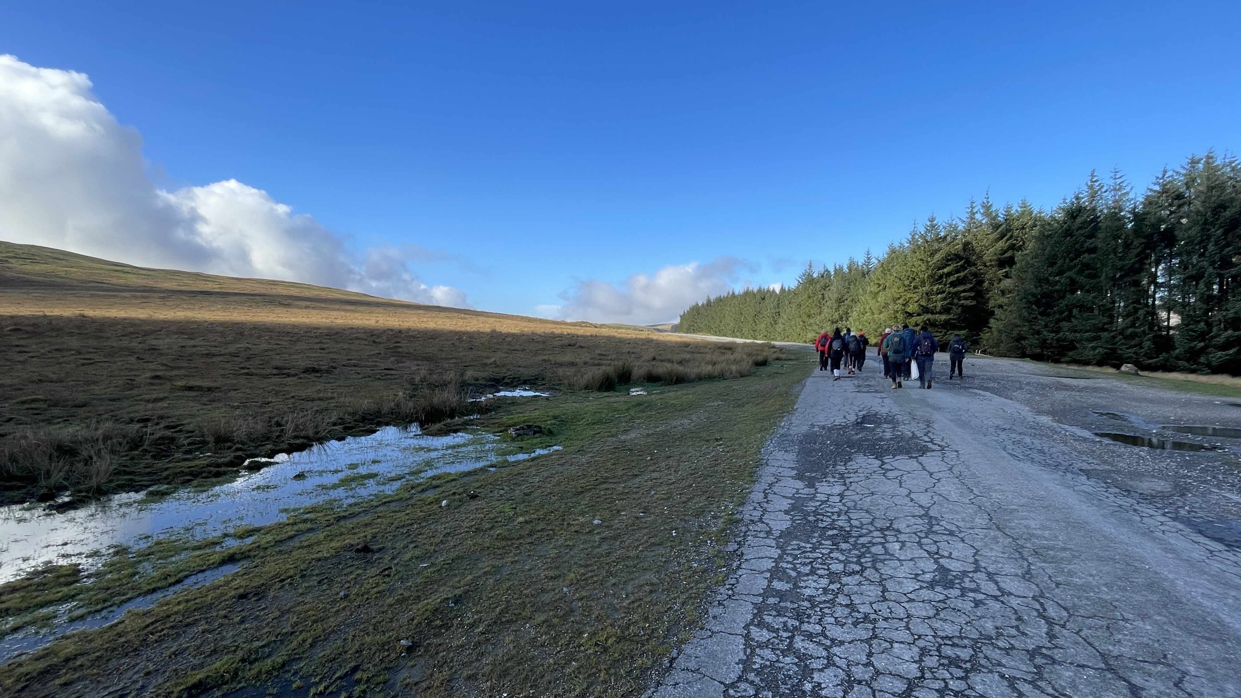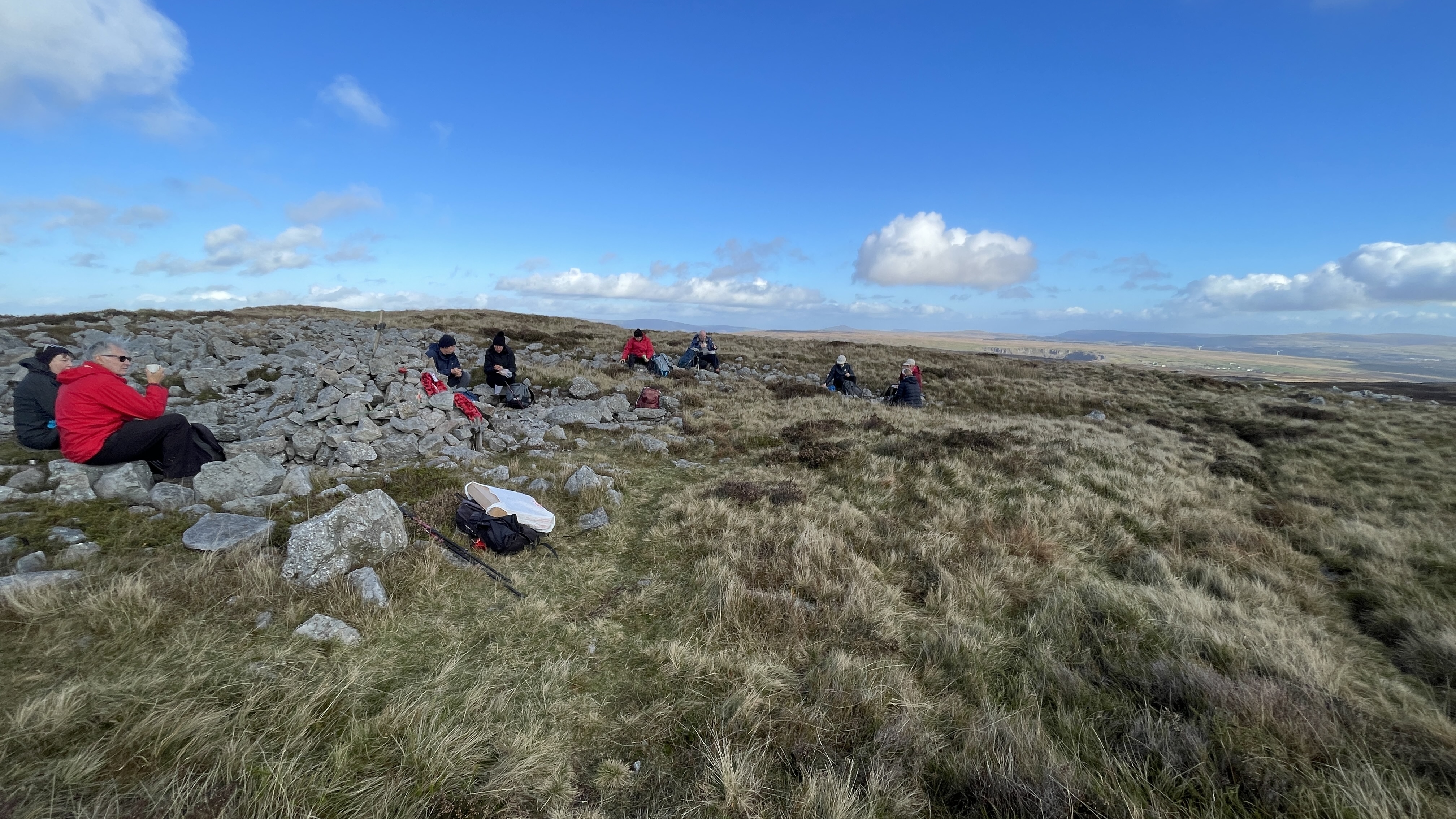 Despite the chill westerly breeze, 15 lucky ramblers (including welcome visitors Karen, John and newest Merthyr Valley Ramblers member Elaine) met in bright sunshine and blue skies at the start of our 9 1/4mile walk in Trefil today. Also waiting at Trefil was the annual memorial trip to the bomber site organised by Tredegar council. We set off up the road at a good pace passing the duke’s table and swung round by the woods to have our first cuppa. It was then through the quarried road and more tracks, finally going cross-country to the bomber memorial. We held a simple service there and laid a wreath (donated by Maureen), then had lunch. Despite the magnificent views and still bright sunshine, it was too cold to hang around so we made our back the same way to Trefil. A marvellous walk led by Morfedd and Rob, magnificent views of Pen Y Fan and the sugarloaf and great company which was the icing on the cake. And to cap it all, it poured down on the way home!! Thanks all!
